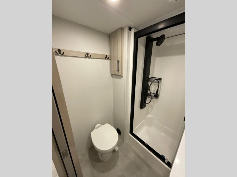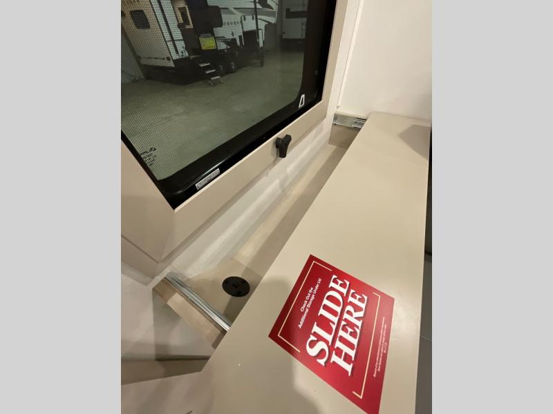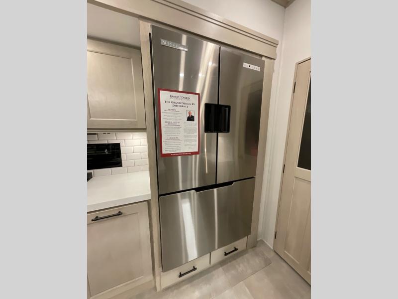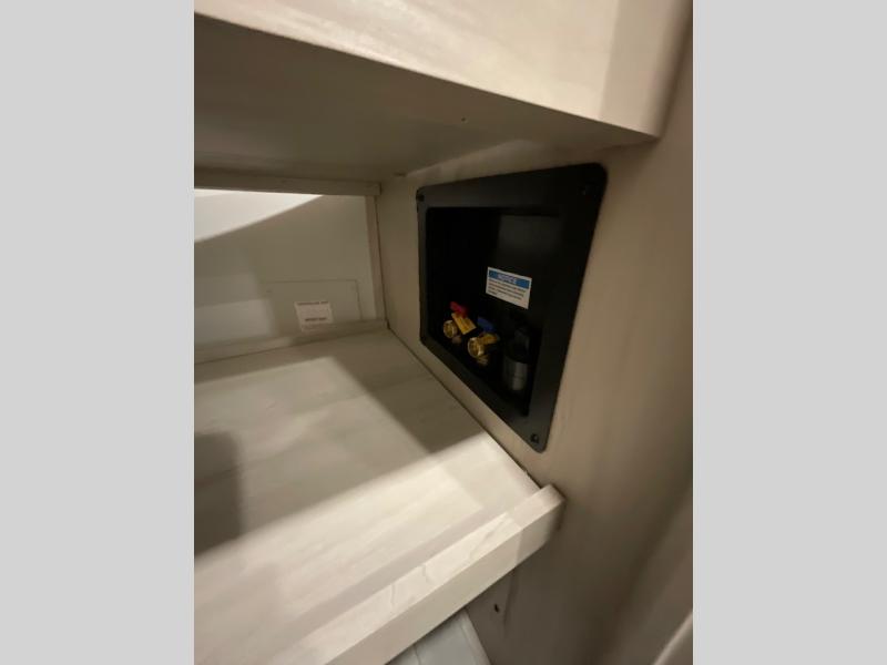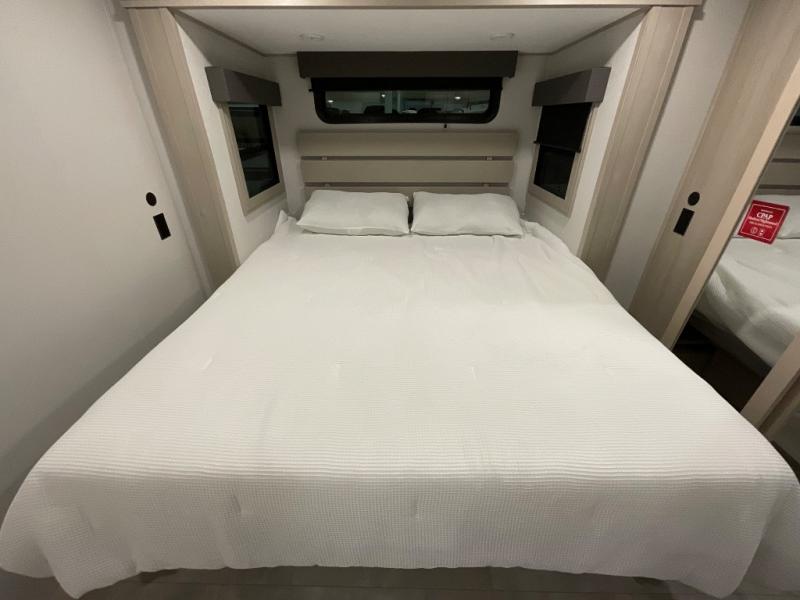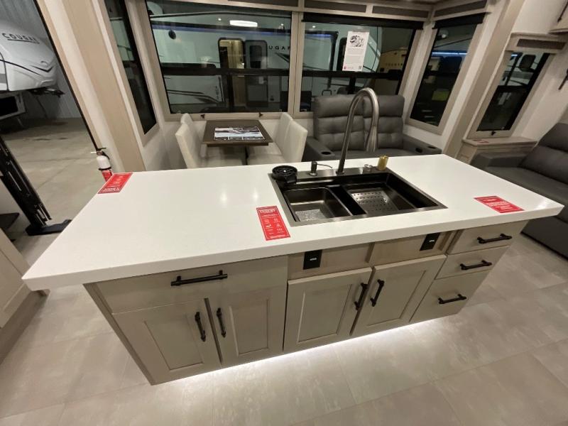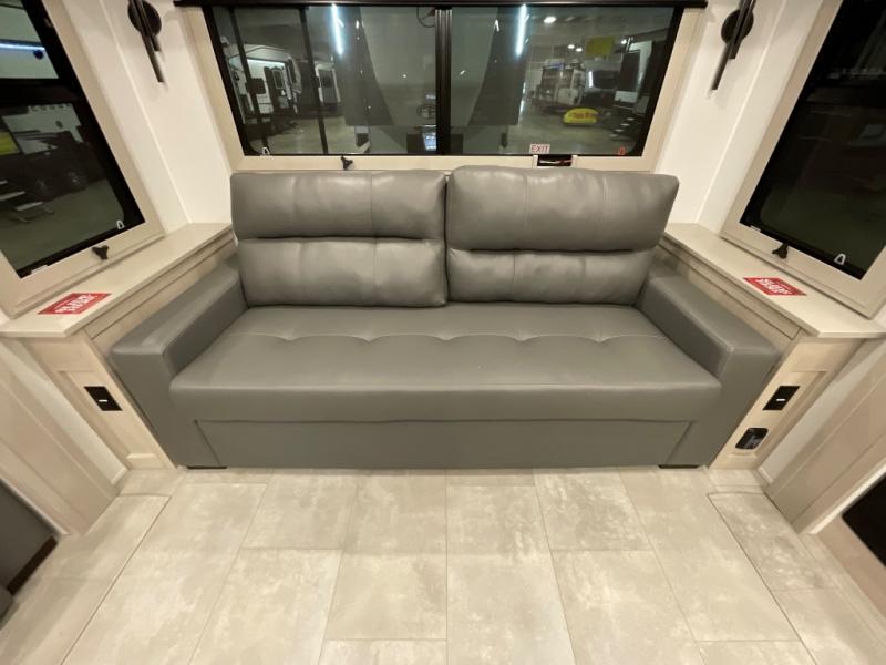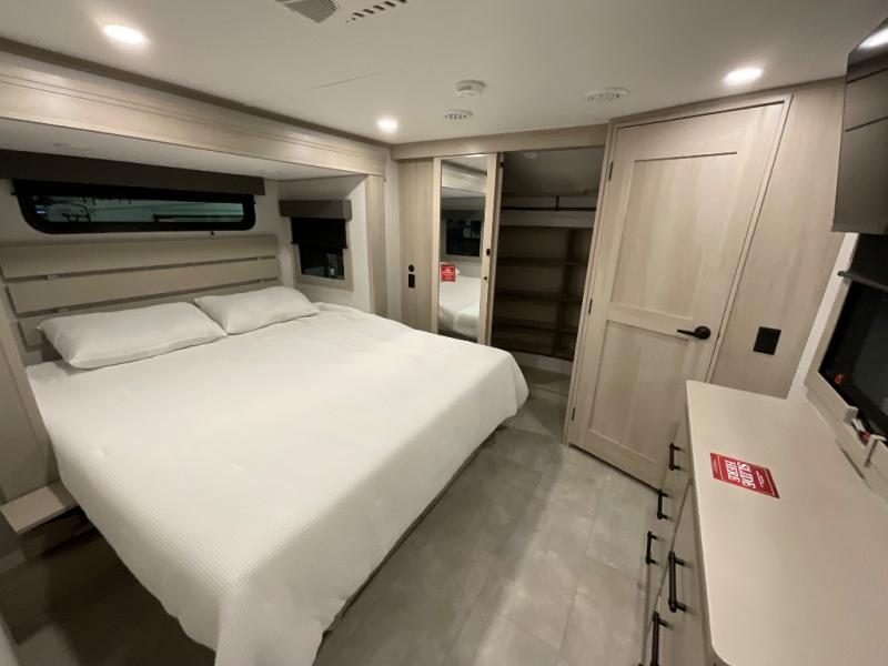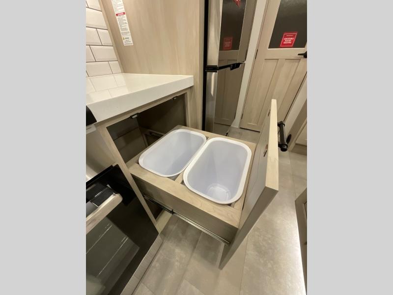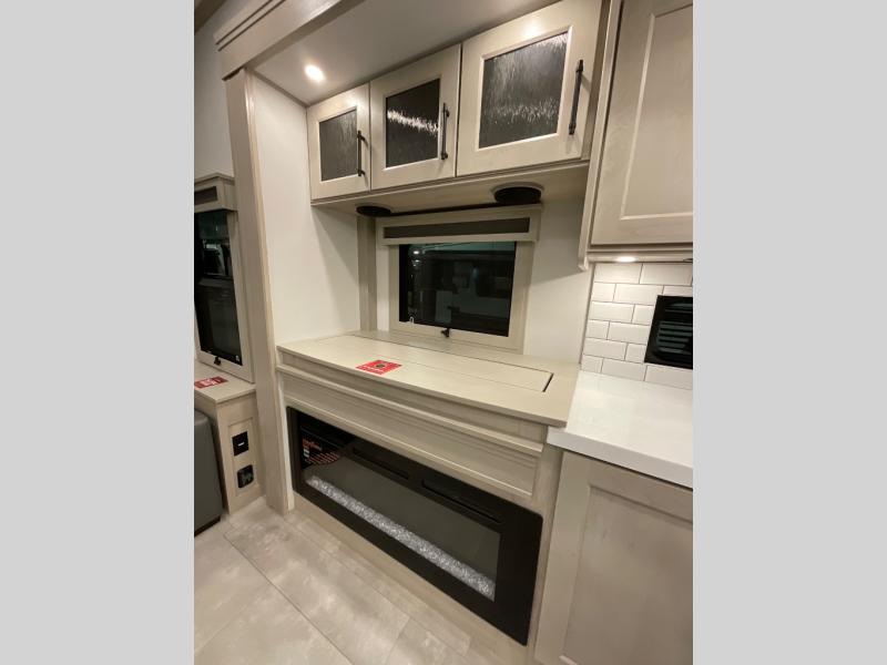 Traveling for long periods at a time is made easy with this gourmet kitchen that can feed your entire group a holiday meal! The professional-grade stainless steel cooktop with a built-in oven, microwave, 12V 20 cu. ft. refrigerator, and a kitchen island offers everything you will need to enjoy cooking for your family and guests. There is abundant storage throughout multiple overhead cabinets, a kitchen pantry and hutch, a bath linen cabinet for your towels, and in the front master bedroom which features a large closet. In the bedroom there is also a queen bed slide for added space to sleep comfortable at night, or you may choose an optional king bed if you enjoy more space. You will also find a closet with washer/dryer prep, large wardrobe, a clothes hamper plus a slide top dresser. Two nice awnings will provide outdoor living space keeping you protected from the sun and rain, and you can add an optional pull-out kitchen to enjoy convenient cooking outdoors as well.