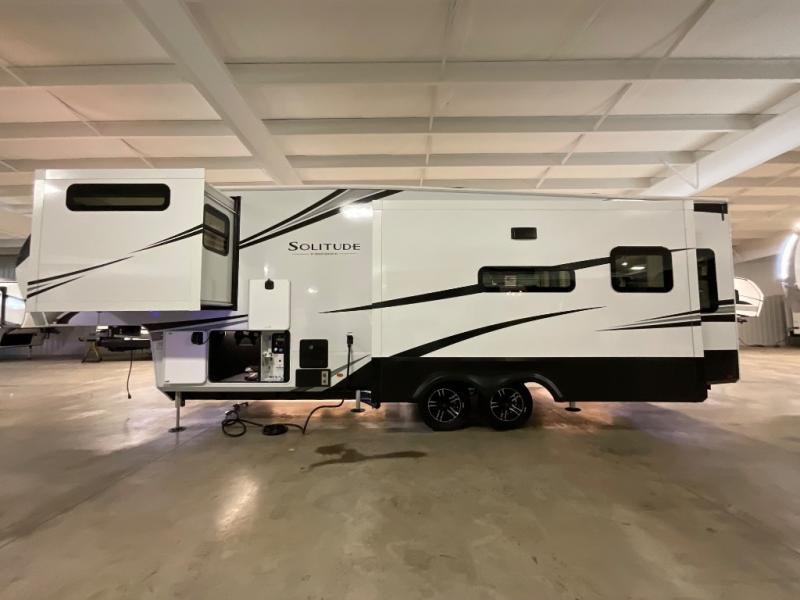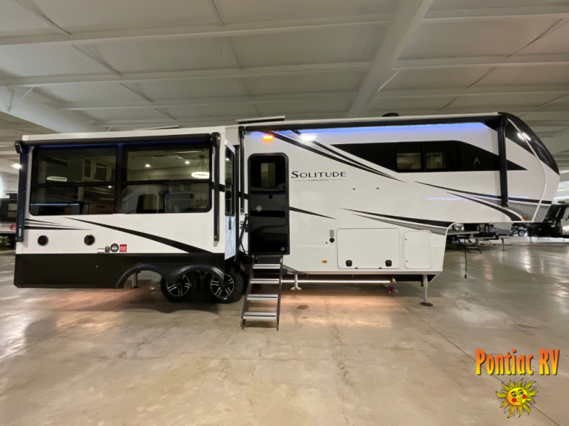 Each Solitude fifth wheel by Grand Design features a 101" wide-body construction, heavy duty 8,000 lb. axles, frameless tinted windows, and high-gloss gel coat sidewalls. You can camp year around thanks to the Weather-Tek Package that includes a 35K BTU high-capacity furnace, an all-in-one enclosed and heated utility center, and a fully enclosed underbelly with heated tanks and storage. Inside, you'll love the premium roller shades, hardwood cabinet doors, solid surface countertops, plus residential finishes throughout to make you truly feel at home. Each model also includes a MORryde CRE3000 suspension system, self adjusting brakes, and a MORryde pin box that will provide smooth towing from home to campground. Affordable luxury is possible with the Solitude fifth wheels; choose yours today!
