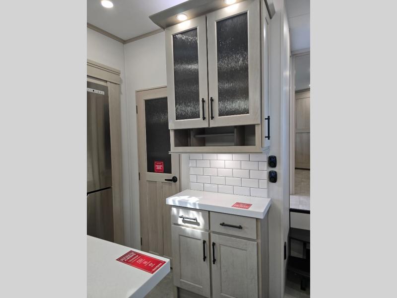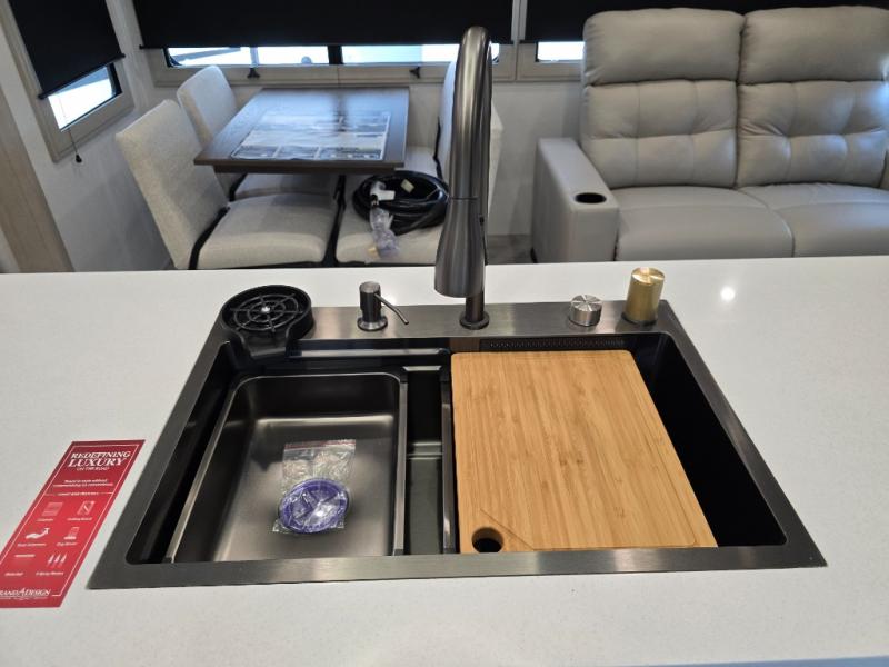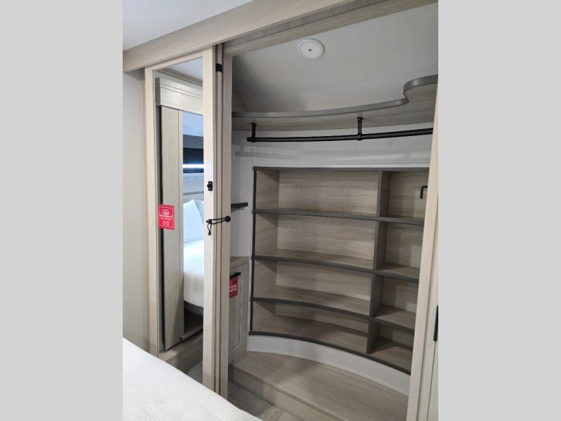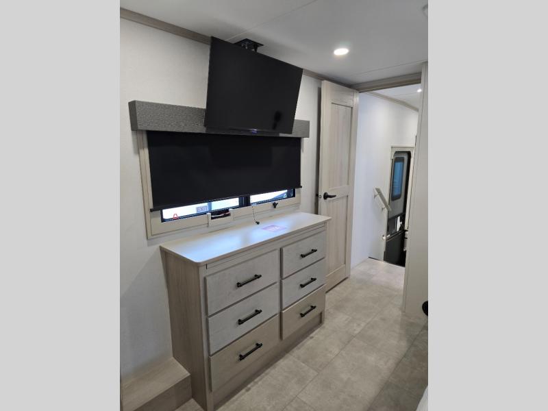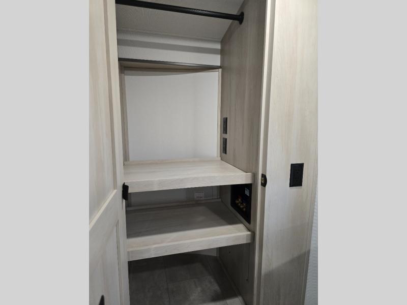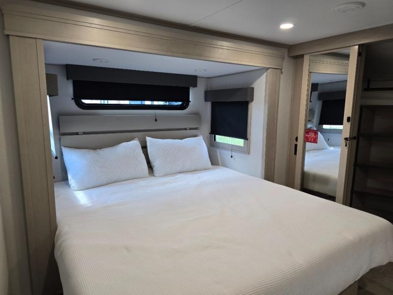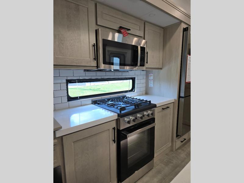 Traveling for long periods at a time is made easy with this gourmet kitchen that can feed your entire group a holiday meal! The professional-grade stainless steel cooktop with a built-in oven, microwave, 12V 20 cu. ft. refrigerator, and a kitchen island offers everything you will need to enjoy cooking for your family and guests. There is abundant storage throughout multiple overhead cabinets, a kitchen pantry and hutch, a bath linen cabinet for your towels, and in the front master bedroom which features a large closet. In the bedroom there is also a queen bed slide for added space to sleep comfortable at night, or you may choose an optional king bed if you enjoy more space. You will also find a closet with washer/dryer prep, large wardrobe, a clothes hamper plus a slide top dresser. Two nice awnings will provide outdoor living space keeping you protected from the sun and rain, and you can add an optional pull-out kitchen to enjoy convenient cooking outdoors as well.