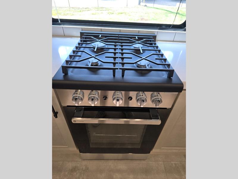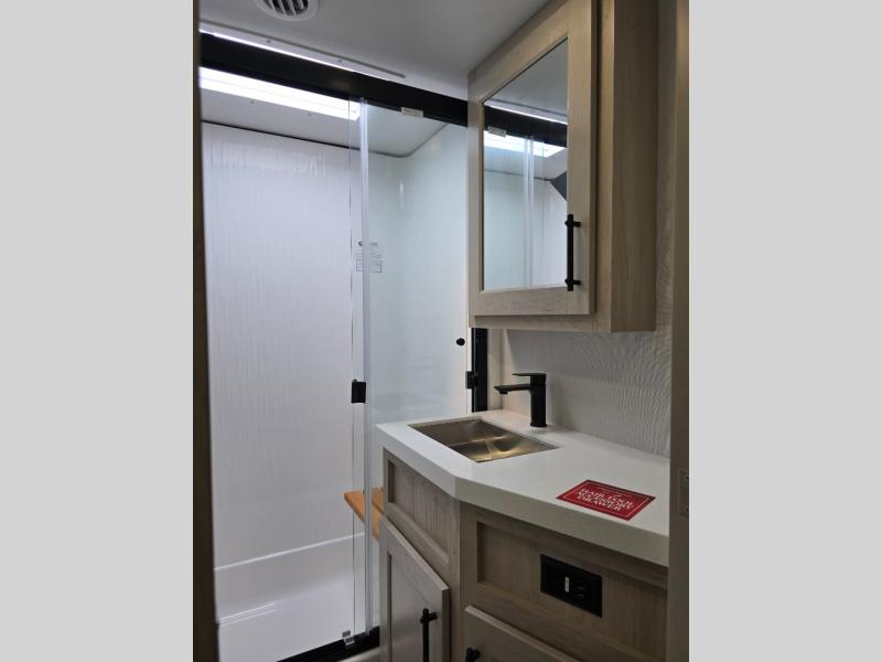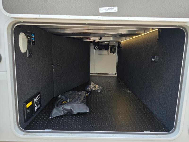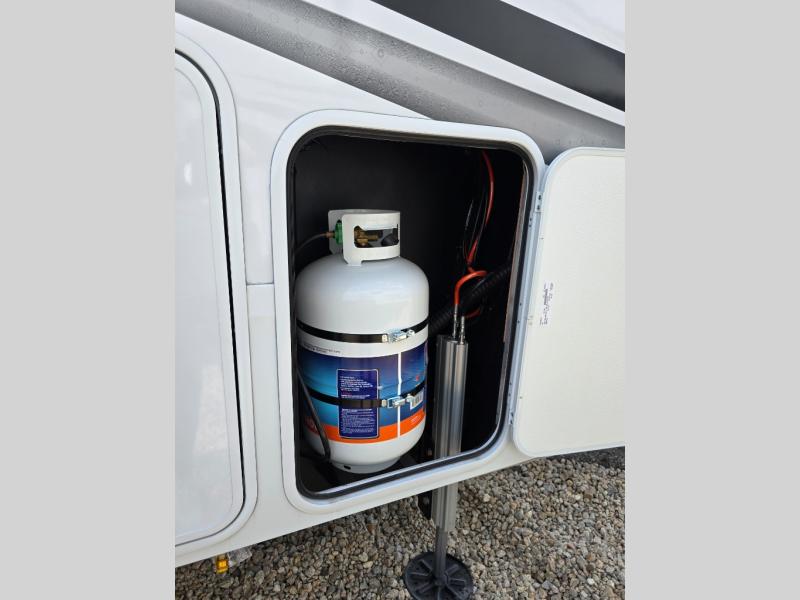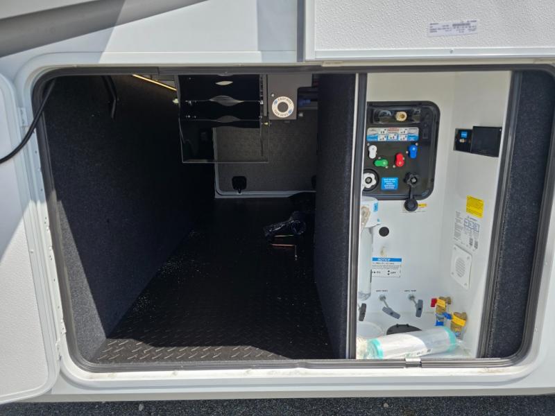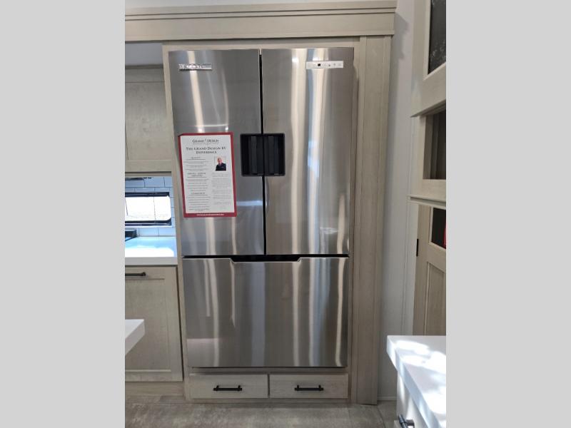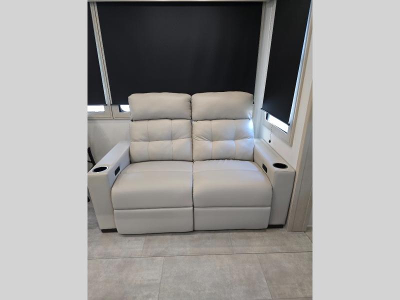 Traveling for long periods at a time is made easy with this gourmet kitchen that can feed your entire group a holiday meal! The professional-grade stainless steel cooktop with a built-in oven, microwave, 12V 20 cu. ft. refrigerator, and a kitchen island offers everything you will need to enjoy cooking for your family and guests. There is abundant storage throughout multiple overhead cabinets, a kitchen pantry and hutch, a bath linen cabinet for your towels, and in the front master bedroom which features a large closet. In the bedroom there is also a queen bed slide for added space to sleep comfortable at night, or you may choose an optional king bed if you enjoy more space. You will also find a closet with washer/dryer prep, large wardrobe, a clothes hamper plus a slide top dresser. Two nice awnings will provide outdoor living space keeping you protected from the sun and rain, and you can add an optional pull-out kitchen to enjoy convenient cooking outdoors as well.
