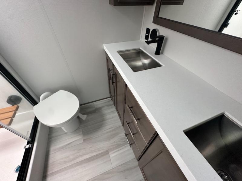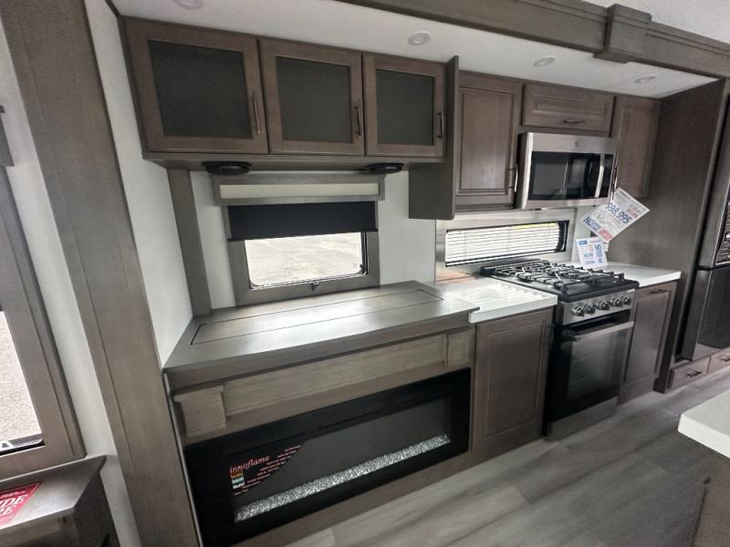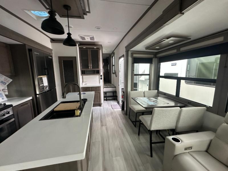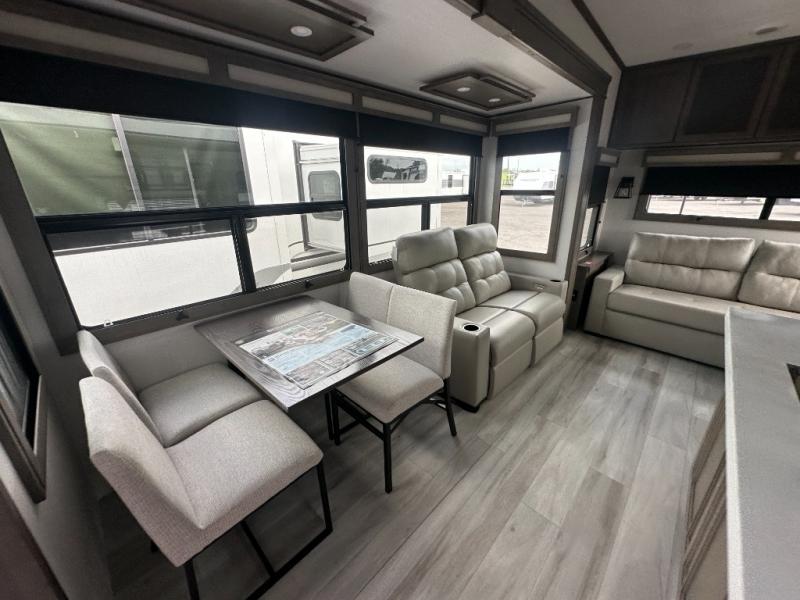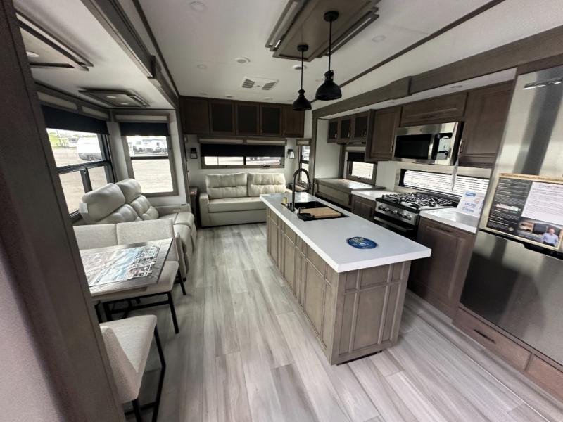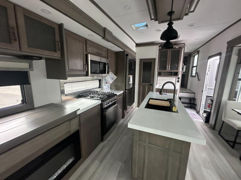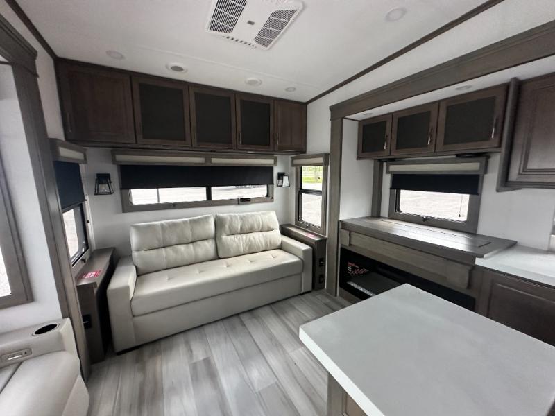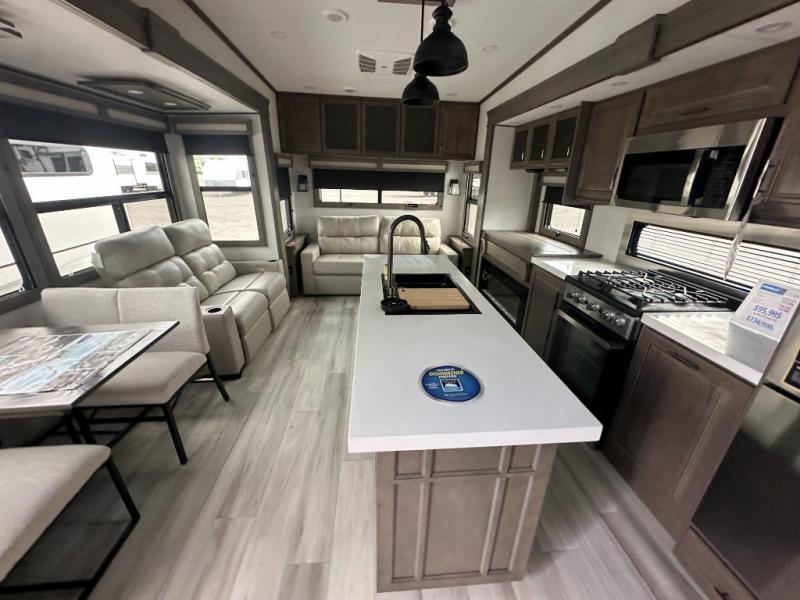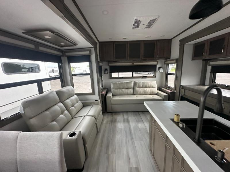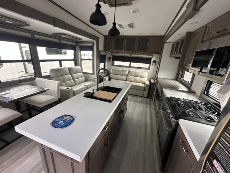 Are you looking to upgrade from a travel trailer to a fifth wheel? If so, this model will be perfect for you! Once you arrive at the campground, you can unload your gear from the pass-through storage, put out the two power awnings, then relax with a cold drink. Inside, you can kick your feet up on the theater seating, play a game at the free-standing dinette, or relax on the tri-fold sofa. The chef of your group will have a kitchen island with a Smart sink, dishwasher prep if you want the option to make cleaning up easier, plus a spacious 20 cu. ft. 12V refrigerator. There is also a 24" residential oven, convenient pull-out trash cans, plus a pantry and a hutch for storage galore! Having two bath sinks in the full bath is sure to be a big convenience when getting ready for bed, and the queen bed slide out (king bed optional) in the front bedroom will provide a great night's rest. You will also find a front wardrobe, a slide-top dresser with an LED TV, plus washer/dryer prep!