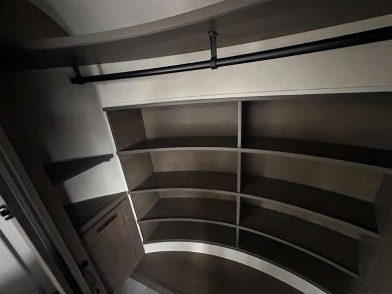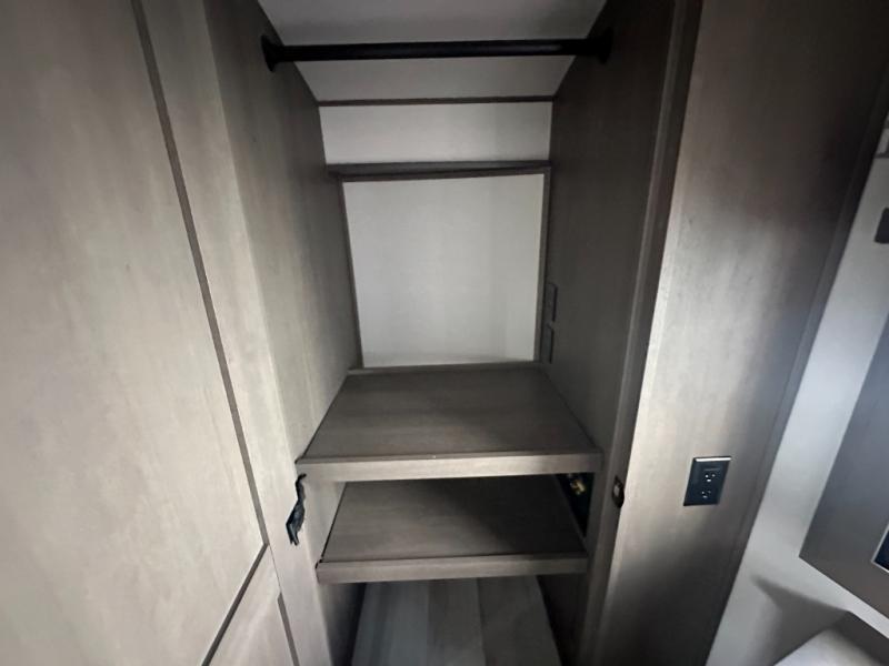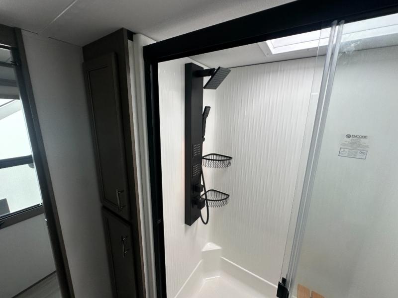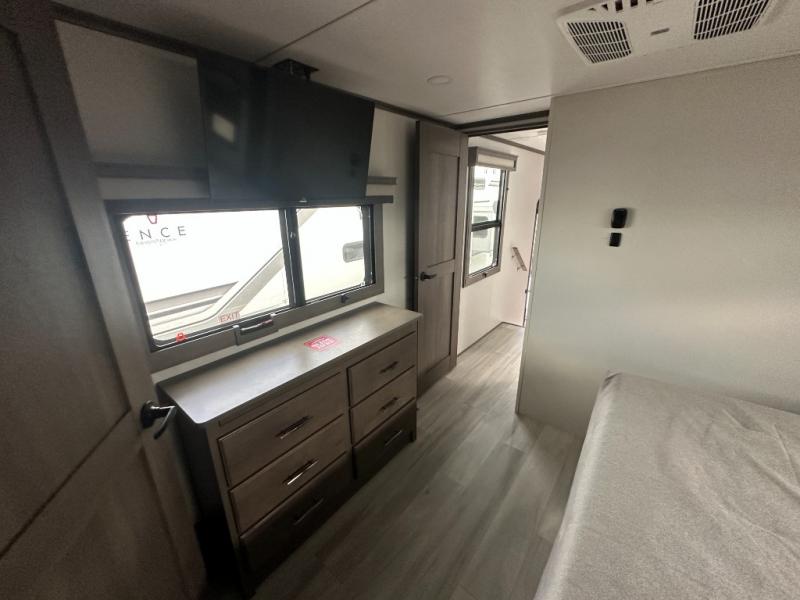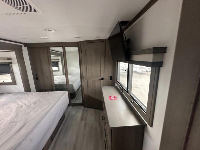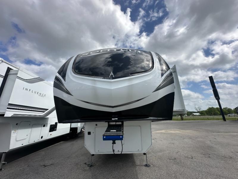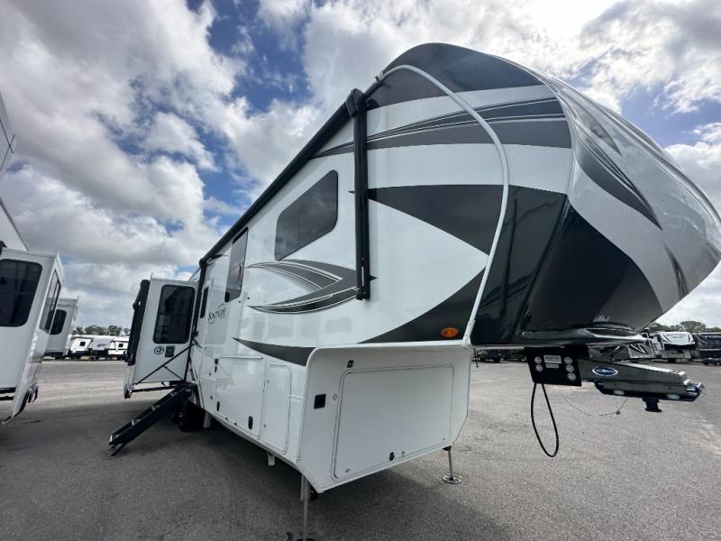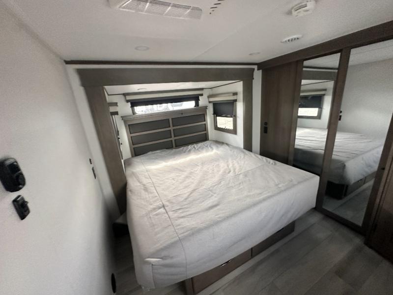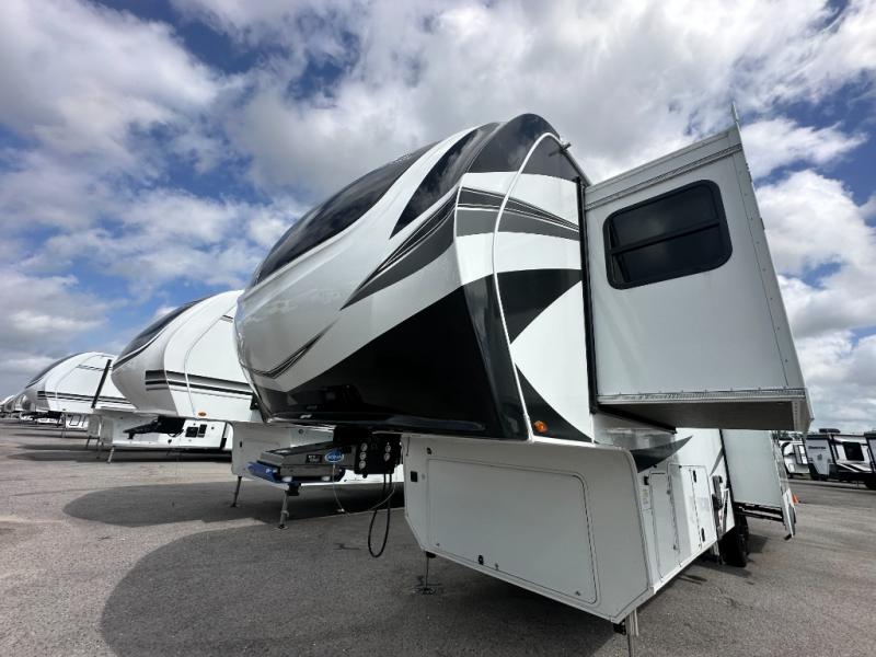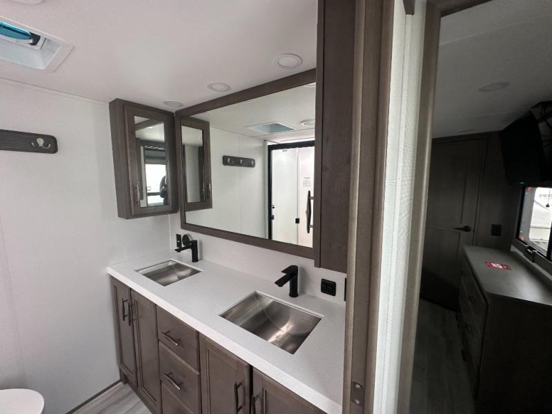 Are you looking to upgrade from a travel trailer to a fifth wheel? If so, this model will be perfect for you! Once you arrive at the campground, you can unload your gear from the pass-through storage, put out the two power awnings, then relax with a cold drink. Inside, you can kick your feet up on the theater seating, play a game at the free-standing dinette, or relax on the tri-fold sofa. The chef of your group will have a kitchen island with a Smart sink, dishwasher prep if you want the option to make cleaning up easier, plus a spacious 20 cu. ft. 12V refrigerator. There is also a 24" residential oven, convenient pull-out trash cans, plus a pantry and a hutch for storage galore! Having two bath sinks in the full bath is sure to be a big convenience when getting ready for bed, and the queen bed slide out (king bed optional) in the front bedroom will provide a great night's rest. You will also find a front wardrobe, a slide-top dresser with an LED TV, plus washer/dryer prep!