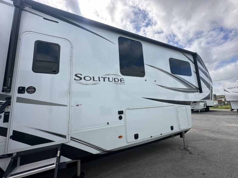 Each Solitude fifth wheel by Grand Design features a 101" wide-body construction, heavy duty 7,000 lb. axles, frameless tinted windows, and high-gloss gel coat sidewalls. You can camp year around thanks to the Weather-Tek Package that includes a 35K BTU high-capacity furnace, an all-in-one enclosed and heated utility center, and a fully enclosed underbelly with heated tanks and storage. Inside, you'll love the premium roller shades, hardwood cabinet doors, solid surface countertops and sinks, plus residential finishes throughout to make you truly feel at home. Each model also includes a MORryde CRE3000 suspension system, self adjusting brakes, and a MORryde pin box that will provide smooth towing from home to campground. Affordable luxury is possible with the Solitude fifth wheels; choose yours today!