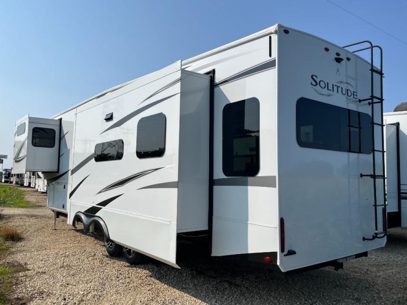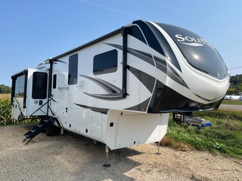 Each Solitude fifth wheel by Grand Design features a 101" wide-body construction, heavy duty 8,000 lb. axles, frameless tinted windows, and high-gloss gel coat sidewalls. You can camp year around thanks to the Weather-Tek Package that includes a 35K BTU high-capacity furnace, an all-in-one enclosed and heated utility center, and a fully enclosed underbelly with heated tanks and storage. Inside, you'll love the premium roller shades, hardwood cabinet doors, solid surface countertops, plus residential finishes throughout to make you truly feel at home. Each model also includes a MORryde CRE3000 suspension system, self adjusting brakes, and a MORryde pin box that will provide smooth towing from home to campground. Affordable luxury is possible with the Solitude fifth wheels; choose yours today!