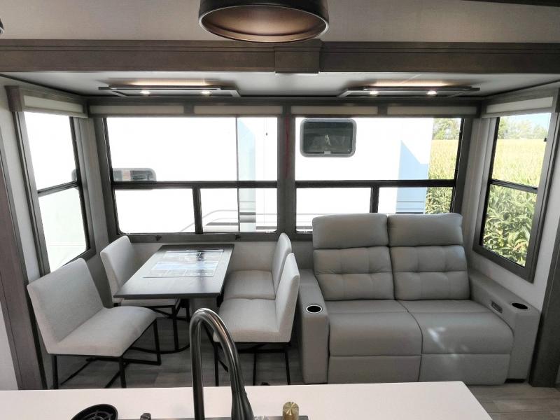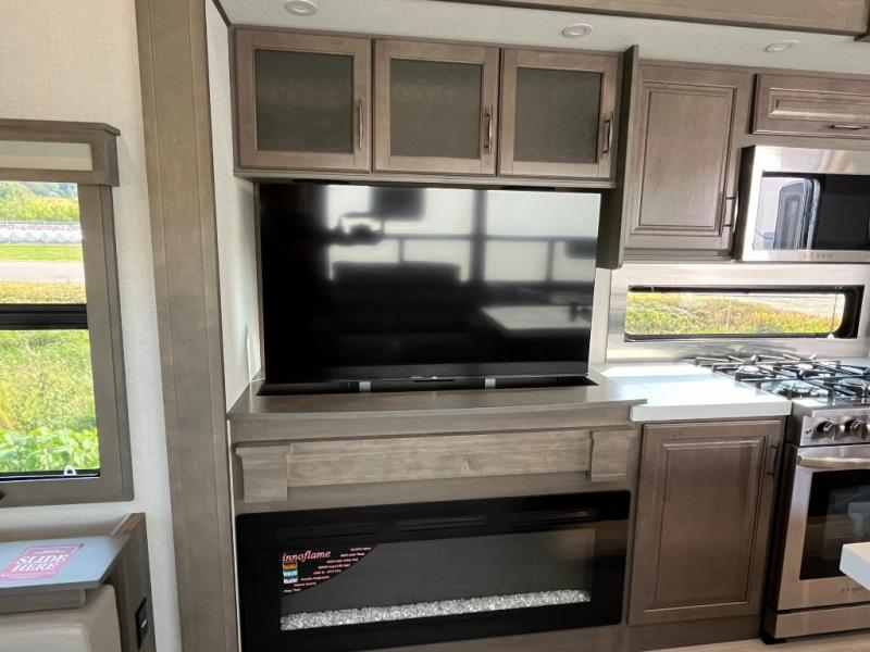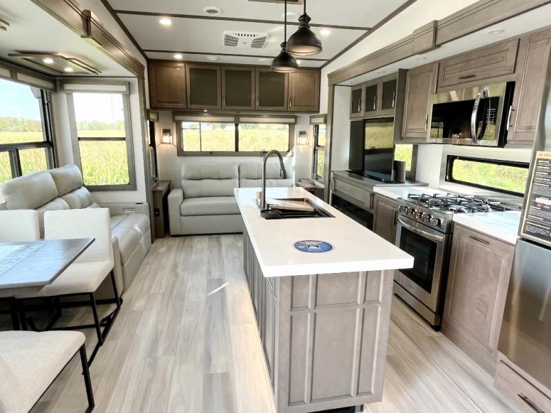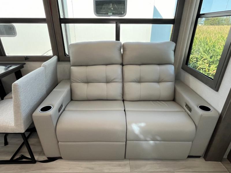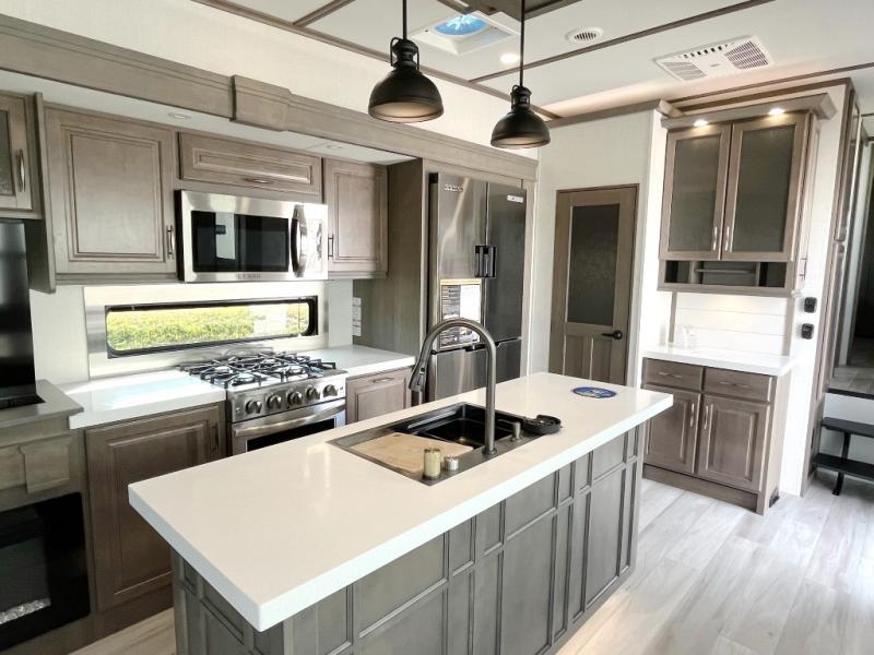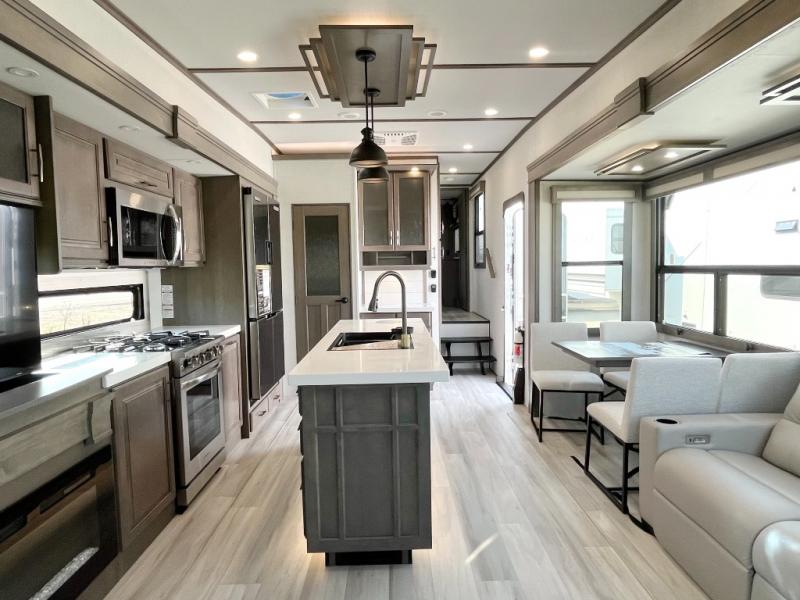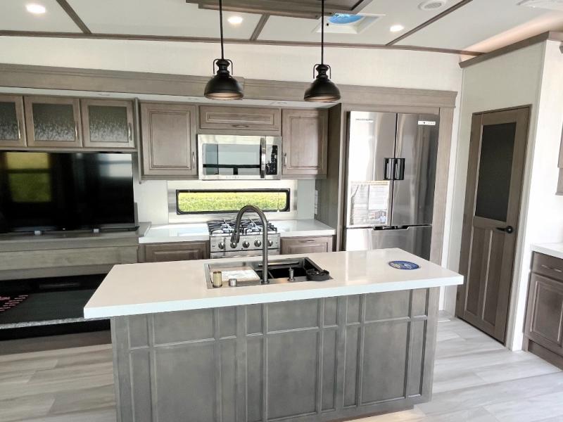 Are you looking to upgrade from a travel trailer to a fifth wheel? If so, this model will be perfect for you! Once you arrive at the campground, you can unload your gear from the pass-through storage, put out the two power awnings, then relax with a cold drink. Inside, you can kick your feet up on the theater seating, play a game at the free-standing dinette, or relax on the tri-fold sofa. The chef of your group will have a kitchen island with a Smart sink, dishwasher prep if you want the option to make cleaning up easier, plus a spacious 20 cu. ft. 12V refrigerator. There is also a built-in oven, plus a pantry and a hutch for storage galore! Having two bath sinks in the full bath is sure to be a big convenience when getting ready for bed, and the queen bed slide out in the front bedroom will provide a great night's rest. You will also find a front wardrobe, a slide top dresser, plus washer/dryer prep!