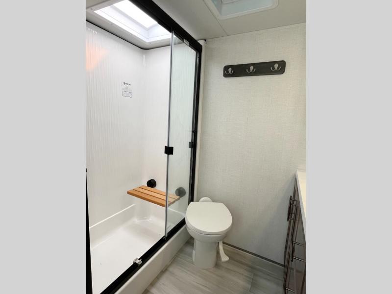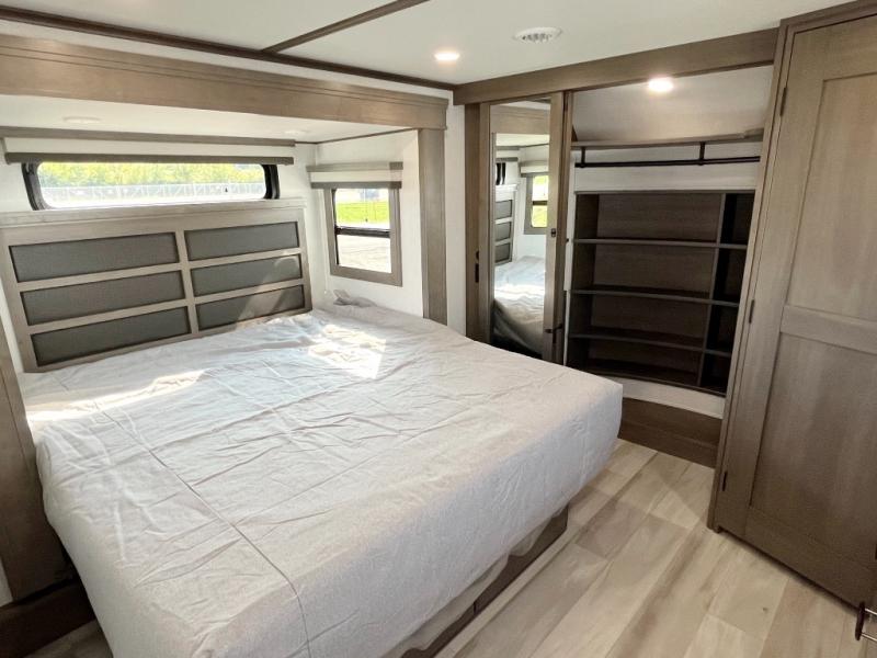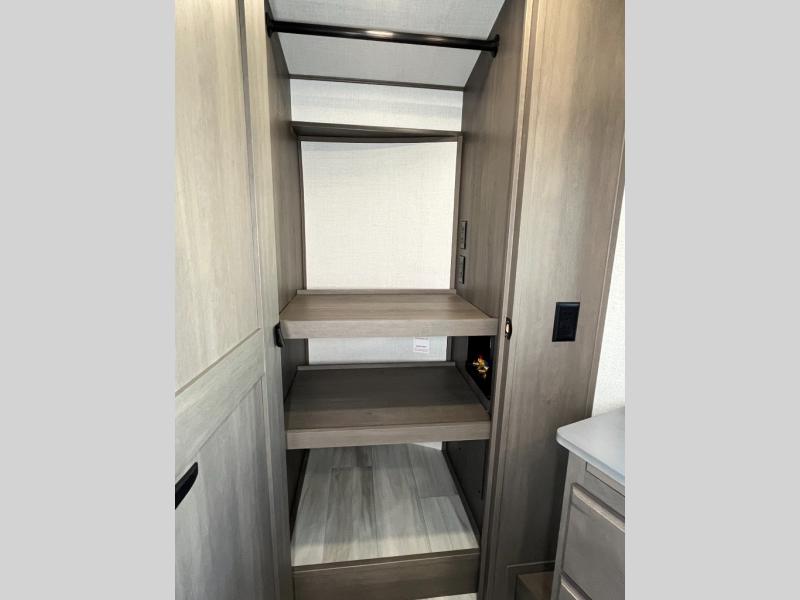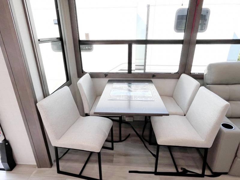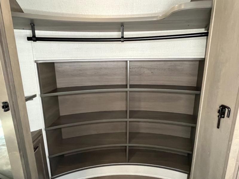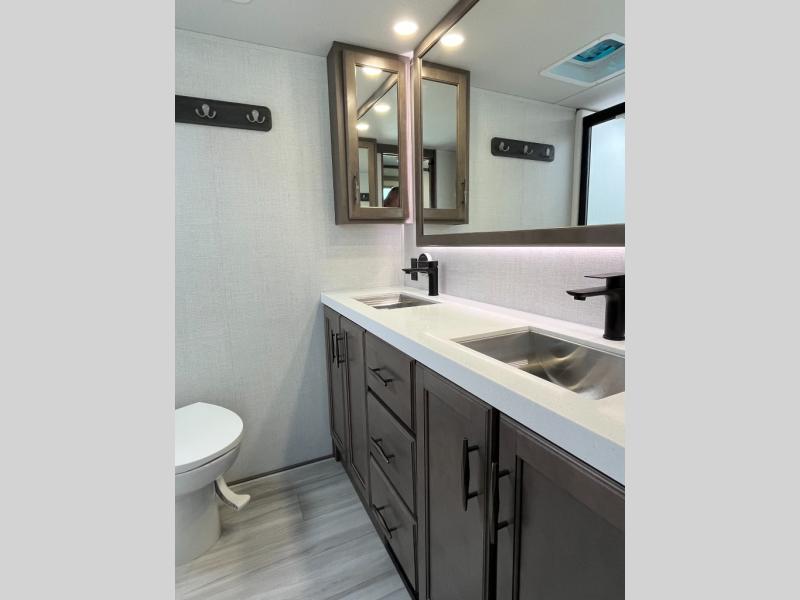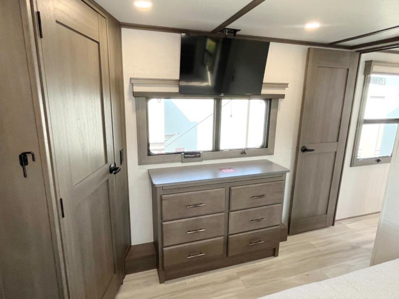 Are you looking to upgrade from a travel trailer to a fifth wheel? If so, this model will be perfect for you! Once you arrive at the campground, you can unload your gear from the pass-through storage, put out the two power awnings, then relax with a cold drink. Inside, you can kick your feet up on the theater seating, play a game at the free-standing dinette, or relax on the tri-fold sofa. The chef of your group will have a kitchen island with a Smart sink, dishwasher prep if you want the option to make cleaning up easier, plus a spacious 20 cu. ft. 12V refrigerator. There is also a built-in oven, plus a pantry and a hutch for storage galore! Having two bath sinks in the full bath is sure to be a big convenience when getting ready for bed, and the queen bed slide out in the front bedroom will provide a great night's rest. You will also find a front wardrobe, a slide top dresser, plus washer/dryer prep!
