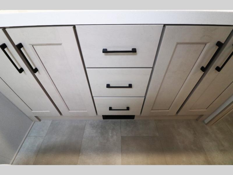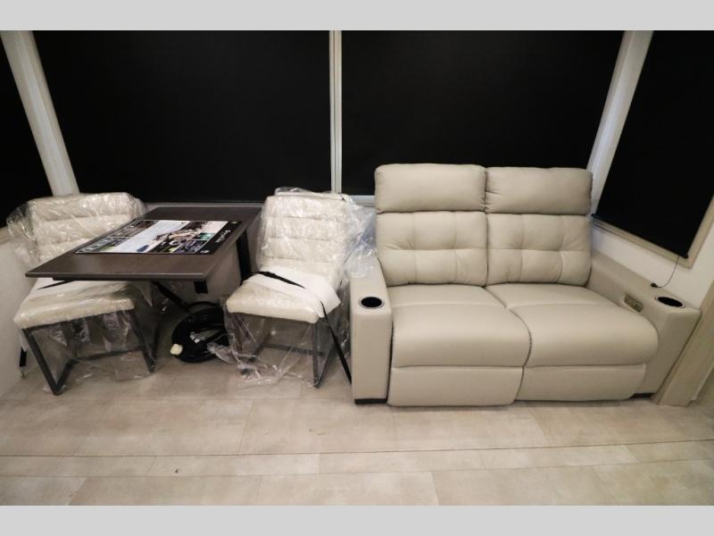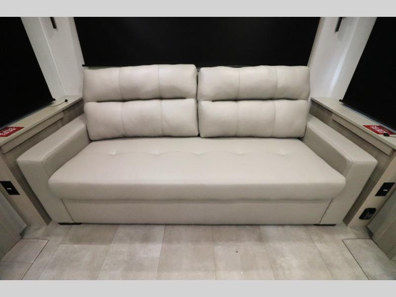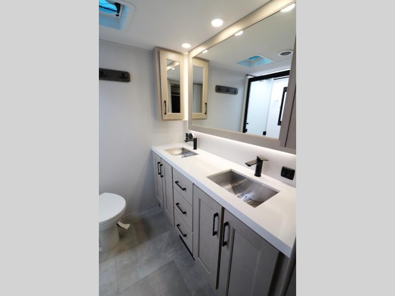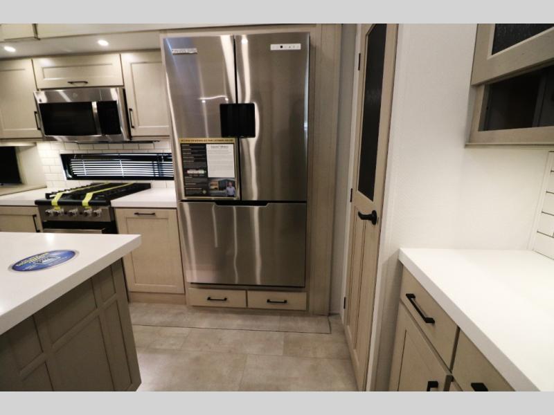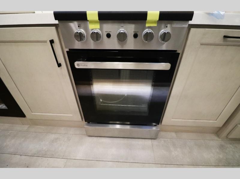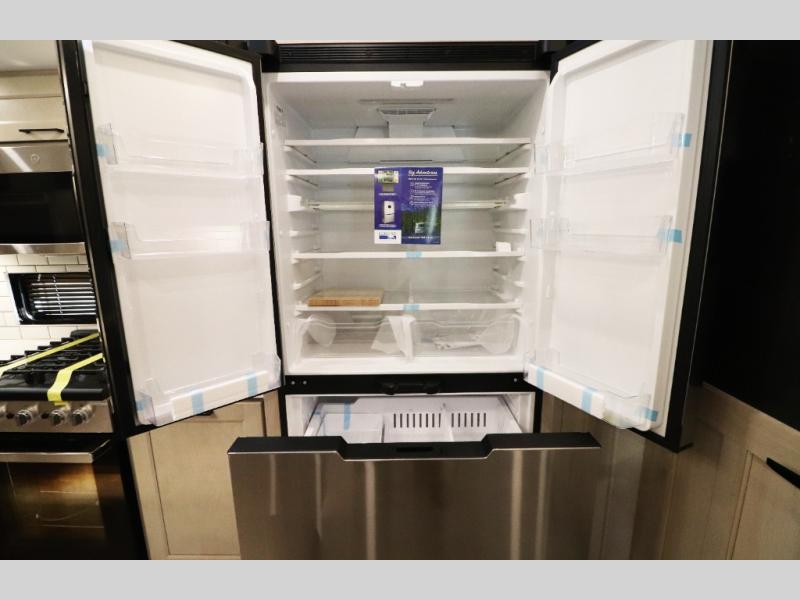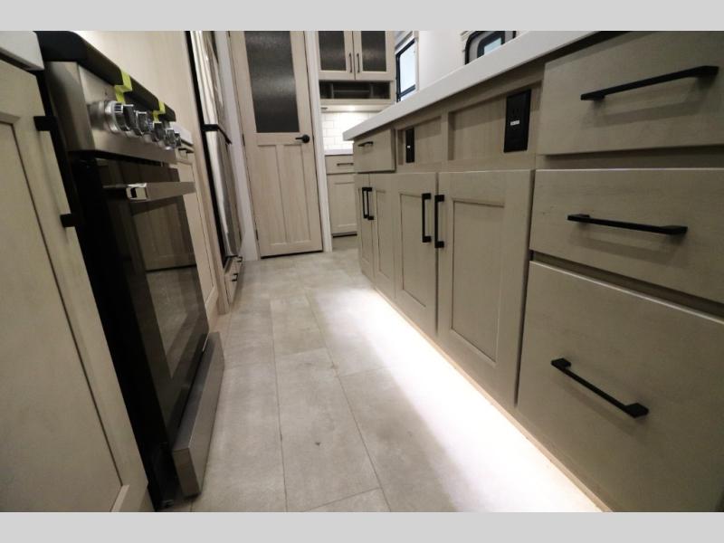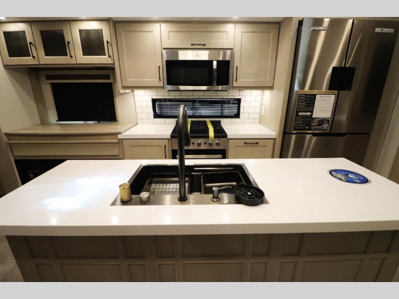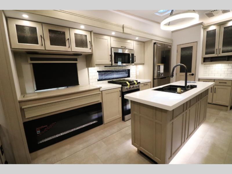 Gourmet Kitchen: Equipped with a kitchen island featuring a Smart sink, a 20 cu. ft. 12V refrigerator, a 24" residential oven, and dishwasher prep, this kitchen caters to all your culinary needs.