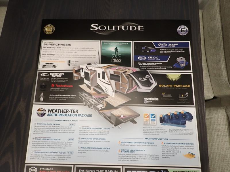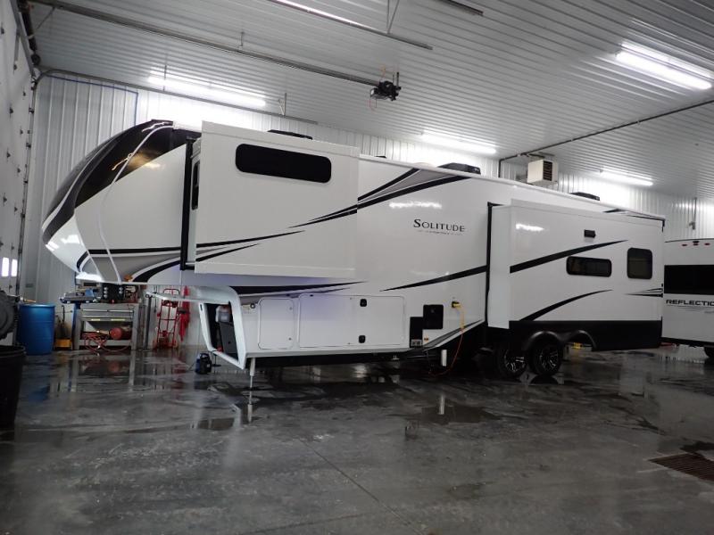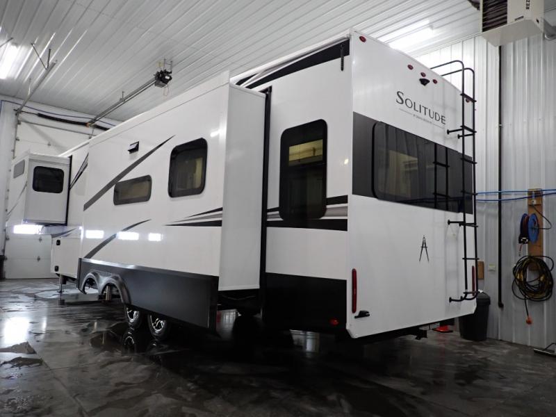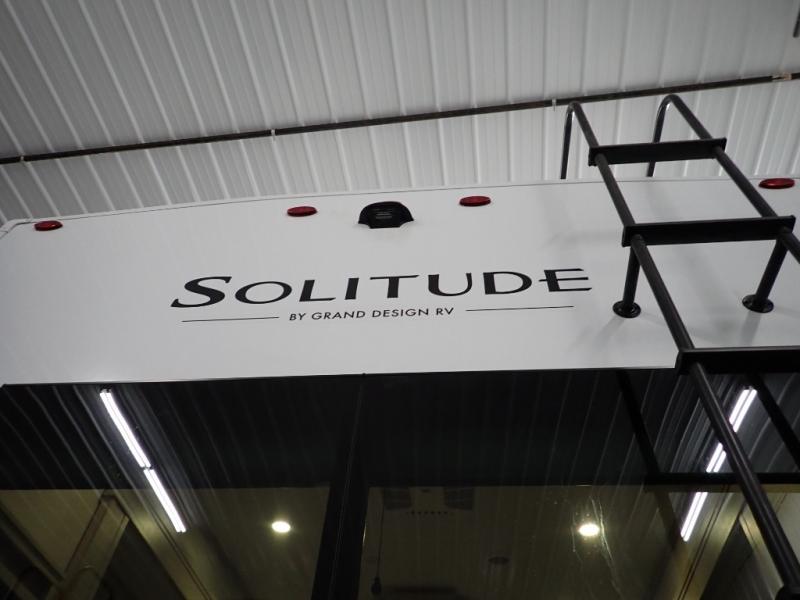 Each Solitude fifth wheel by Grand Design features a 101" wide-body construction, heavy duty 8,000 lb. axles, frameless tinted windows, and high-gloss gel coat sidewalls. You can camp year around thanks to the Weather-Tek Package that includes a 35K BTU high-capacity furnace, an all-in-one enclosed and heated utility center, and a fully enclosed underbelly with heated tanks and storage. Inside, you'll love the premium roller shades, hardwood cabinet doors, solid surface countertops, plus residential finishes throughout to make you truly feel at home. Each model also includes a MORryde CRE3000 suspension system, self adjusting brakes, and a MORryde pin box that will provide smooth towing from home to campground. Affordable luxury is possible with the Solitude fifth wheels; choose yours today!