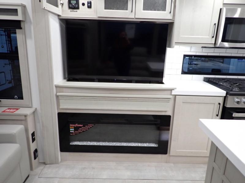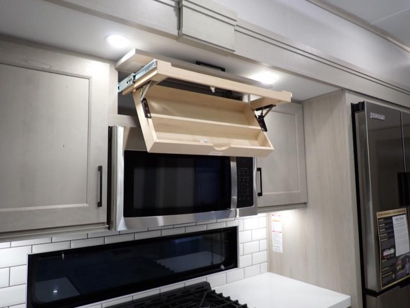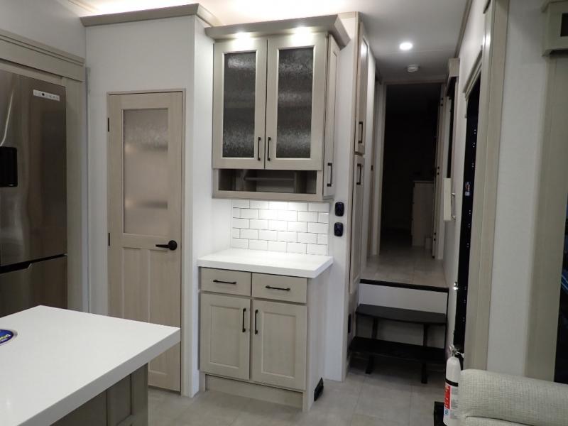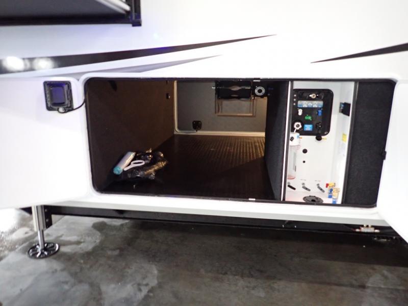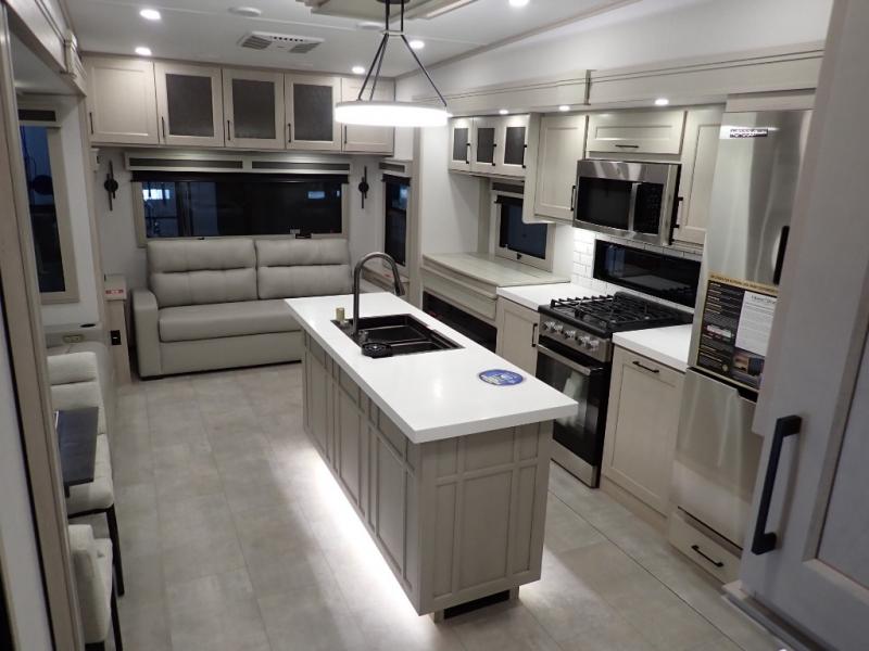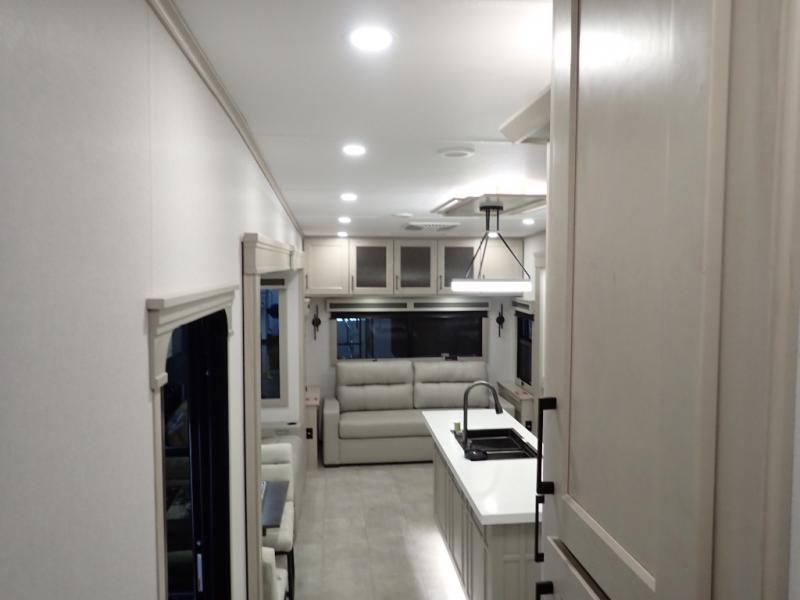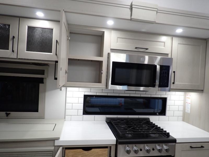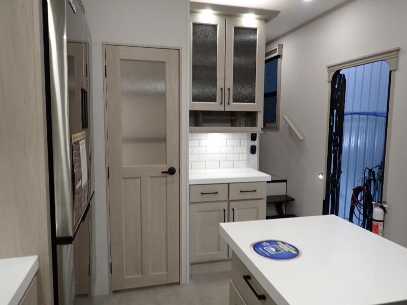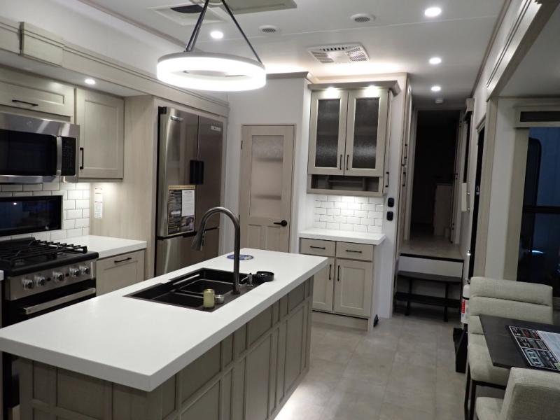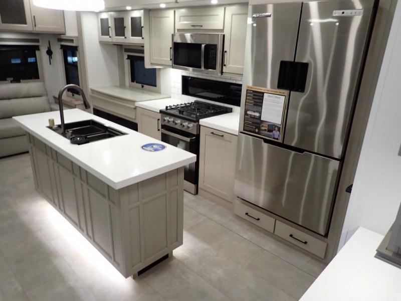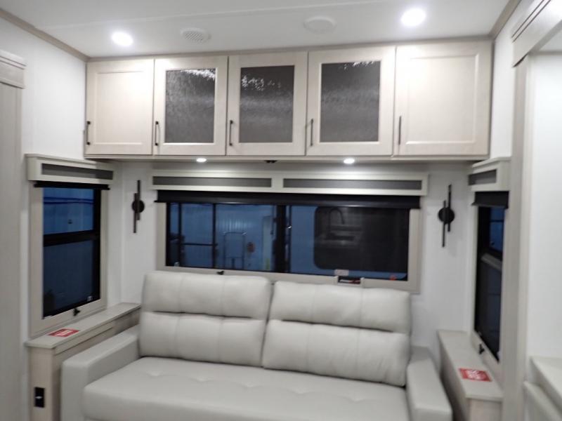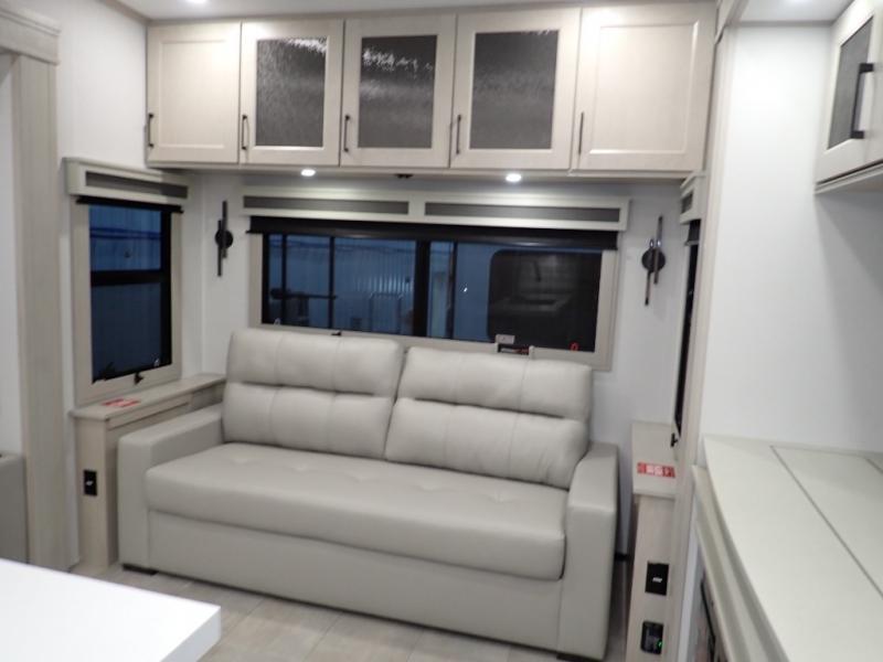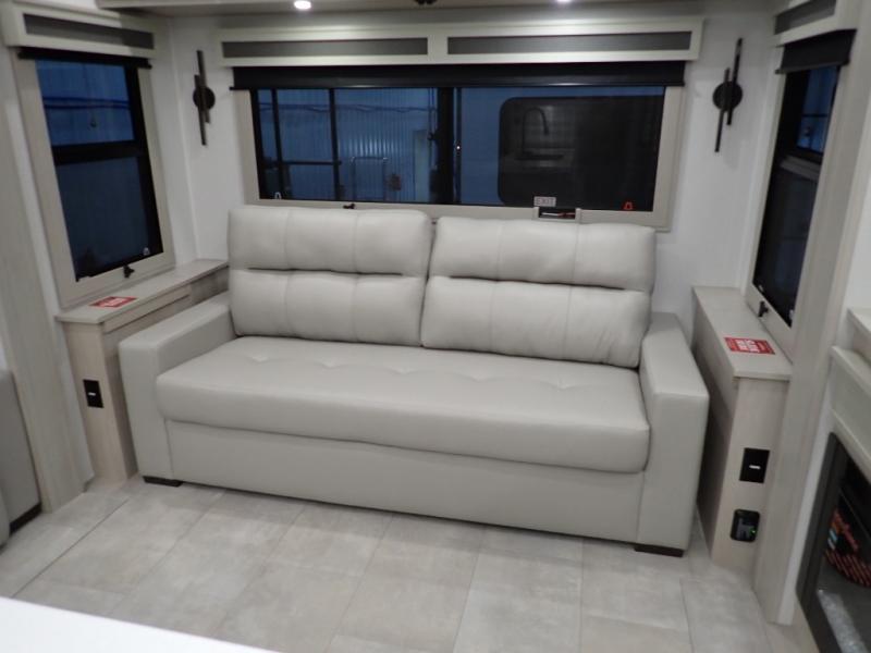Are you looking to upgrade from a travel trailer to a fifth wheel? If so, this model will be perfect for you! Once you arrive at the campground, you can unload your gear from the pass-through storage, put out the two power awnings, then relax with a cold drink. Inside, you can kick your feet up on the theater seating, play a game at the free-standing dinette, or relax on the tri-fold sofa. The chef of your group will have a kitchen island with a Smart sink, dishwasher prep if you want the option to make cleaning up easier, plus a spacious 20 cu. ft. 12V refrigerator. There is also a built-in oven, plus a pantry and a hutch for storage galore! Having two bath sinks in the full bath is sure to be a big convenience when getting ready for bed, and the queen bed slide out in the front bedroom will provide a great night's rest. You will also find a front wardrobe, a slide top dresser, plus washer/dryer prep!