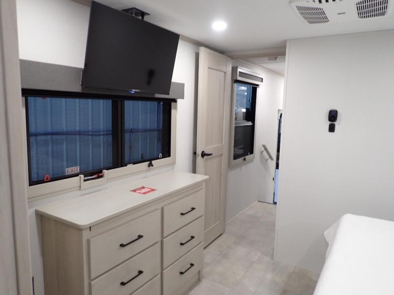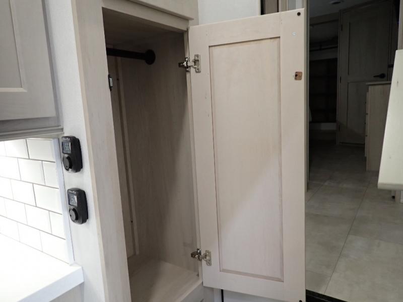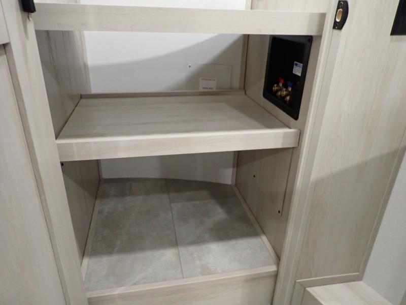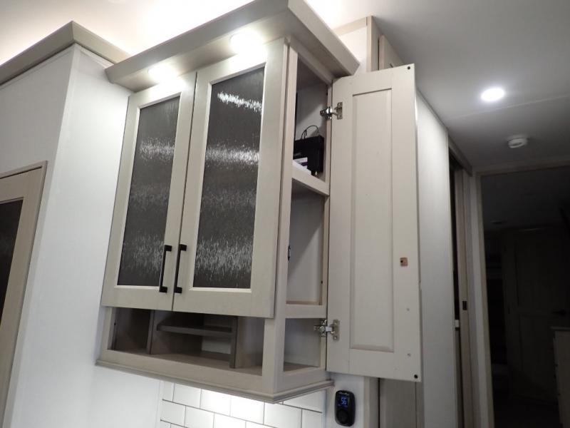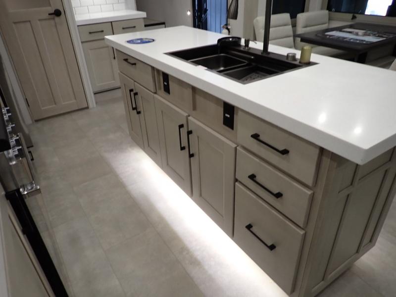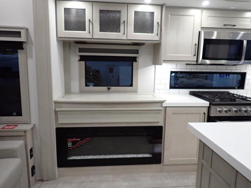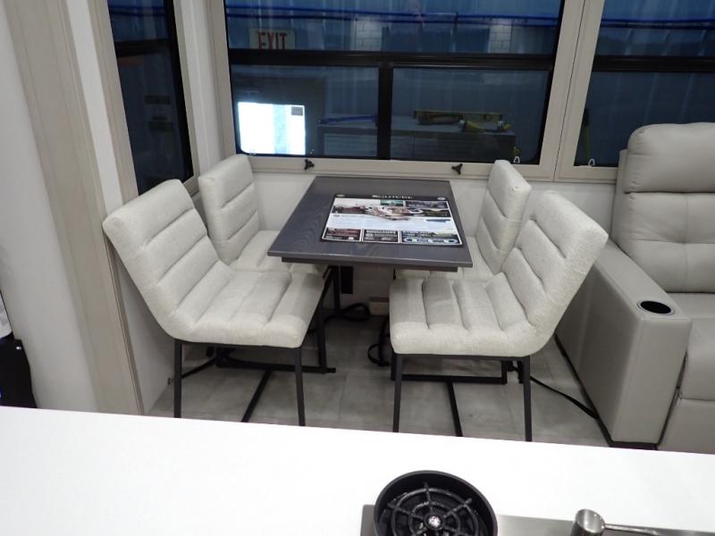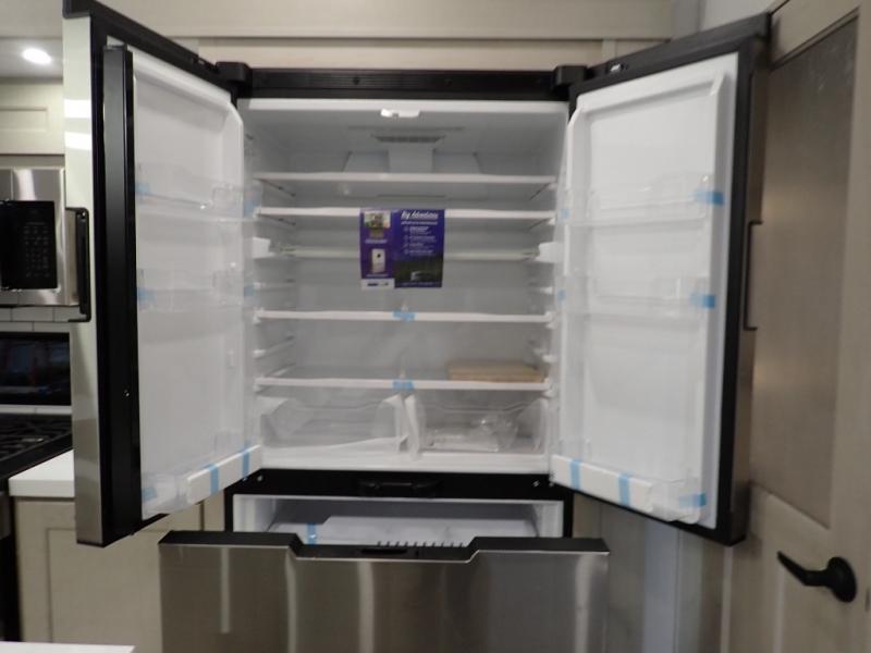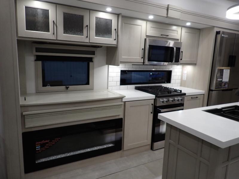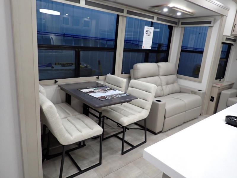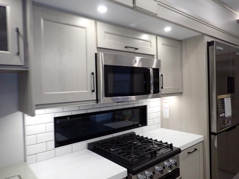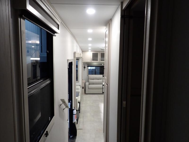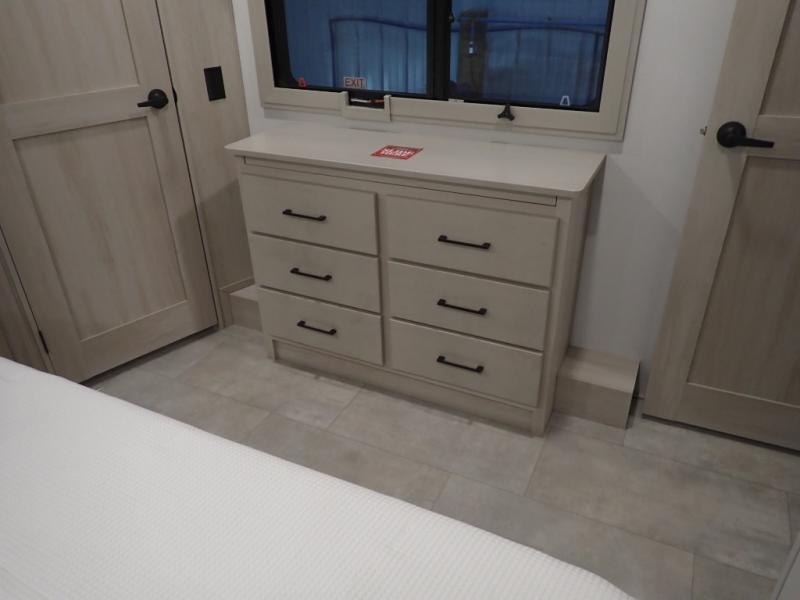 Are you looking to upgrade from a travel trailer to a fifth wheel? If so, this model will be perfect for you! Once you arrive at the campground, you can unload your gear from the pass-through storage, put out the two power awnings, then relax with a cold drink. Inside, you can kick your feet up on the theater seating, play a game at the free-standing dinette, or relax on the tri-fold sofa. The chef of your group will have a kitchen island with a Smart sink, dishwasher prep if you want the option to make cleaning up easier, plus a spacious 20 cu. ft. 12V refrigerator. There is also a built-in oven, plus a pantry and a hutch for storage galore! Having two bath sinks in the full bath is sure to be a big convenience when getting ready for bed, and the queen bed slide out in the front bedroom will provide a great night's rest. You will also find a front wardrobe, a slide top dresser, plus washer/dryer prep!