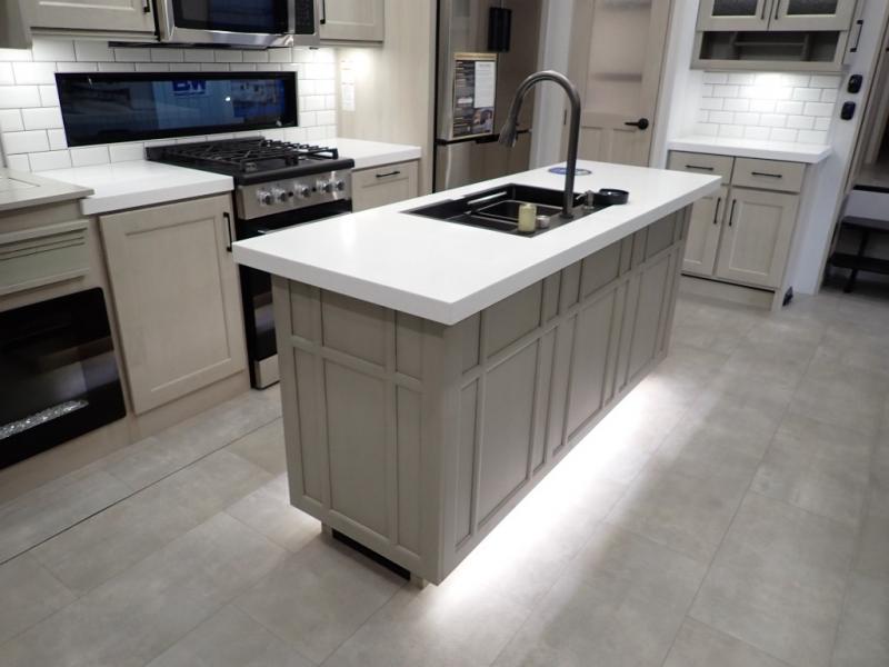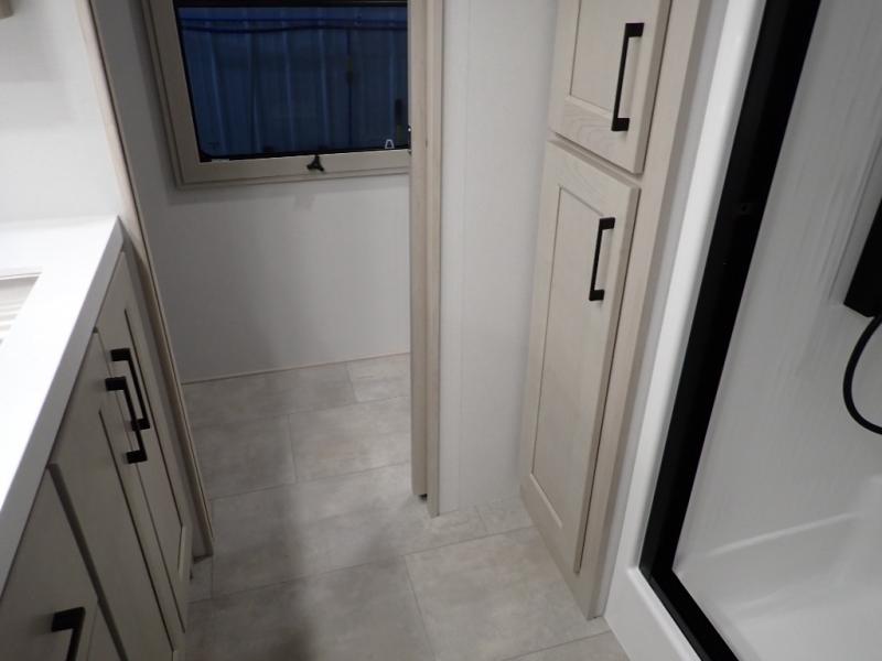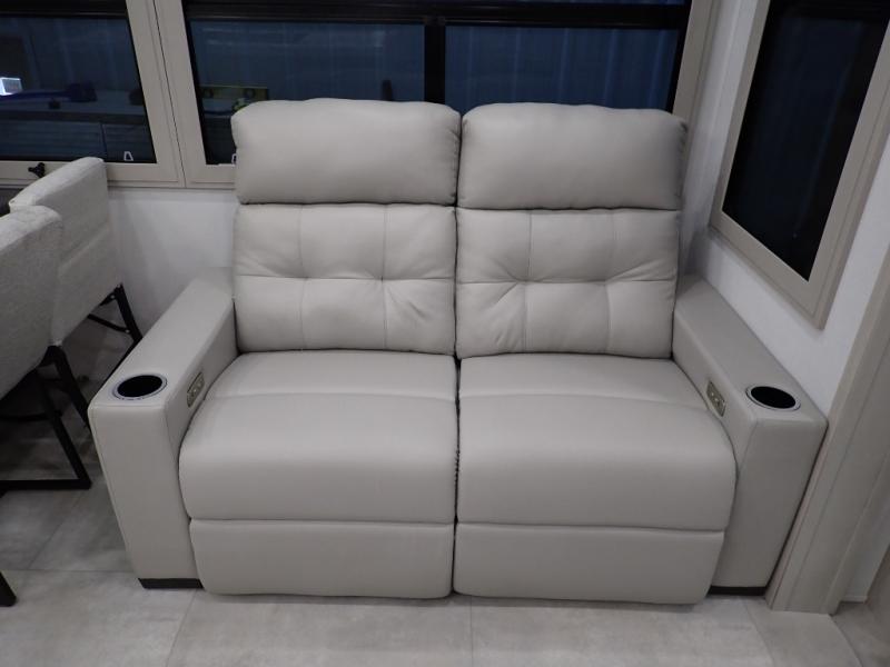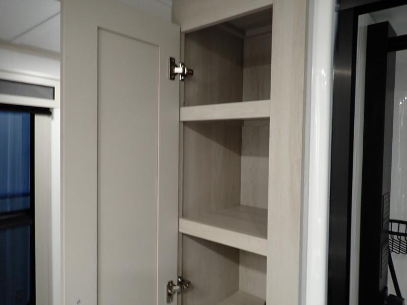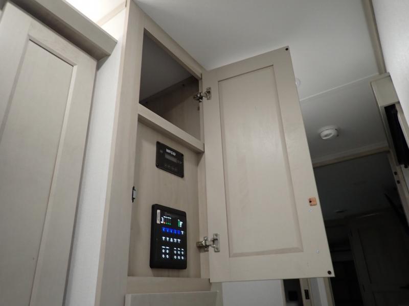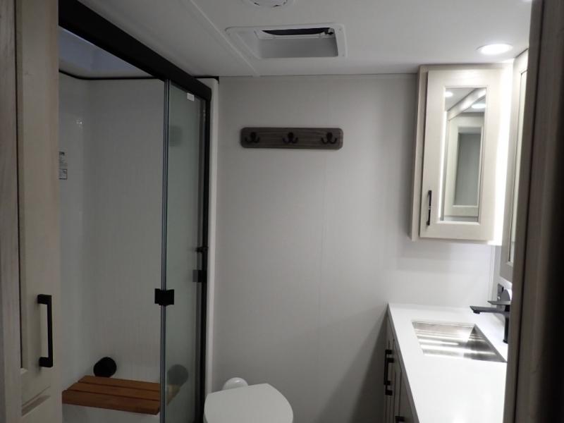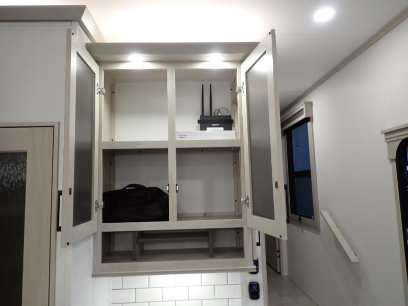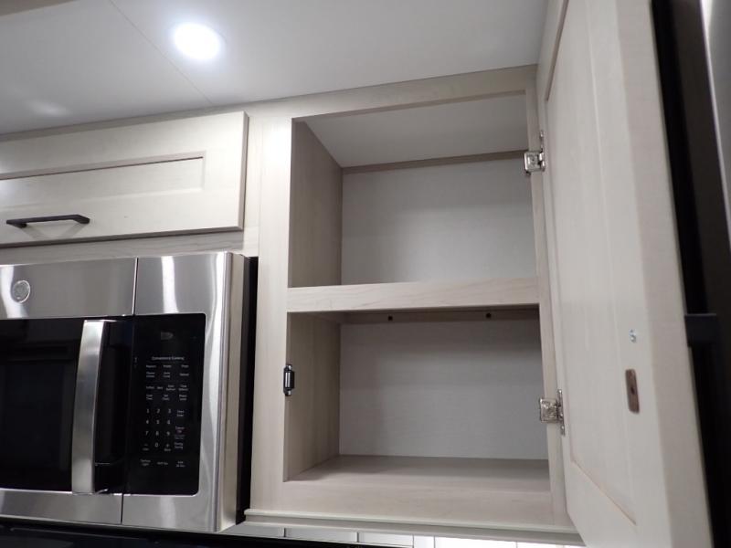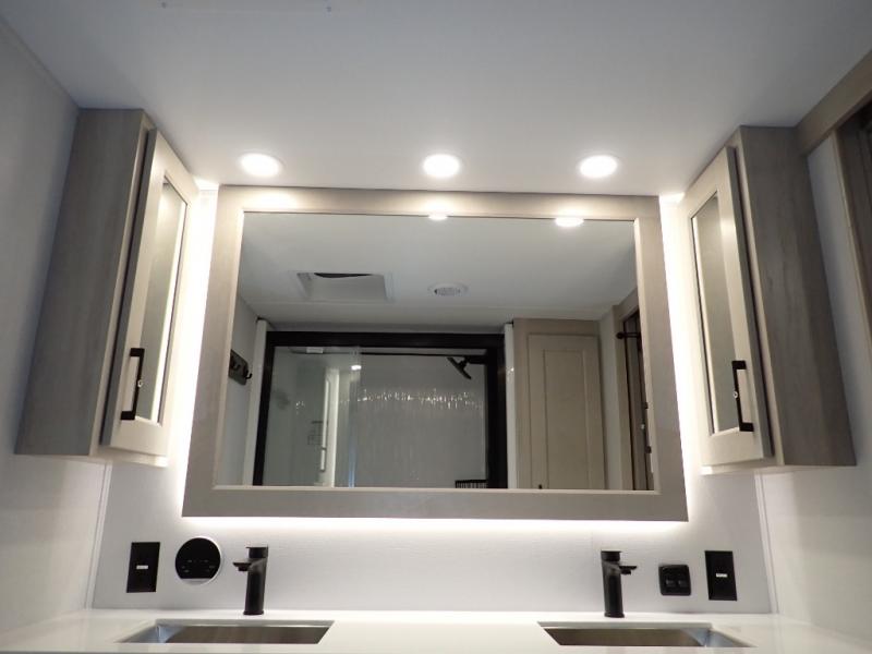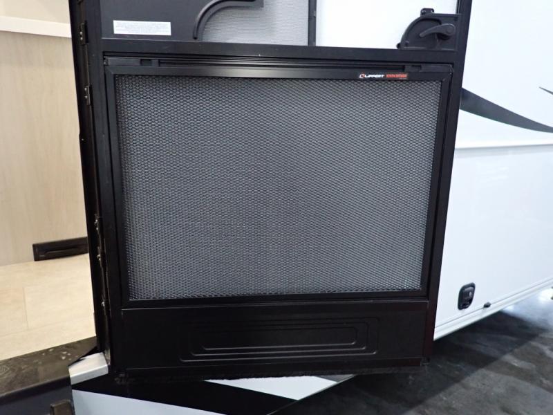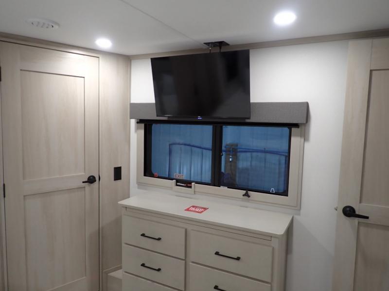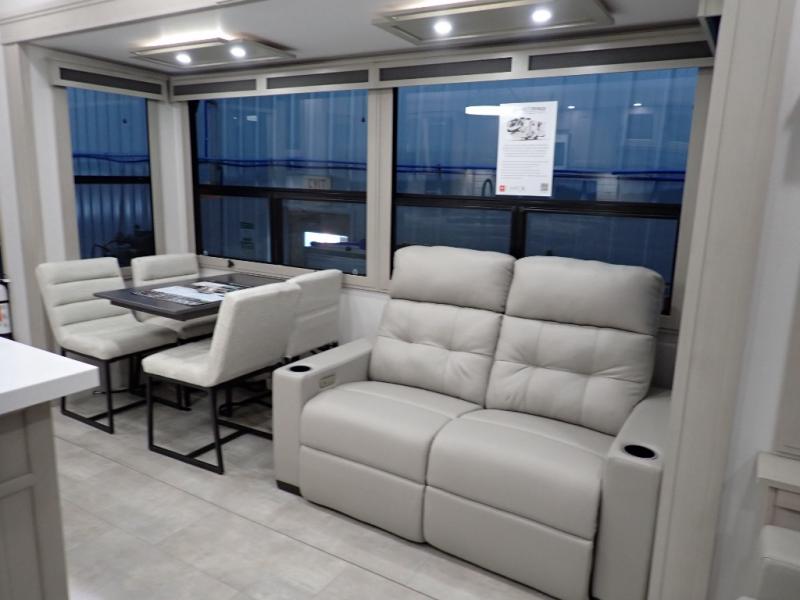 Are you looking to upgrade from a travel trailer to a fifth wheel? If so, this model will be perfect for you! Once you arrive at the campground, you can unload your gear from the pass-through storage, put out the two power awnings, then relax with a cold drink. Inside, you can kick your feet up on the theater seating, play a game at the free-standing dinette, or relax on the tri-fold sofa. The chef of your group will have a kitchen island with a Smart sink, dishwasher prep if you want the option to make cleaning up easier, plus a spacious 20 cu. ft. 12V refrigerator. There is also a built-in oven, plus a pantry and a hutch for storage galore! Having two bath sinks in the full bath is sure to be a big convenience when getting ready for bed, and the queen bed slide out in the front bedroom will provide a great night's rest. You will also find a front wardrobe, a slide top dresser, plus washer/dryer prep!