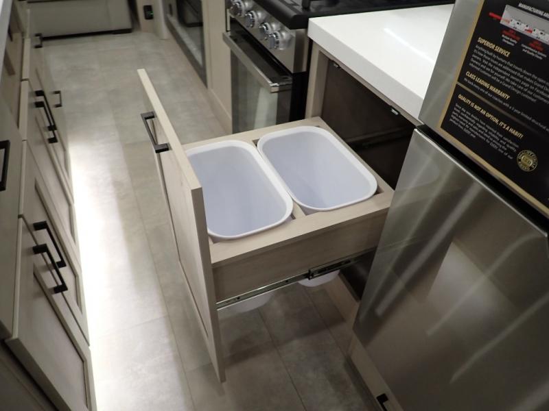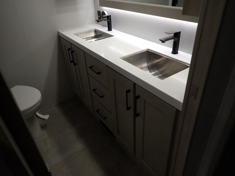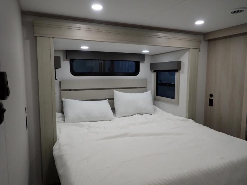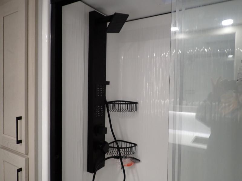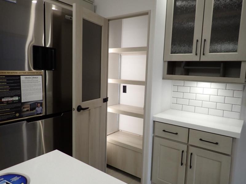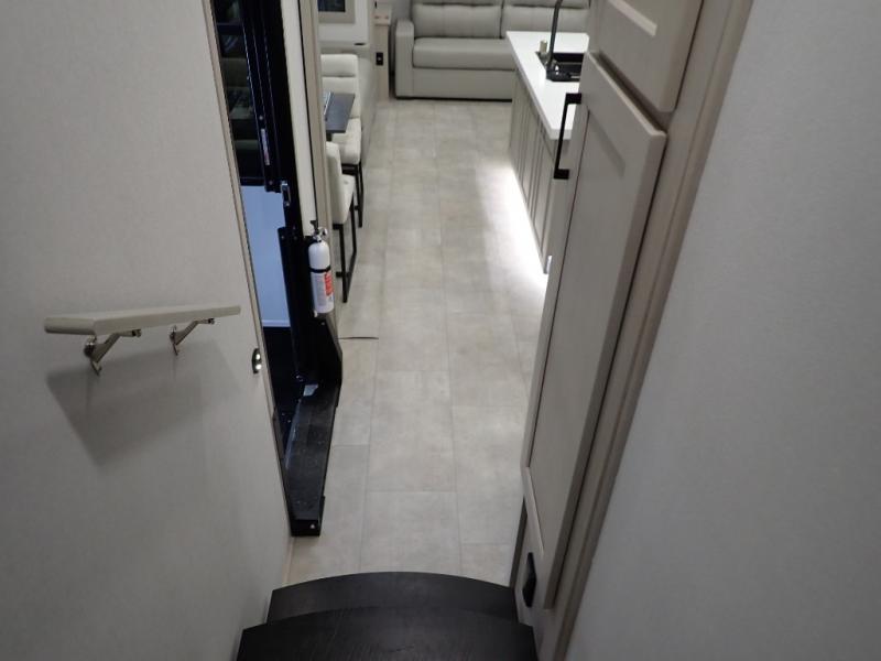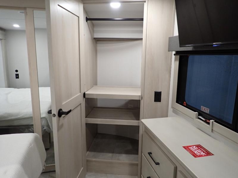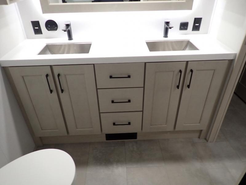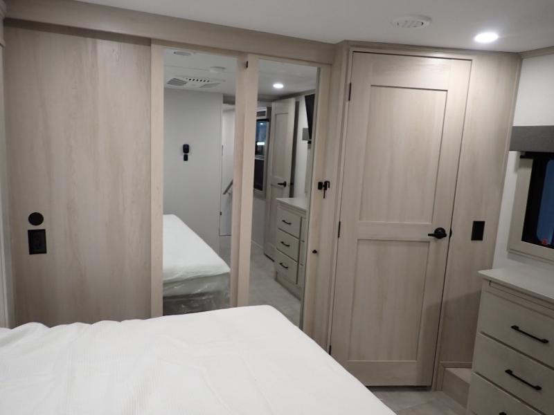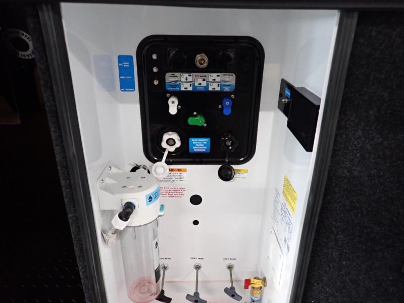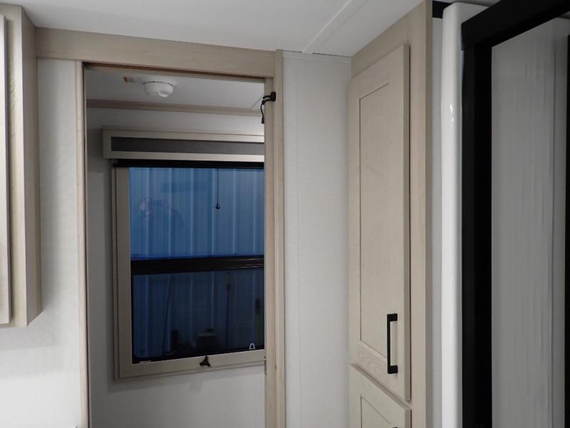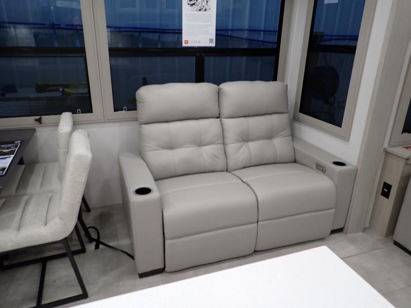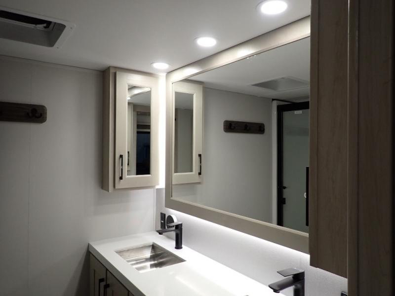 Are you looking to upgrade from a travel trailer to a fifth wheel? If so, this model will be perfect for you! Once you arrive at the campground, you can unload your gear from the pass-through storage, put out the two power awnings, then relax with a cold drink. Inside, you can kick your feet up on the theater seating, play a game at the free-standing dinette, or relax on the tri-fold sofa. The chef of your group will have a kitchen island with a Smart sink, dishwasher prep if you want the option to make cleaning up easier, plus a spacious 20 cu. ft. 12V refrigerator. There is also a built-in oven, plus a pantry and a hutch for storage galore! Having two bath sinks in the full bath is sure to be a big convenience when getting ready for bed, and the queen bed slide out in the front bedroom will provide a great night's rest. You will also find a front wardrobe, a slide top dresser, plus washer/dryer prep!
