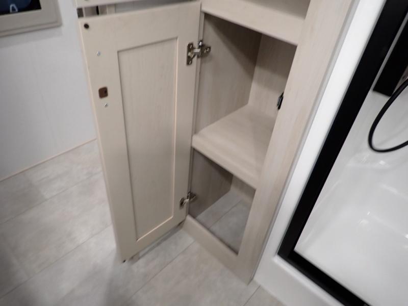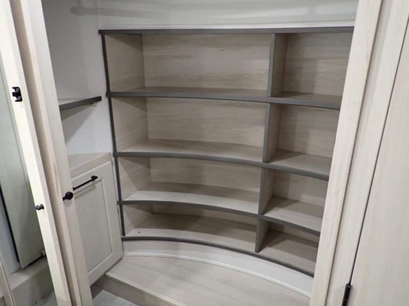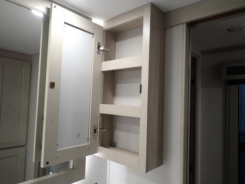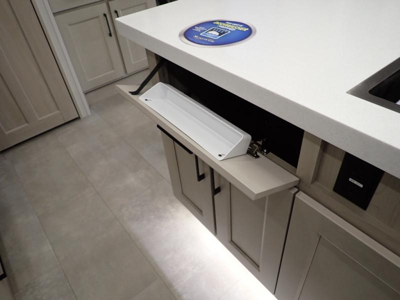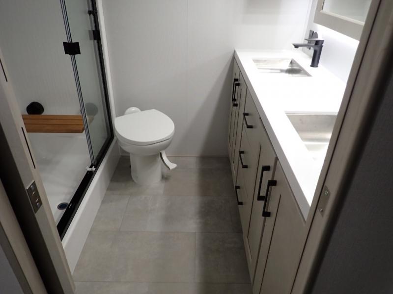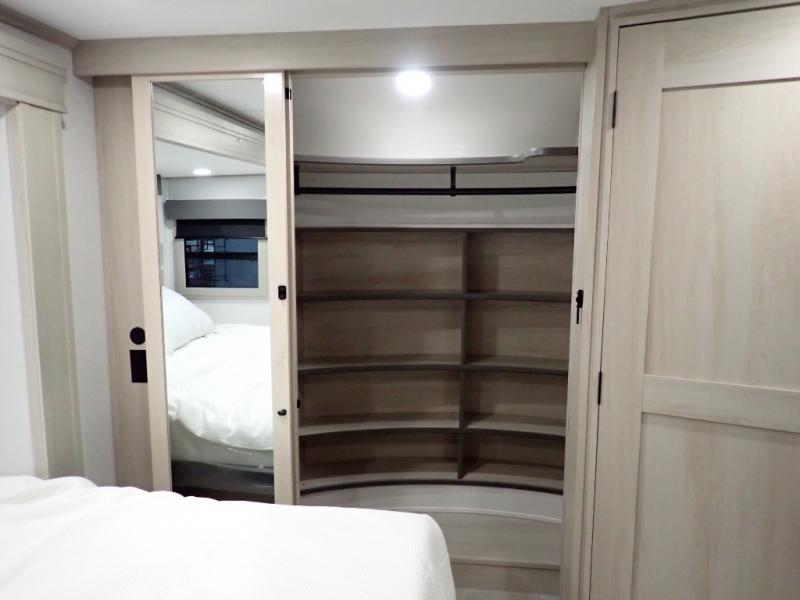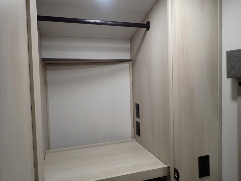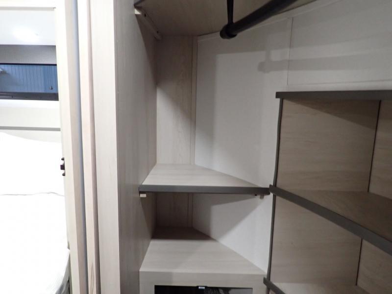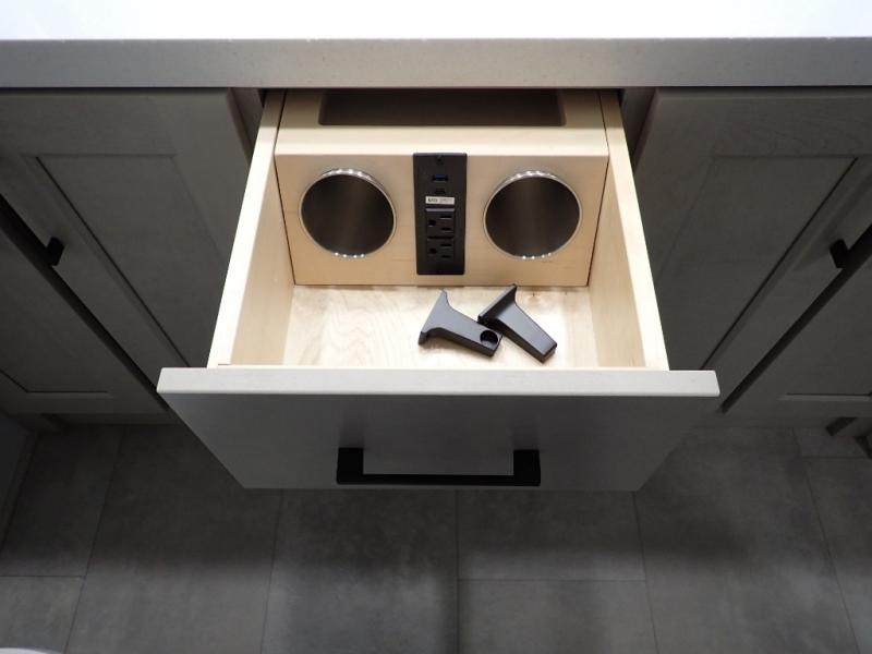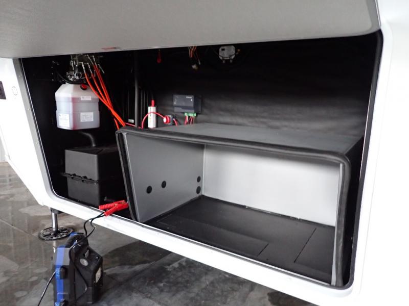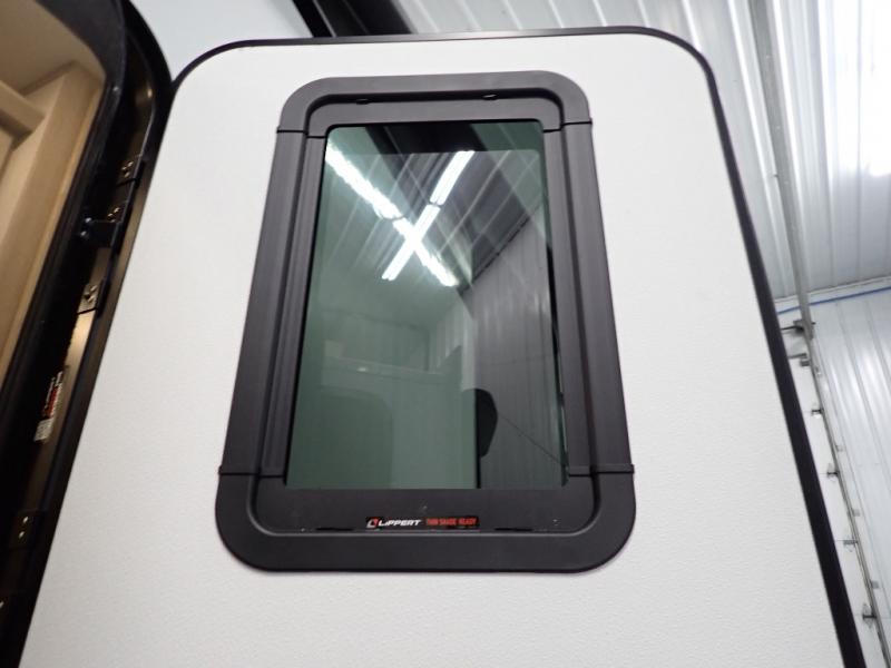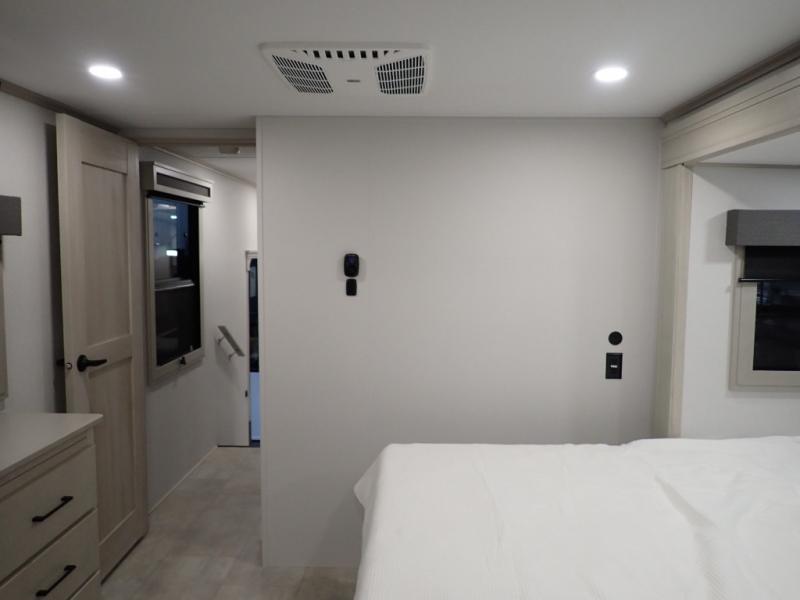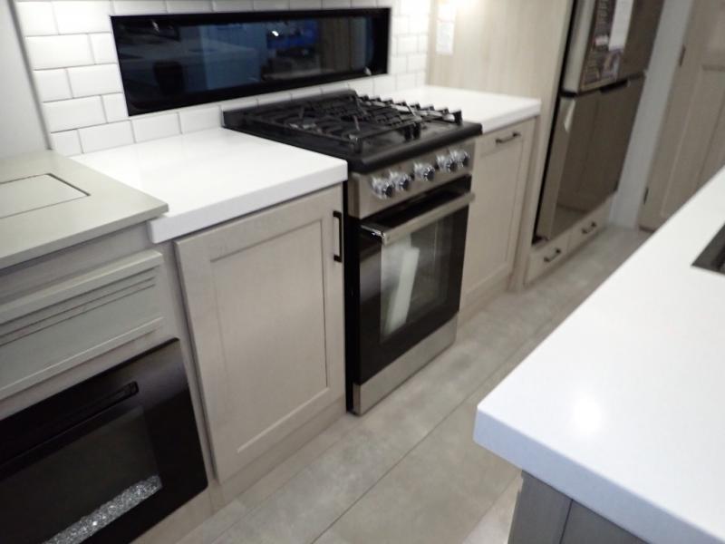 Are you looking to upgrade from a travel trailer to a fifth wheel? If so, this model will be perfect for you! Once you arrive at the campground, you can unload your gear from the pass-through storage, put out the two power awnings, then relax with a cold drink. Inside, you can kick your feet up on the theater seating, play a game at the free-standing dinette, or relax on the tri-fold sofa. The chef of your group will have a kitchen island with a Smart sink, dishwasher prep if you want the option to make cleaning up easier, plus a spacious 20 cu. ft. 12V refrigerator. There is also a built-in oven, plus a pantry and a hutch for storage galore! Having two bath sinks in the full bath is sure to be a big convenience when getting ready for bed, and the queen bed slide out in the front bedroom will provide a great night's rest. You will also find a front wardrobe, a slide top dresser, plus washer/dryer prep!