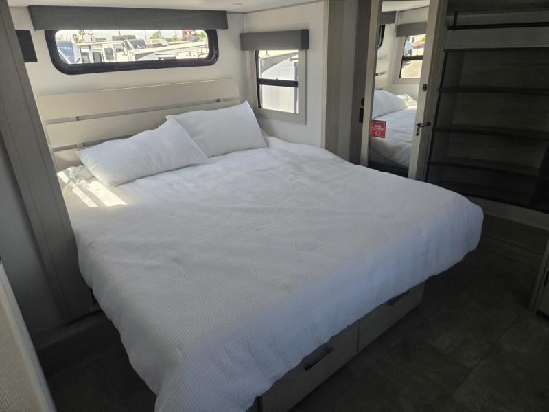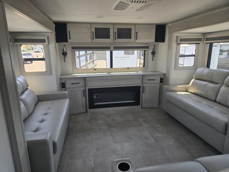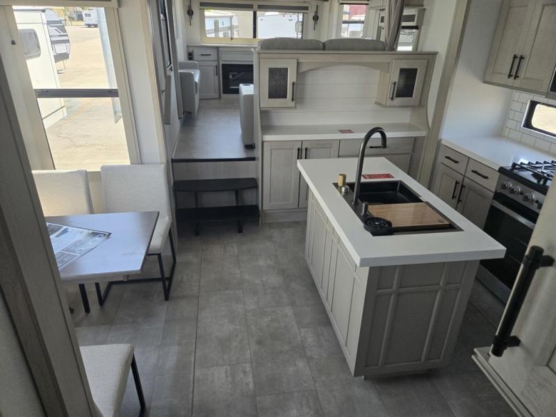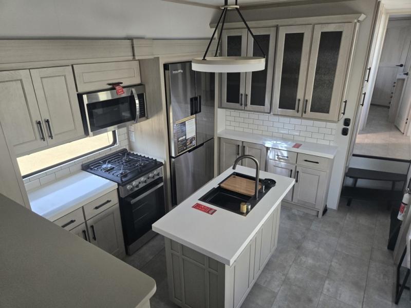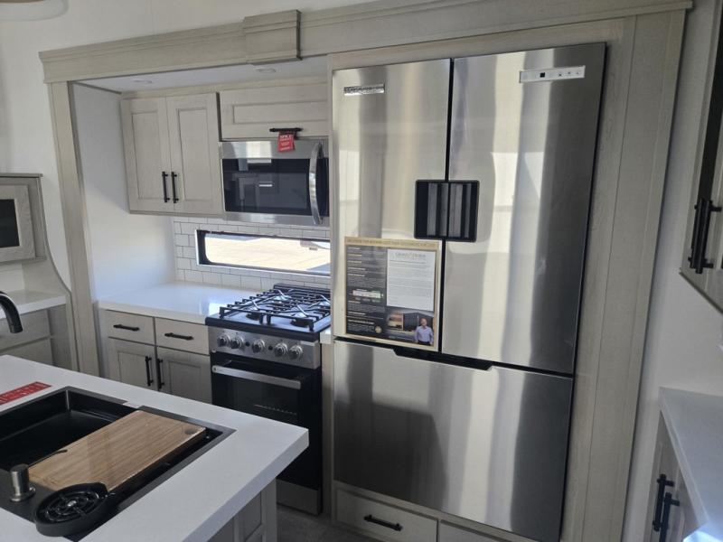 Each minute spent in this spacious fifth wheel will feel just like home! The rear living area includes a rear entertainment center with an LED Smart TV and a fireplace, overhead cabinets, theater seating, plus two tri-fold sofas for your guests to sleep on. You will have the front private bedroom all to yourselves with a queen bed slide out that can be switched out for an optional king bed, and the front closet provides all the space you need to store your belongings. This model includes a spacious full bath plus dual bath sinks for ultimate convenience. The chef of your group will love the middle kitchen with its convenient island including double sinks, a residential cooktop and built-in oven, 20 cu. ft. refrigerator, and free-standing dinette. Head outdoors to find a 16' power awning with LED lights and middle pass through along with rear storage including a sliding tray, and you might want to add the optional pull-out kitchen.