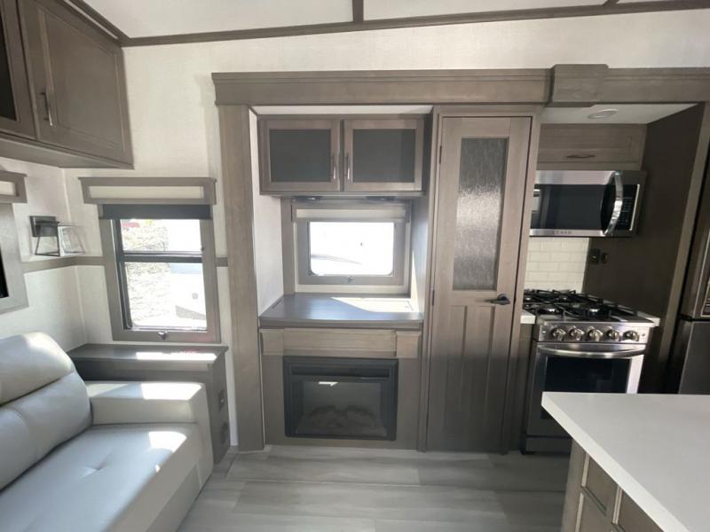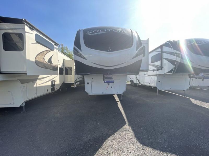 Each Solitude fifth wheel by Grand Design features a 101" wide-body construction, heavy duty 8,000 lb. axles, frameless tinted windows, and high-gloss gel coat sidewalls. You can camp year around thanks to the Weather-Tek Package that includes a 35K BTU high-capacity furnace, an all-in-one enclosed and heated utility center, and a fully enclosed underbelly with heated tanks and storage. Inside, you'll love the premium roller shades, hardwood cabinet doors, solid surface countertops, plus residential finishes throughout to make you truly feel at home. Each model also includes a MORryde CRE3000 suspension system, self adjusting brakes, and a MORryde pin box that will provide smooth towing from home to campground. Affordable luxury is possible with the Solitude fifth wheels; choose yours today!