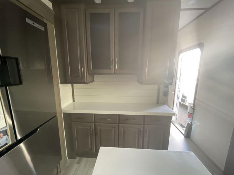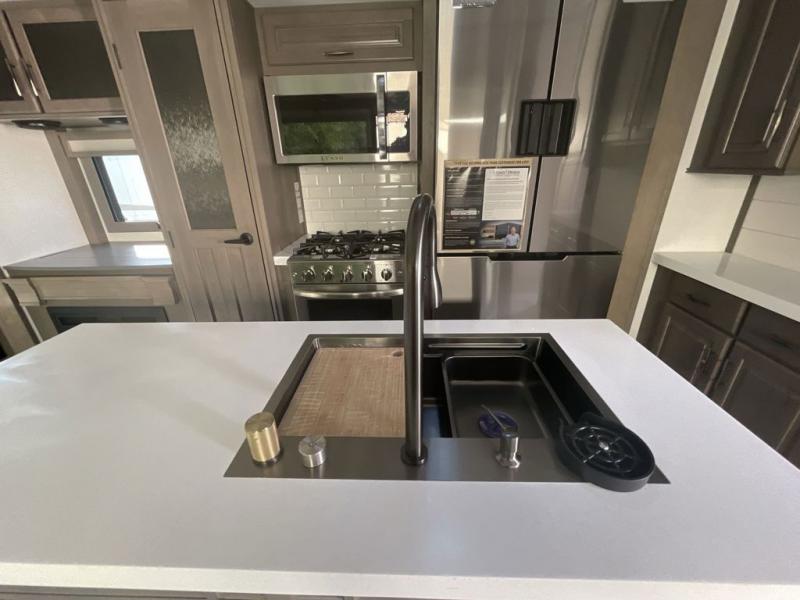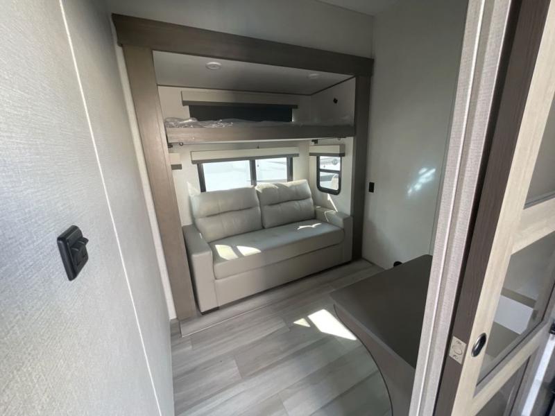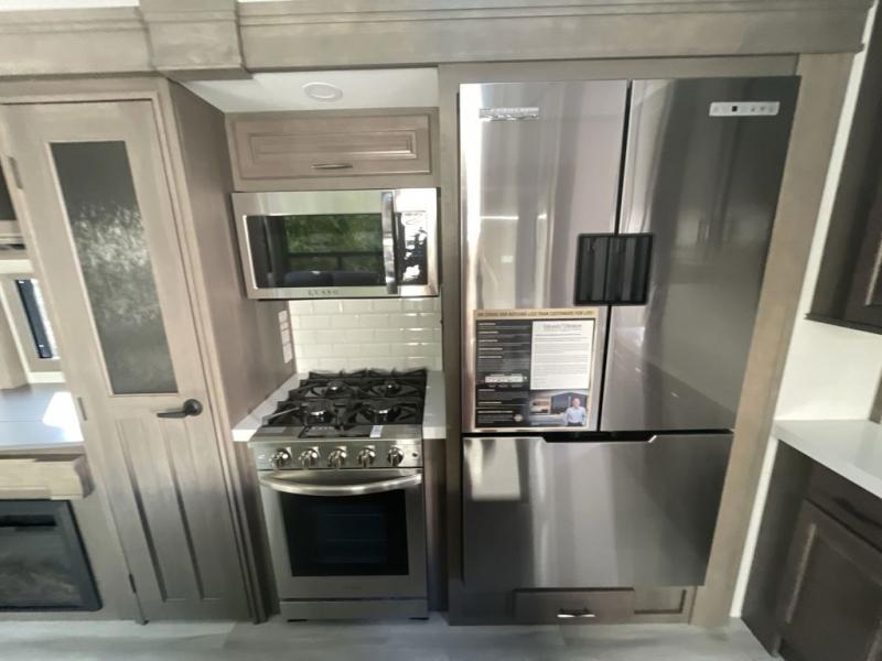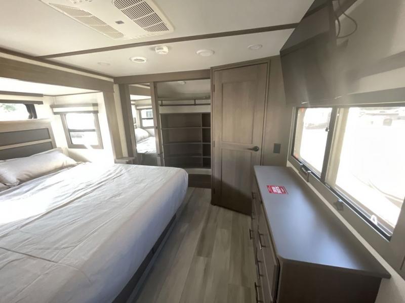 The middle bunkhouse in this fifth wheel includes a fold down bunk above a tri-fold sofa which offers seating for extra living space as well as sleeping space for a bedroom. There is also a desk to work from and a closet for clothing and supplies making this room multi-functional. The front master bedroom features a queen bed slide or you can choose the king option, and a large closet as well as a washer/dryer prep. The main combined living and kitchen area is spacious with dual opposing slides and offers theatre seating and a tri-fold sofa to relax on while watching the LED Smart TV allowing you to visit with the cook in the kitchen while preparing meals. This chef kitchen offers an island with prep space and a sink, a built-in oven, a 20 cu. ft. refrigerator, and an oversized pantry to store lots of dry goods and snacks. You will surely enjoy the two power awnings and the outside griddle plus beverage cooler while relaxing outdoors.