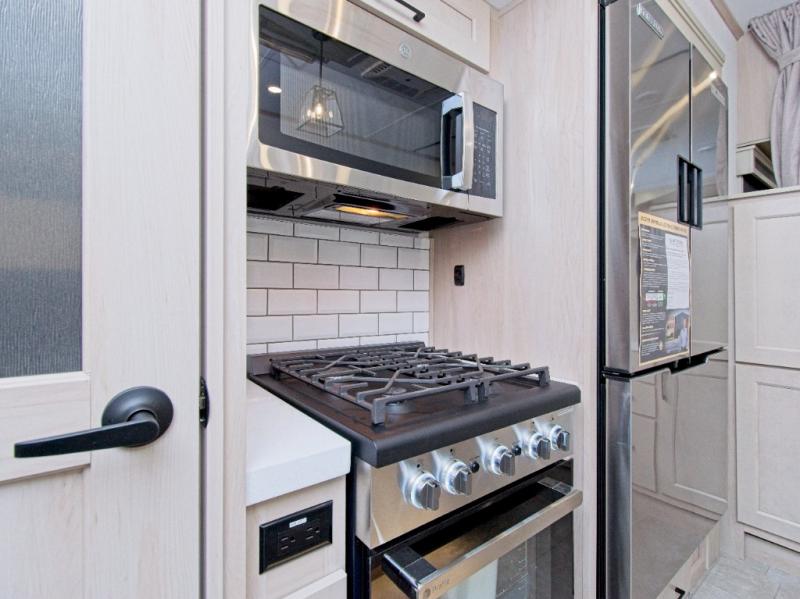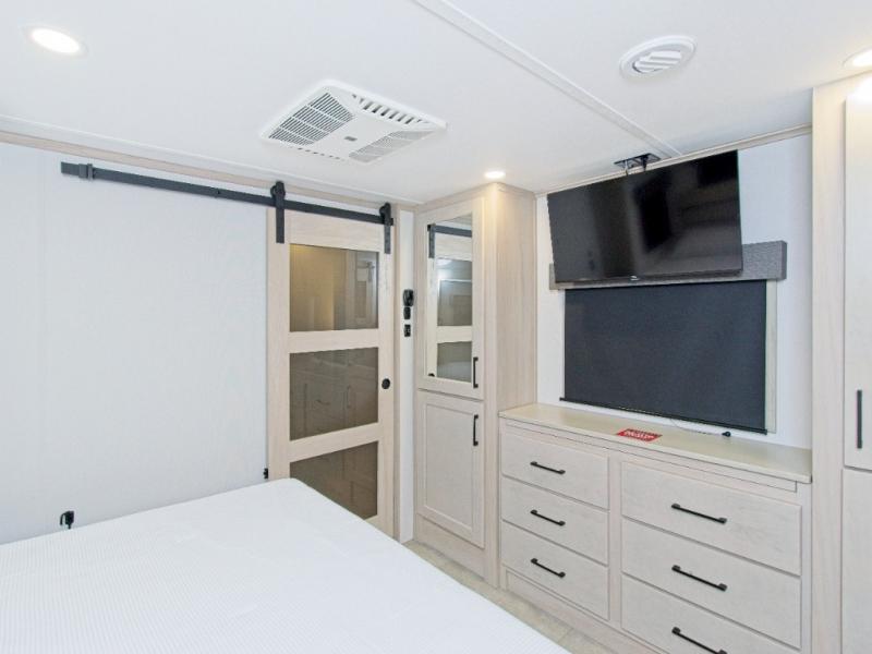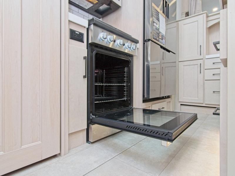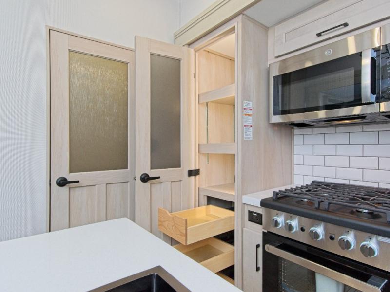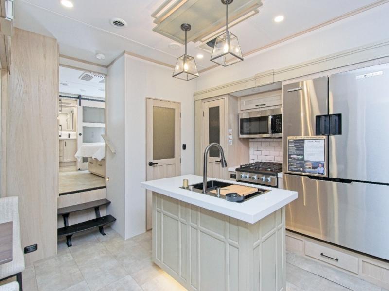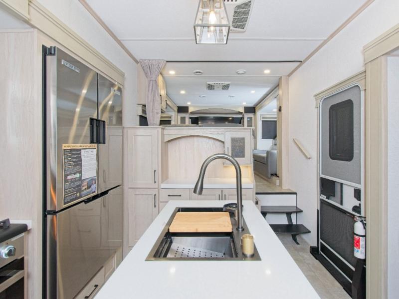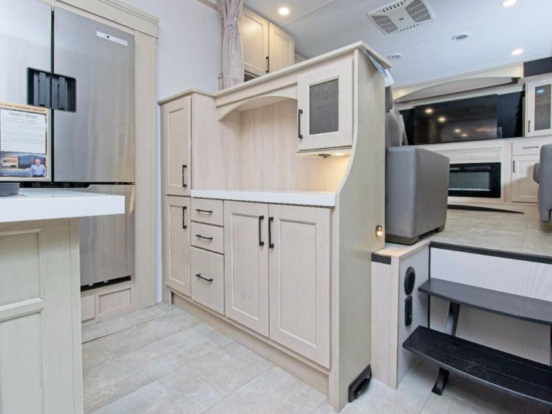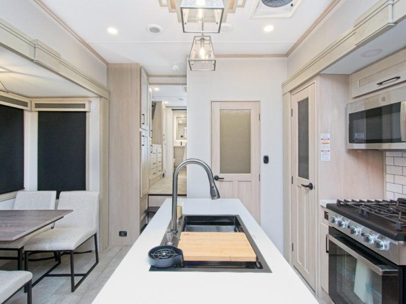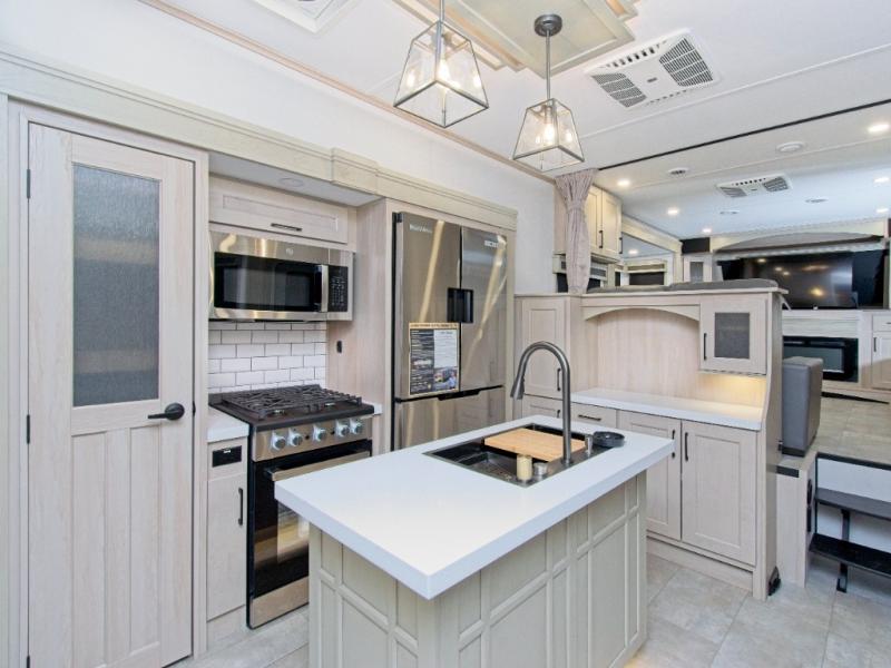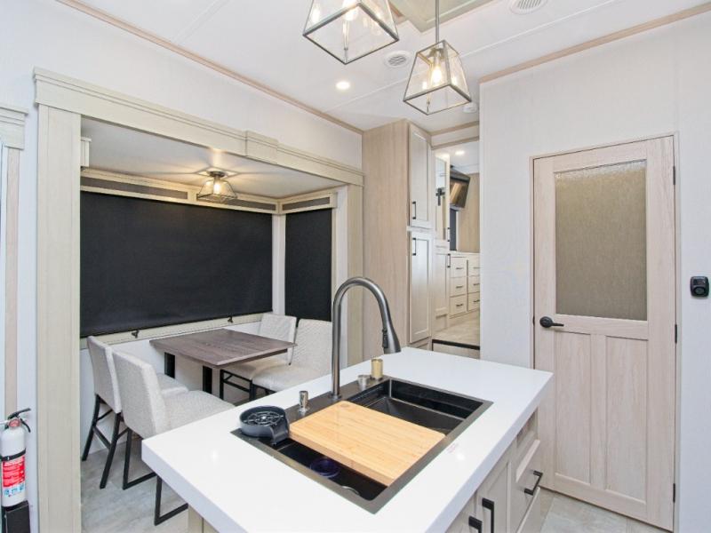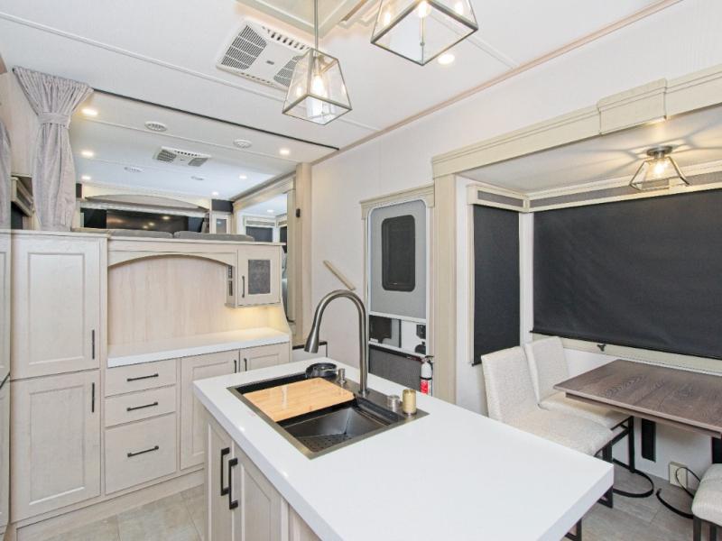 The Solitude 380FL's kitchen is nothing short of a dream. It comes fully equipped with stainless steel appliances, including a built-in oven, plus a kitchen island for extra prep space. You’ll also love the pantry and hutch with ample counter space and the free-standing dinette slide, which offers plenty of natural light and scenic views while you dine.