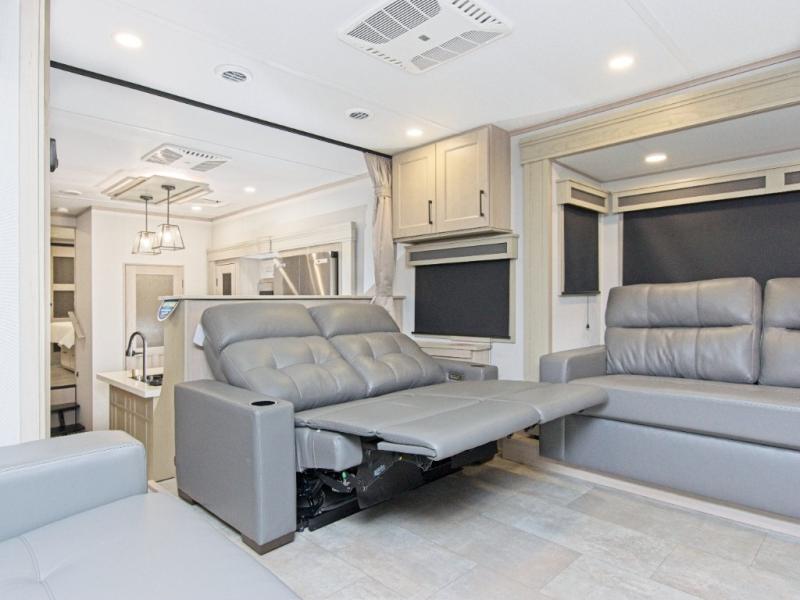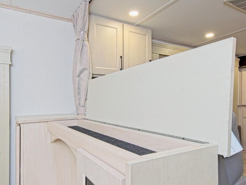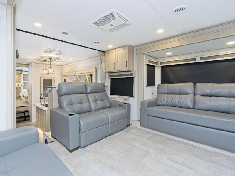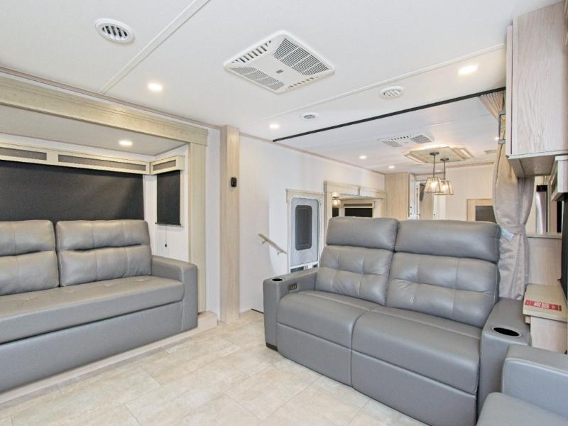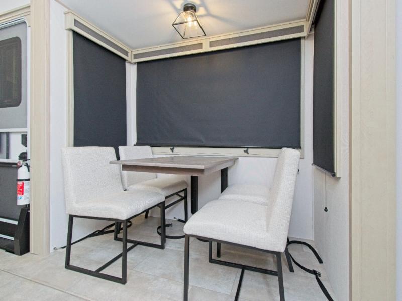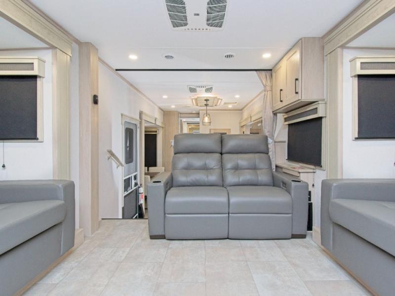Inside, the Solitude 380FL is outfitted with premium roller shades, hardwood cabinet doors, and solid surface countertops, creating a refined, residential feel that will make you feel right at home no matter where you are.