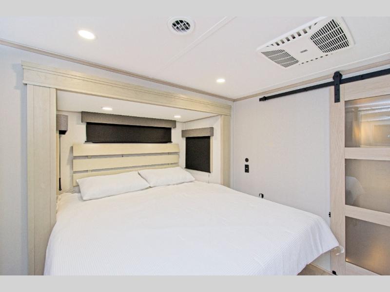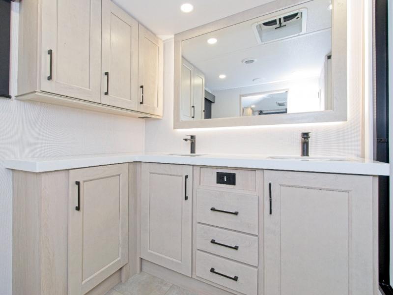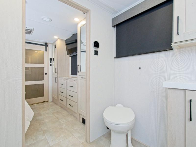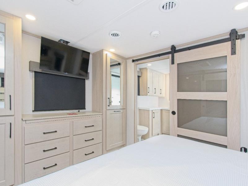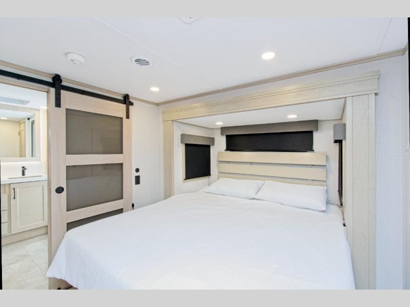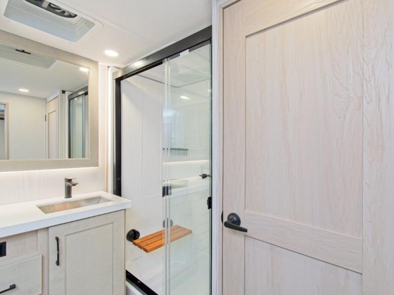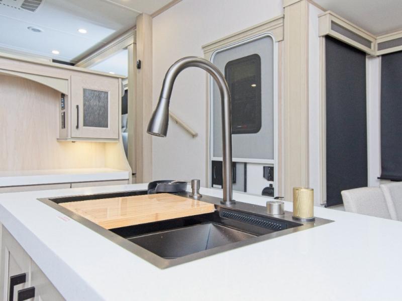 Inside, the Solitude 380FL is outfitted with premium roller shades, hardwood cabinet doors, and solid surface countertops, creating a refined, residential feel that will make you feel right at home no matter where you are.