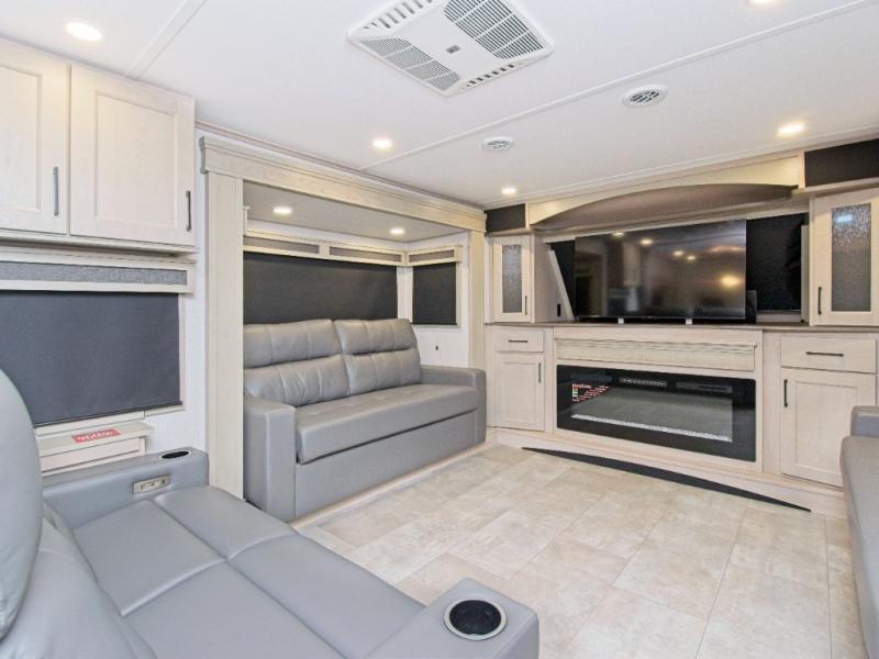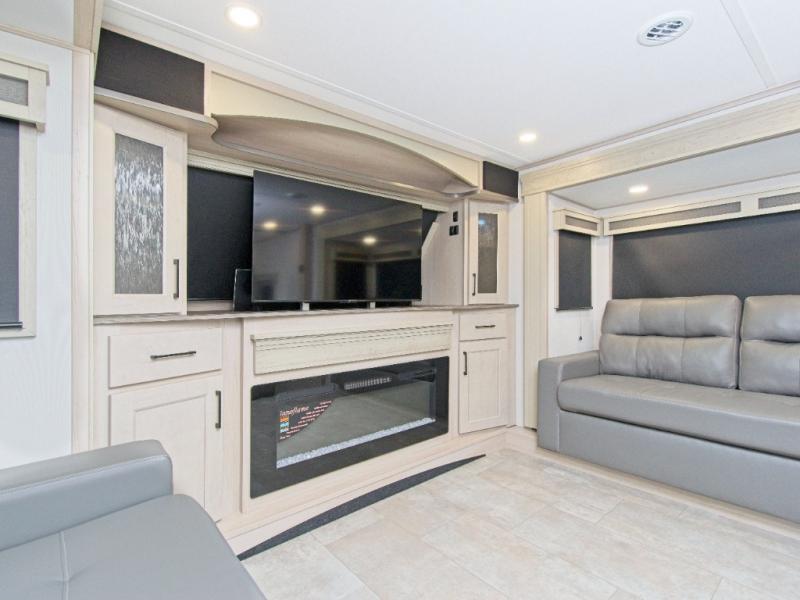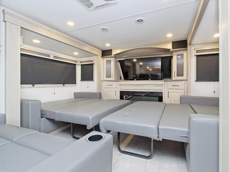 The Grand Design Solitude 380FL is designed with your comfort in mind. With five slide-outs that expand your living space, you'll have room to relax and entertain in style. The separate front living area is a highlight, featuring dual tri-fold sofas for extra sleeping space and an entertainment center with a large LED Smart TV and cozy fireplace below.