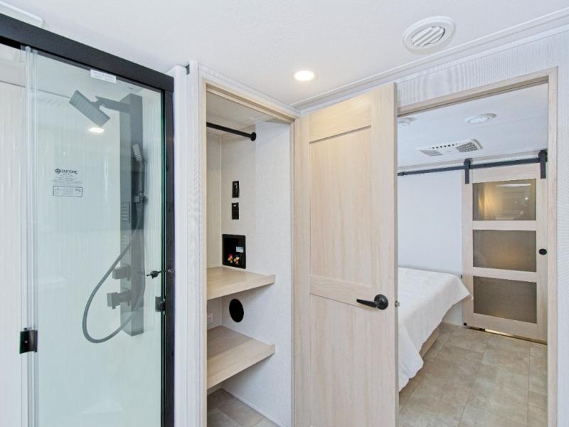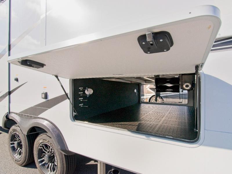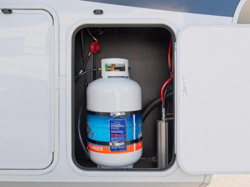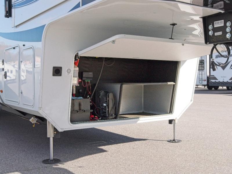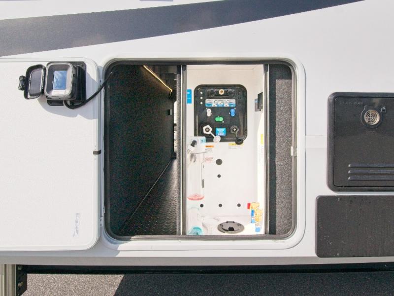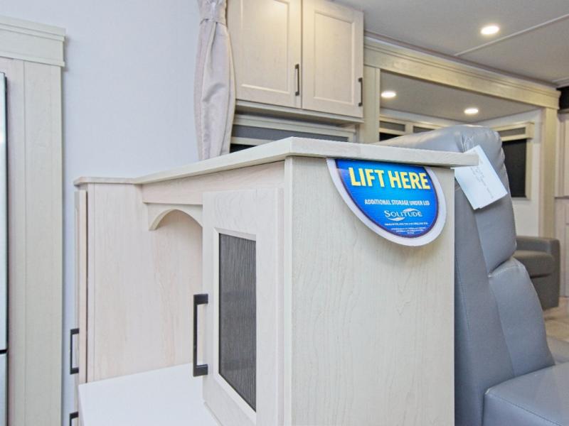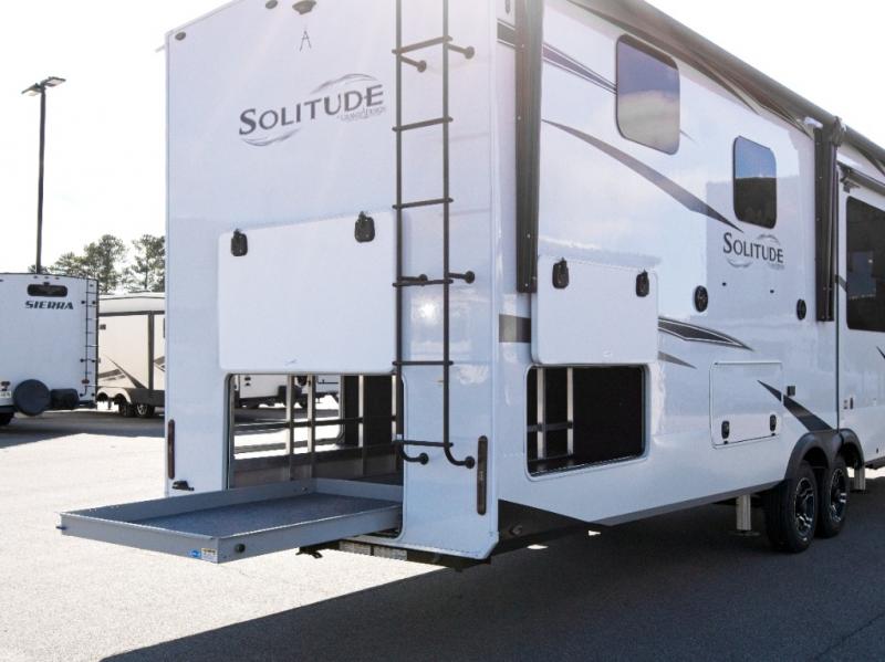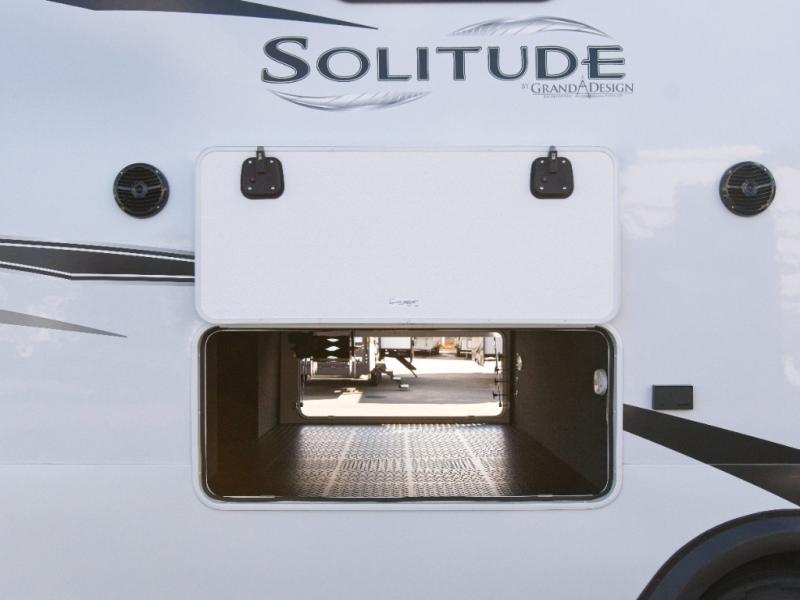 The Grand Design Solitude 380FL is packed with storage options, including exterior pass-through compartments for larger items like fishing poles, camping gear, and golf clubs. The unique rear sliding tray allows you to easily transport bulky items such as portable grills, totes, or tables, ensuring you’re ready for any adventure.