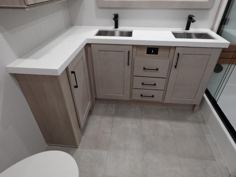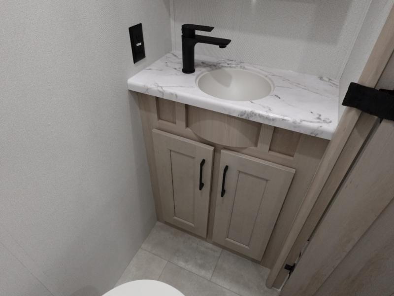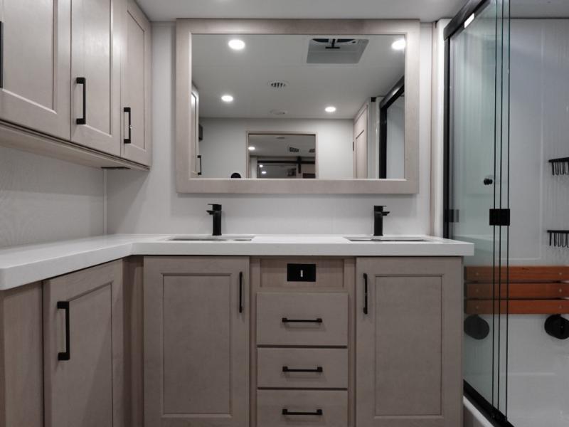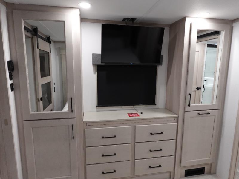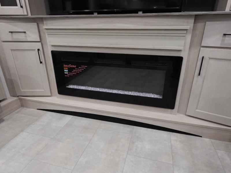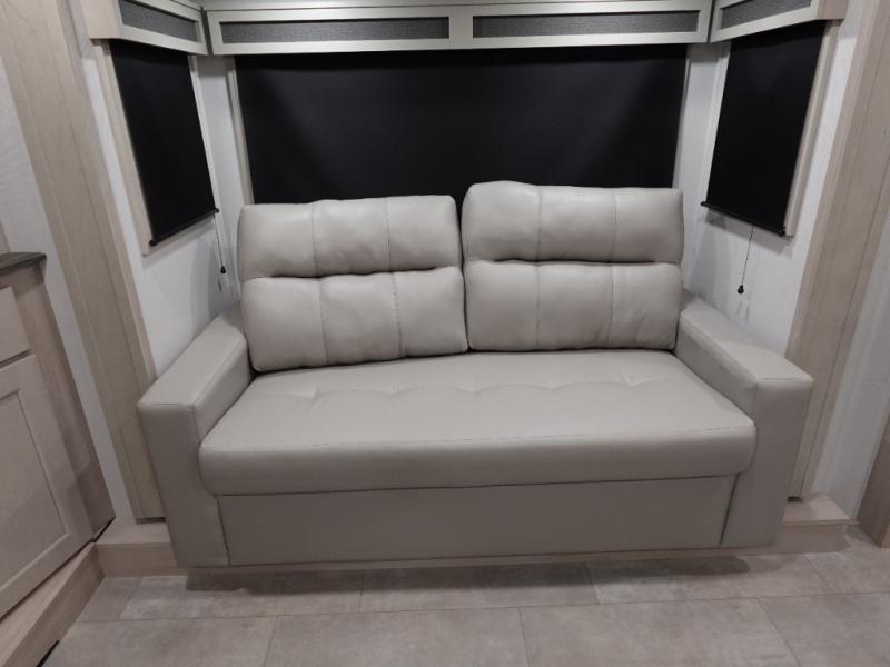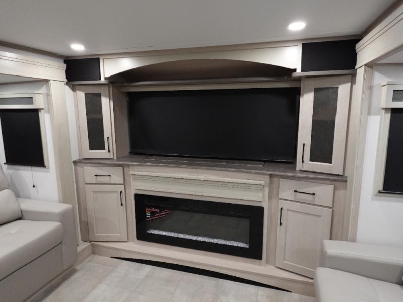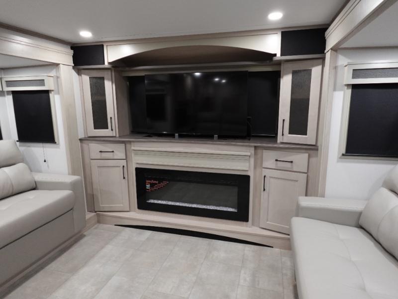 Five slide outs, a full bathroom with dual sinks, a half bath off of the kitchen, and a separate front living room and entertainment area are a few reasons you will enjoy your time spent in this fifth wheel! The separate kitchen is a dream with stainless steel appliances including a built-in oven, a pantry and hutch with counter space, a kitchen island plus a free-standing dinette slide with windows for great views. The entertainment center offers an LED Smart TV with a fireplace below and storage, and the dual opposing tri-fold sofas provide added sleeping space at night. The master bedroom includes a king bed plus space savings sliding doors that lead you to the rear full bathroom with dual sinks, linen storage, and washer/dryer prep. The exterior has several storage choices as well including a pass-through compartment for fishing poles and such, plus the unique sliding tray in the rear allows you to bring along larger items such as camping tables, portable grills, golf clubs, totes and more.
