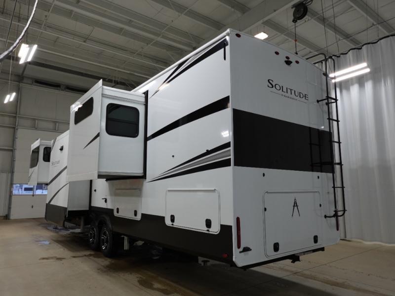 Each Solitude fifth wheel by Grand Design features a 101" wide-body construction, heavy duty 8,000 lb. axles, frameless tinted windows, and high-gloss gel coat sidewalls. You can camp year around thanks to the Weather-Tek Package that includes a 35K BTU high-capacity furnace, an all-in-one enclosed and heated utility center, and a fully enclosed underbelly with heated tanks and storage. Inside, you'll love the premium roller shades, hardwood cabinet doors, solid surface countertops, plus residential finishes throughout to make you truly feel at home. Each model also includes a MORryde CRE3000 suspension system, self adjusting brakes, and a MORryde pin box that will provide smooth towing from home to campground. Affordable luxury is possible with the Solitude fifth wheels; choose yours today!