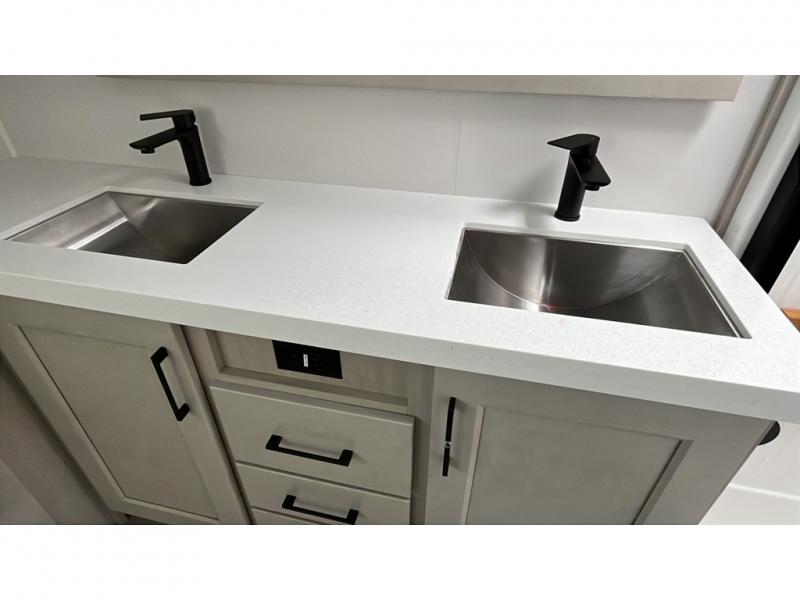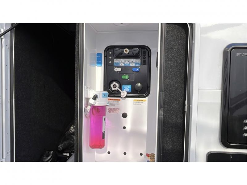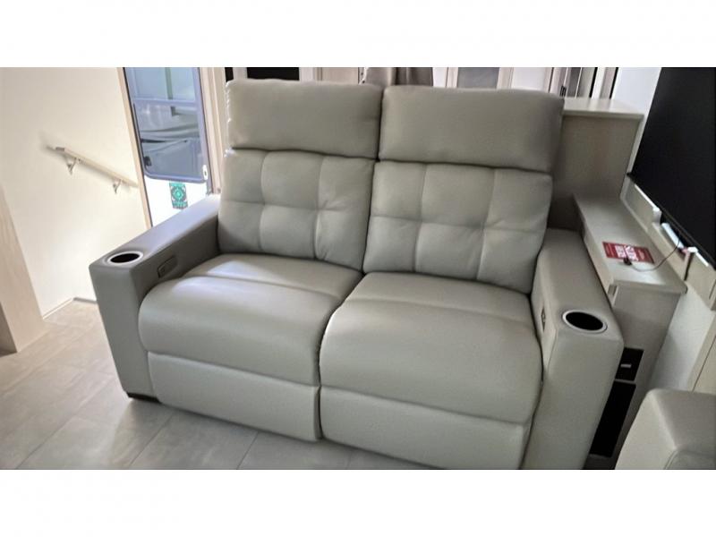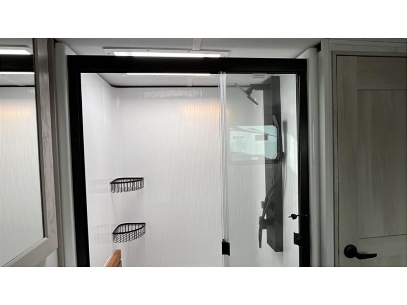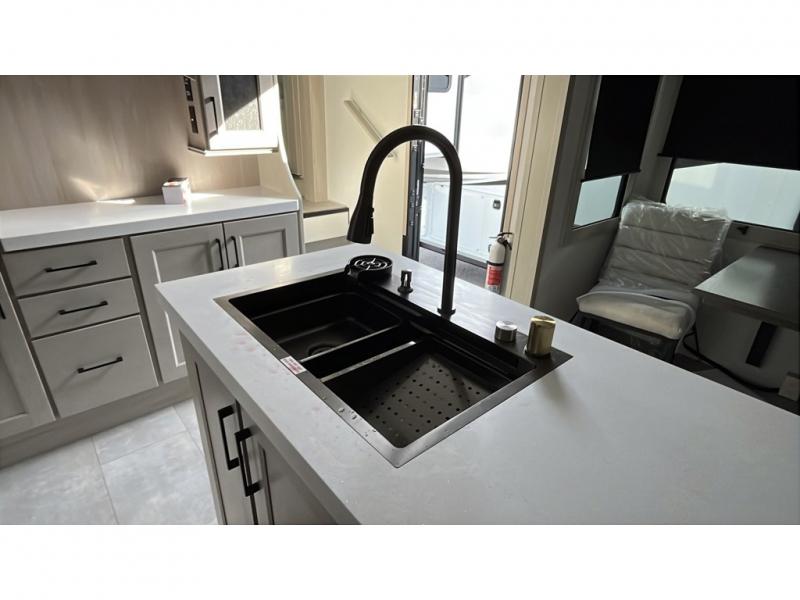 Five slide outs, a full bathroom with dual sinks, a half bath off of the kitchen, and a separate front living room and entertainment area are a few reasons you will enjoy your time spent in this fifth wheel! The separate kitchen is a dream with stainless steel appliances including a built-in oven, a pantry and hutch with counter space, a kitchen island plus a free-standing dinette slide with windows for great views. The entertainment center offers an LED Smart TV with a fireplace below and storage, and the dual opposing tri-fold sofas provide added sleeping space at night. The master bedroom includes a queen bed plus space savings sliding doors that lead you to the rear full bathroom with dual sinks, linen storage, and washer/dryer prep. The exterior has several storage choices as well including a pass-through compartment for fishing poles and such, plus the unique sliding tray in the rear allows you to bring along larger items such as camping tables, portable grills, golf clubs, totes and more.