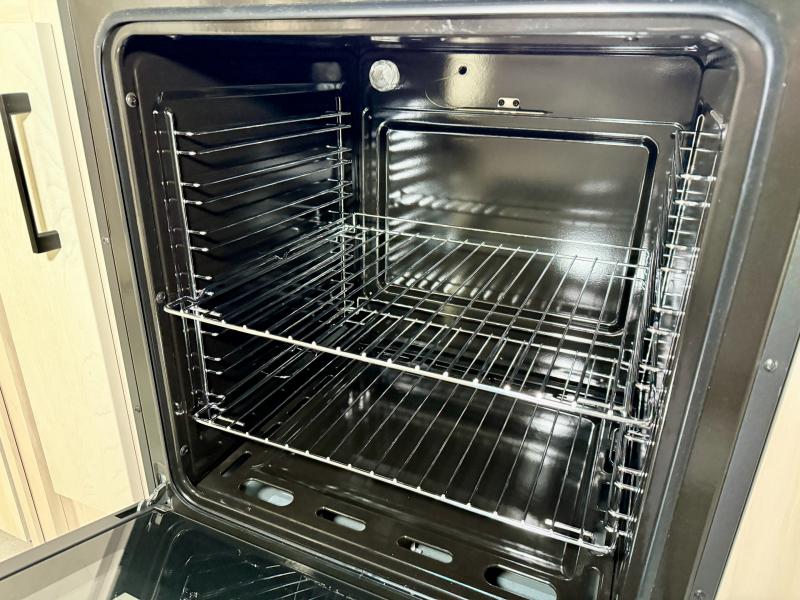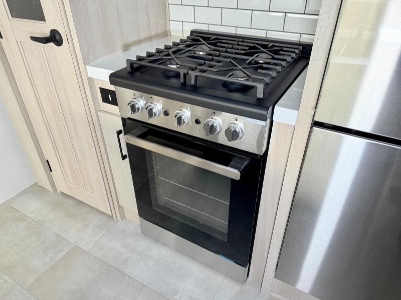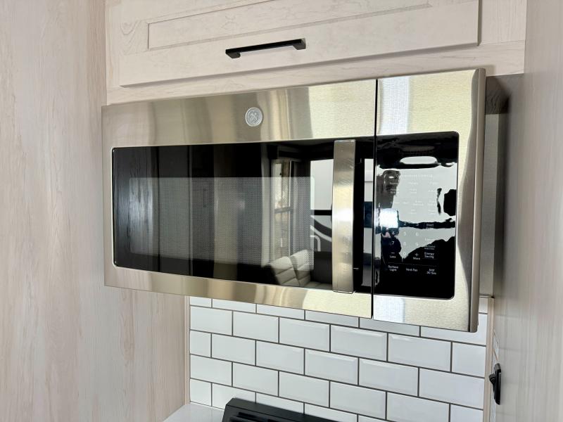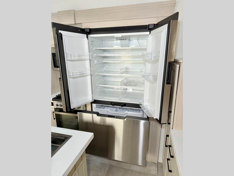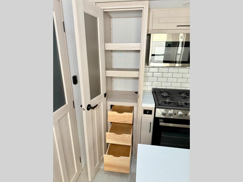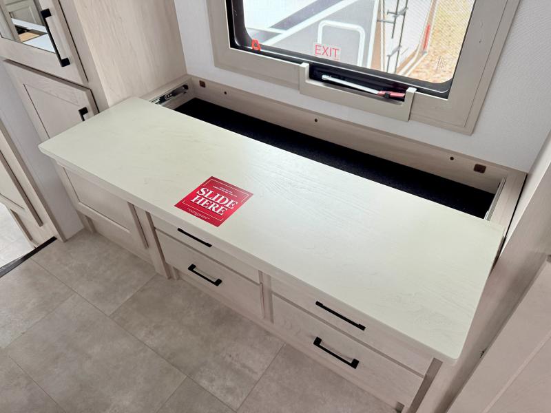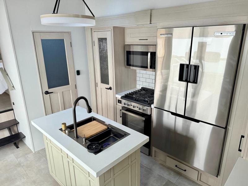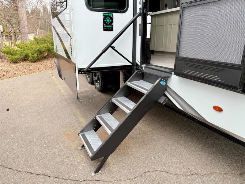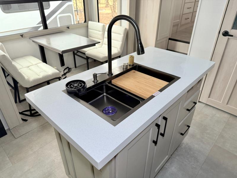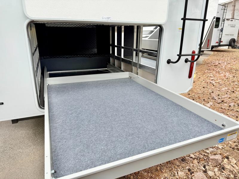 Five slide outs, a full bathroom with dual sinks, a half bath off of the kitchen, and a separate front living room and entertainment area are a few reasons you will enjoy your time spent in this fifth wheel! The separate kitchen is a dream with stainless steel appliances including a built-in oven, a pantry and hutch with counter space, a kitchen island plus a free-standing dinette slide with windows for great views. The entertainment center offers an LED Smart TV with a fireplace below and storage, and the dual opposing tri-fold sofas provide added sleeping space at night. The master bedroom includes a queen bed plus space savings sliding doors that lead you to the rear full bathroom with dual sinks, linen storage, and washer/dryer prep. The exterior has several storage choices as well including a pass-through compartment for fishing poles and such, plus the unique sliding tray in the rear allows you to bring along larger items such as camping tables, portable grills, golf clubs, totes and more.