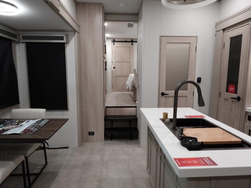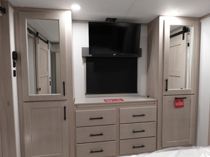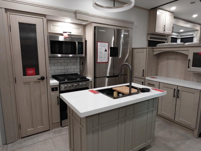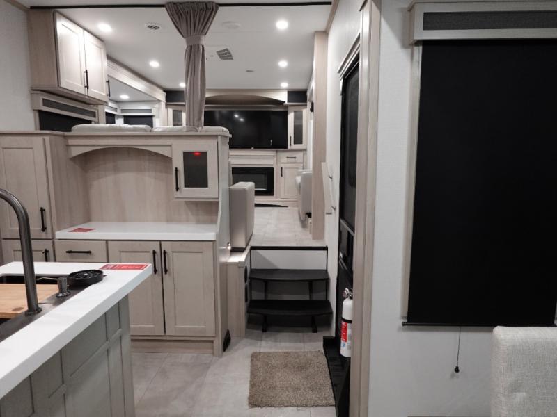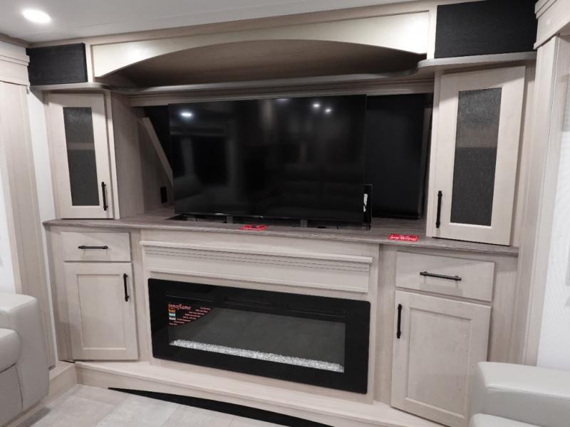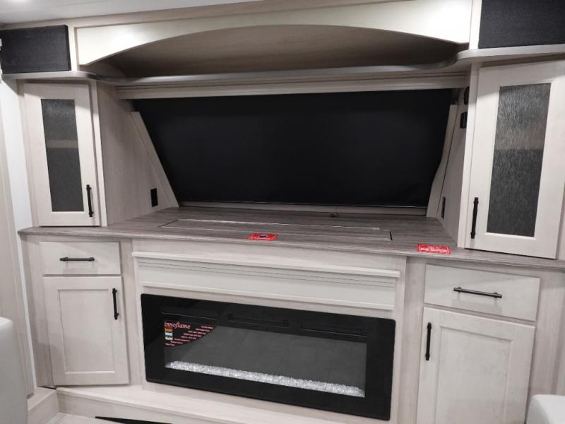 Five slide outs, a full bathroom with dual sinks, a half bath off of the kitchen, and a separate front living room and entertainment area are a few reasons you will enjoy your time spent in this fifth wheel! The separate kitchen is a dream with stainless steel appliances including a built-in oven, a pantry and hutch with counter space, a kitchen island plus a free-standing dinette slide with windows for great views. The entertainment center offers an LED Smart TV with a fireplace below and storage, and the dual opposing tri-fold sofas provide added sleeping space at night. The master bedroom includes a King bed plus space savings sliding doors that lead you to the rear full bathroom with dual sinks, linen storage, and washer/dryer prep.