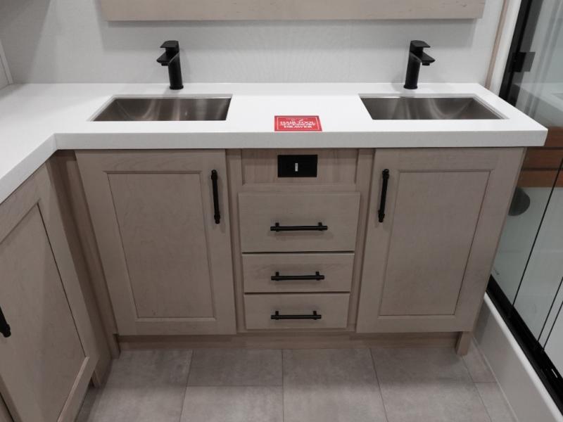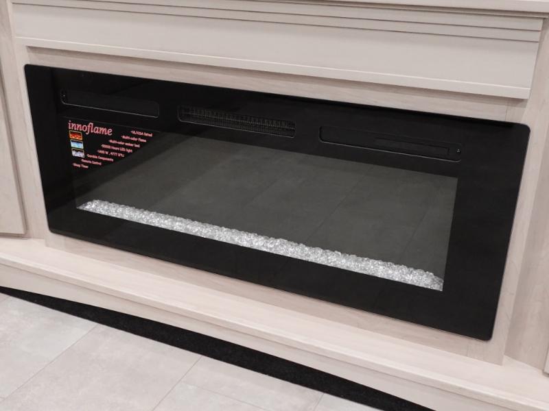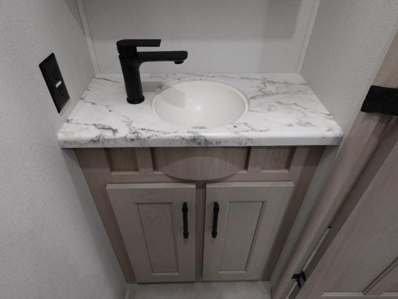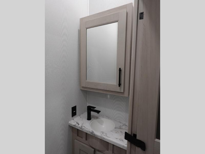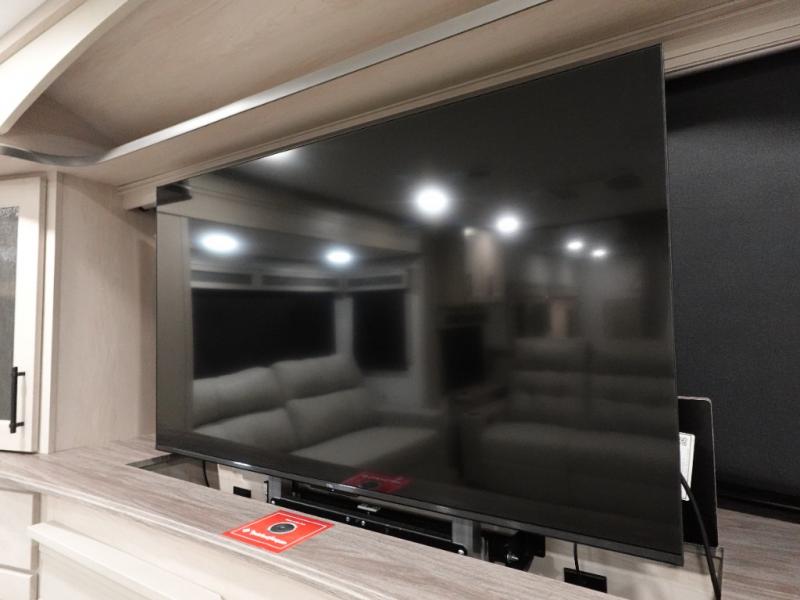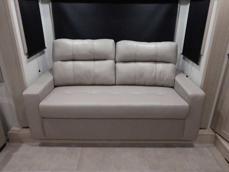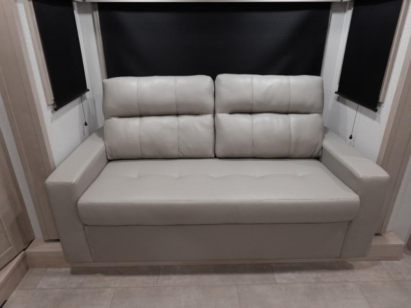 Five slide outs, a full bathroom with dual sinks, a half bath off of the kitchen, and a separate front living room and entertainment area are a few reasons you will enjoy your time spent in this fifth wheel! The separate kitchen is a dream with stainless steel appliances including a built-in oven, a pantry and hutch with counter space, a kitchen island plus a free-standing dinette slide with windows for great views. The entertainment center offers an LED Smart TV with a fireplace below and storage, and the dual opposing tri-fold sofas provide added sleeping space at night. The master bedroom includes a King bed plus space savings sliding doors that lead you to the rear full bathroom with dual sinks, linen storage, and washer/dryer prep.