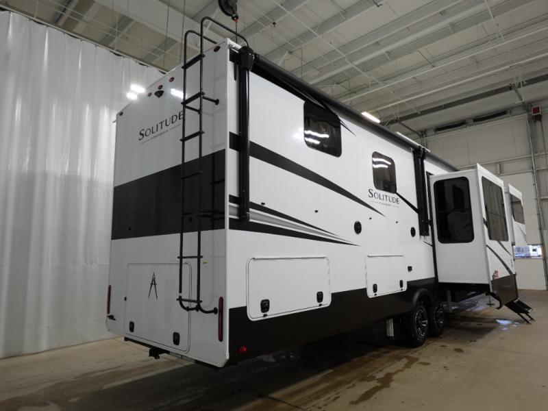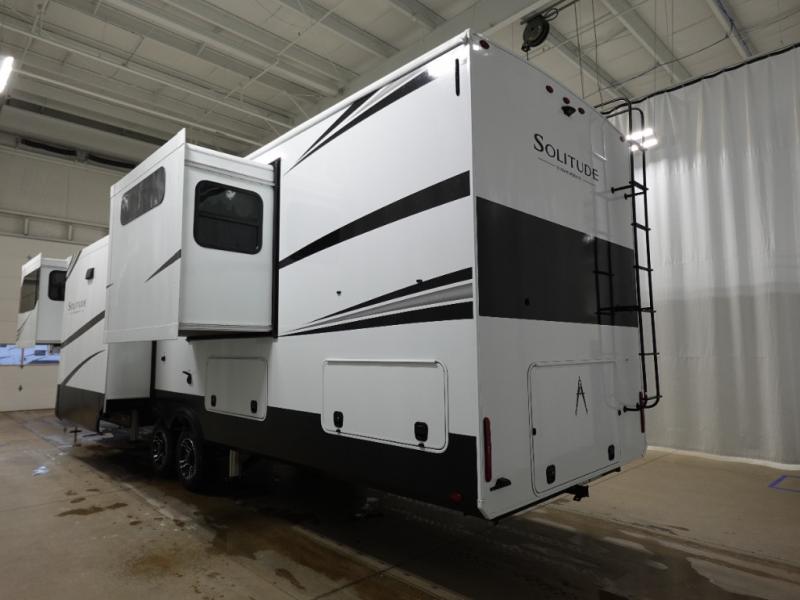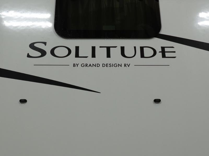 Each Solitude fifth wheel by Grand Design features a 101" wide-body construction, heavy duty 8,000 lb. axles, frameless tinted windows, and high-gloss gel coat sidewalls. You can camp year around thanks to the Weather-Tek Package that includes a 35K BTU high-capacity furnace, an all-in-one enclosed and heated utility center, and a fully enclosed underbelly with heated tanks and storage. Inside, you'll love the premium roller shades, hardwood cabinet doors, solid surface countertops, plus residential finishes throughout to make you truly feel at home. Each model also includes a MORryde CRE3000 suspension system, self adjusting brakes, and a MORryde pin box that will provide smooth towing from home to campground. Affordable luxury is possible with the Solitude fifth wheels; choose yours today!