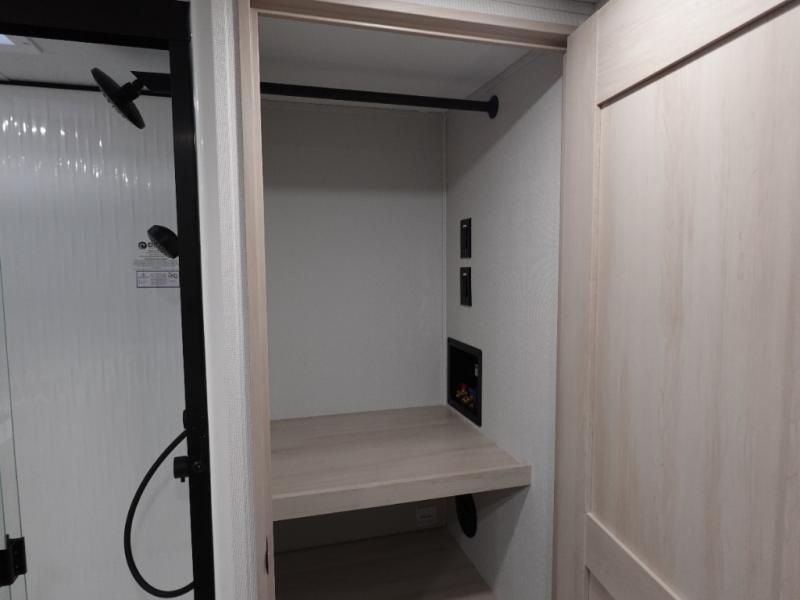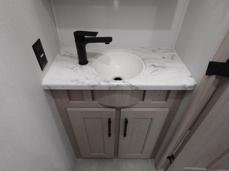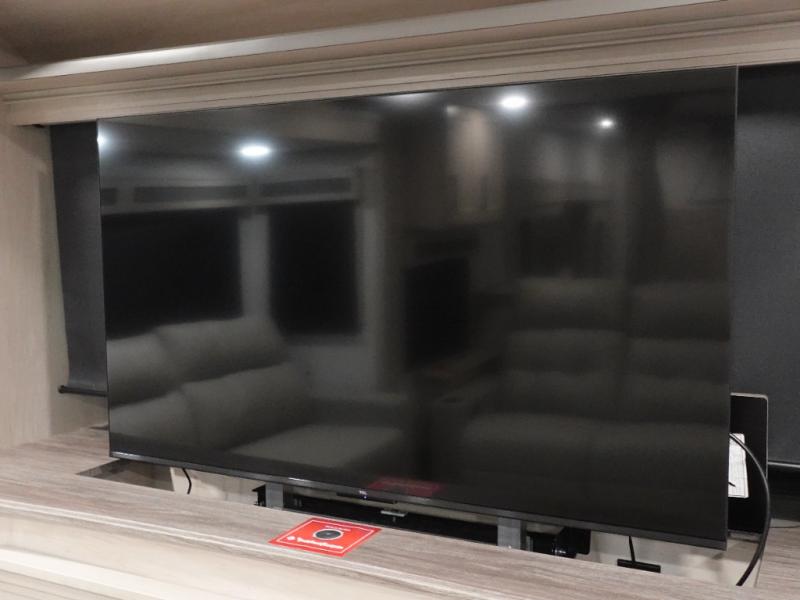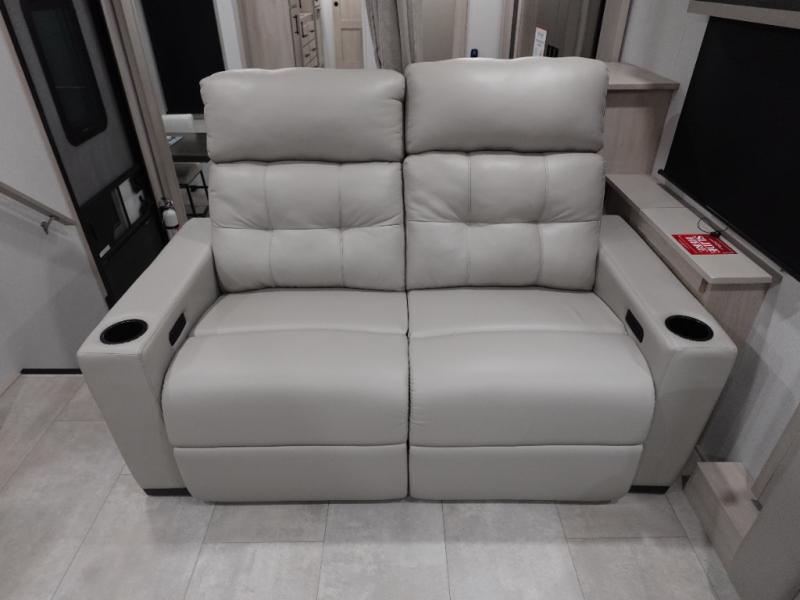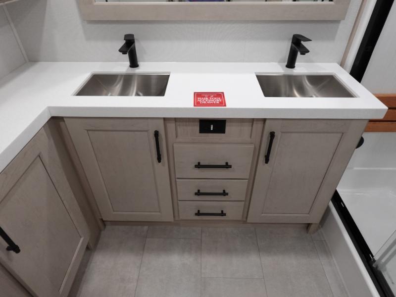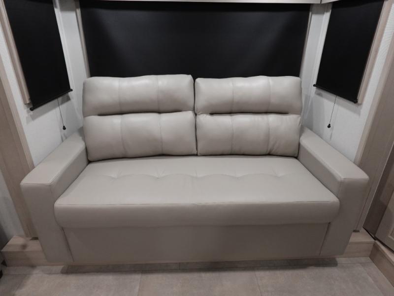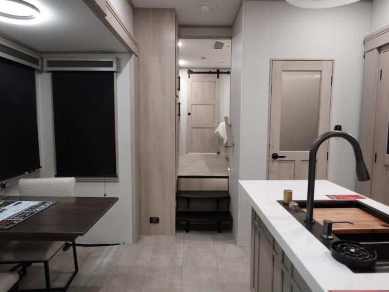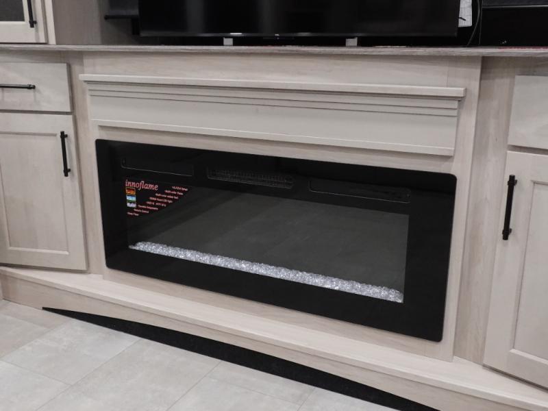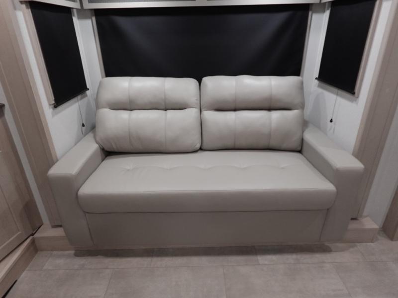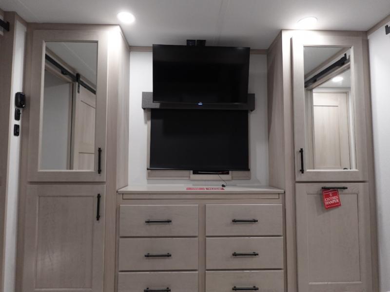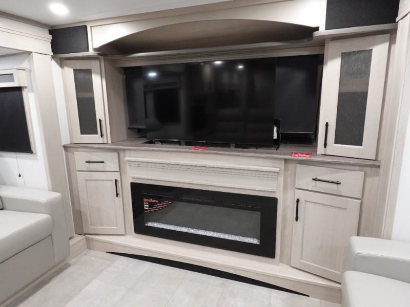 Five slide outs, a full bathroom with dual sinks, a half bath off of the kitchen, and a separate front living room and entertainment area are a few reasons you will enjoy your time spent in this fifth wheel! The separate kitchen is a dream with stainless steel appliances including a built-in oven, a pantry and hutch with counter space, a kitchen island plus a free-standing dinette slide with windows for great views. The entertainment center offers an LED Smart TV with a fireplace below and storage, and the dual opposing tri-fold sofas provide added sleeping space at night. The master bedroom includes a queen bed plus space savings sliding doors that lead you to the rear full bathroom with dual sinks, linen storage, and washer/dryer prep. The exterior has several storage choices as well including a pass-through compartment for fishing poles and such, plus the unique sliding tray in the rear allows you to bring along larger items such as camping tables, portable grills, golf clubs, totes and more.