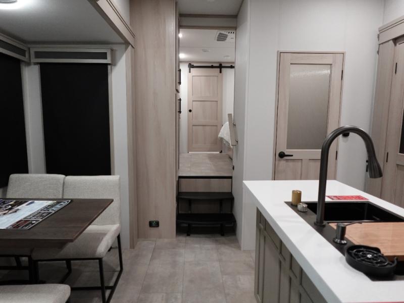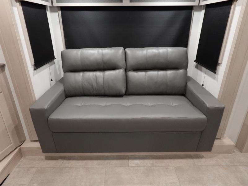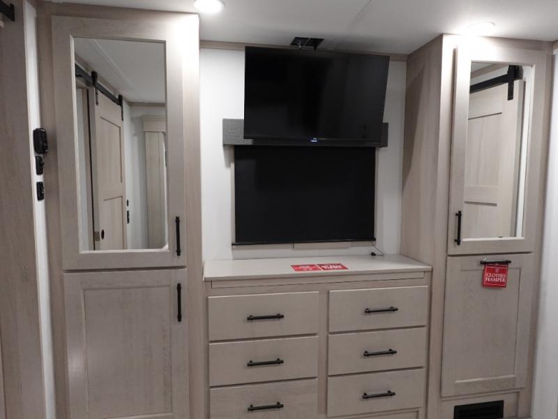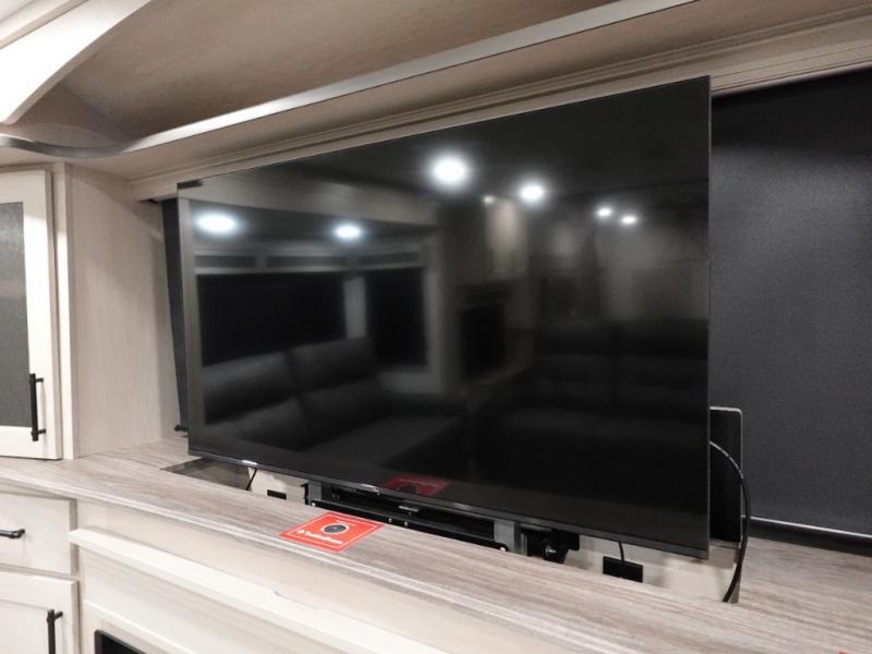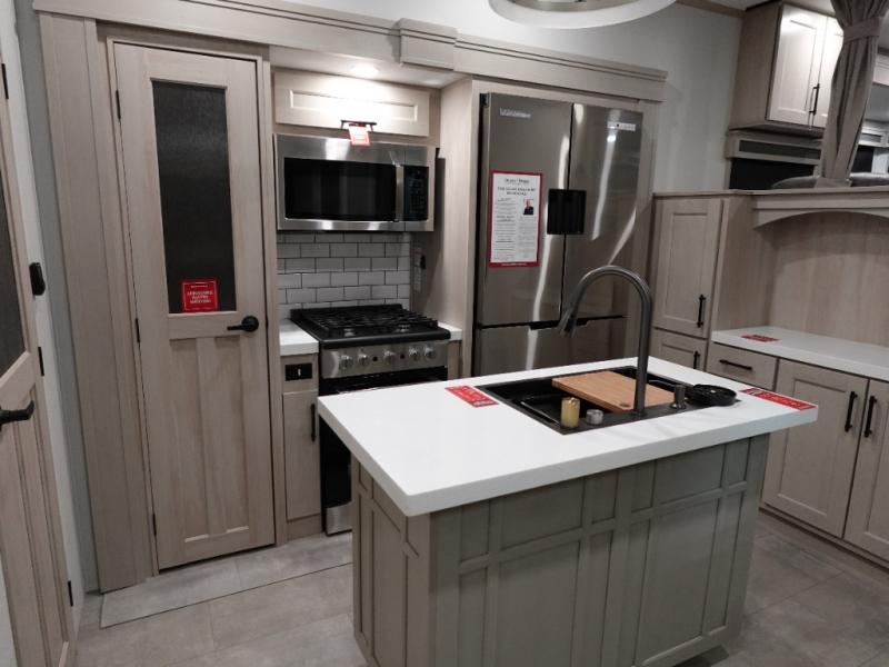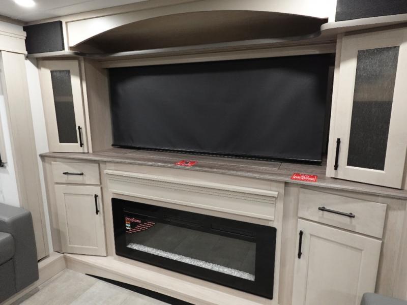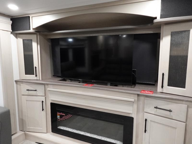Five slide outs, a full bathroom with dual sinks, a half bath off of the kitchen, and a separate front living room and entertainment area are a few reasons you will enjoy your time spent in this fifth wheel! The separate kitchen is a dream with stainless steel appliances including a built-in oven, a pantry and hutch with counter space, a kitchen island plus a free-standing dinette slide with windows for great views. The entertainment center offers an LED Smart TV with a fireplace below and storage, and the dual opposing tri-fold sofas provide added sleeping space at night. The master bedroom includes a queen bed plus space savings sliding doors that lead you to the rear full bathroom with dual sinks, linen storage, and washer/dryer prep. The exterior has several storage choices as well including a pass-through compartment for fishing poles and such, plus the unique sliding tray in the rear allows you to bring along larger items such as camping tables, portable grills, golf clubs, totes and more.