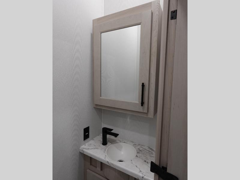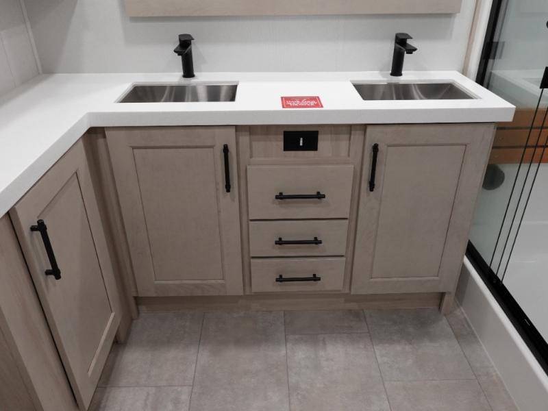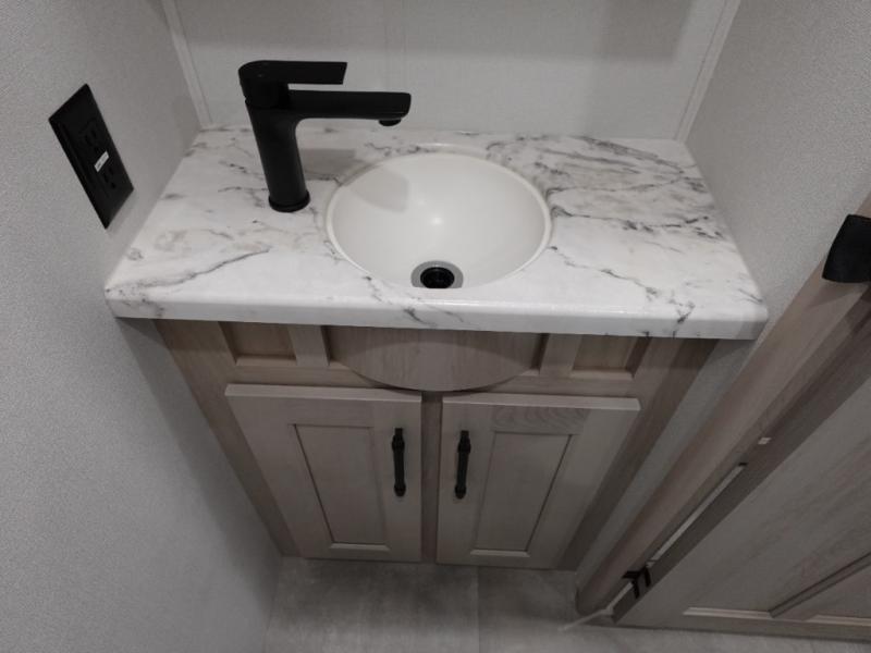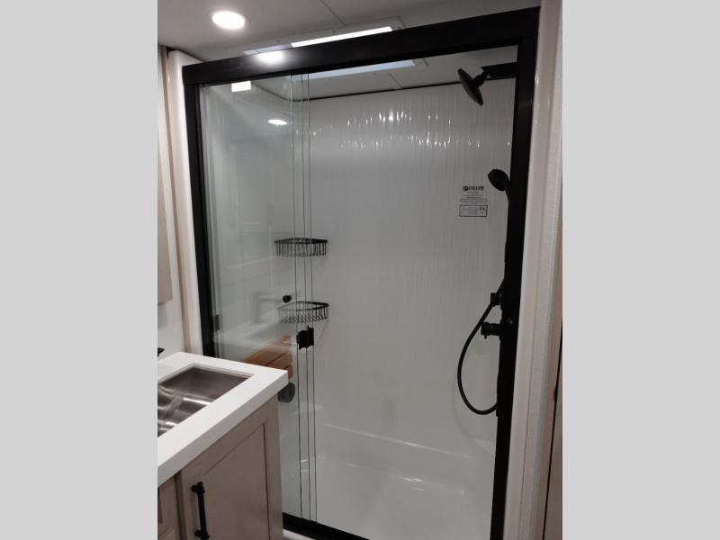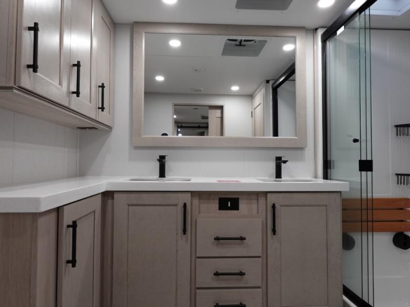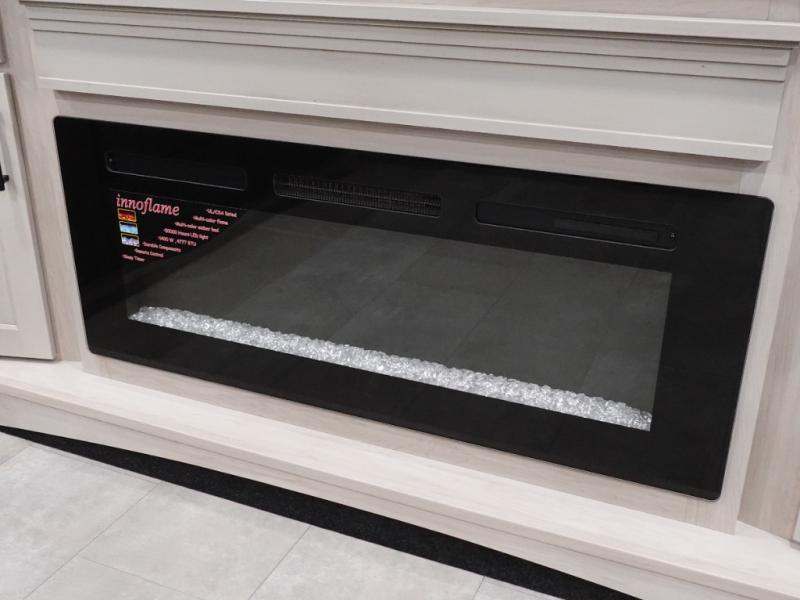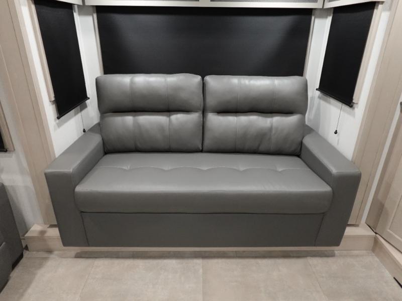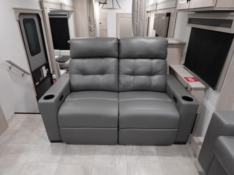 Five slide outs, a full bathroom with dual sinks, a half bath off of the kitchen, and a separate front living room and entertainment area are a few reasons you will enjoy your time spent in this fifth wheel! The separate kitchen is a dream with stainless steel appliances including a built-in oven, a pantry and hutch with counter space, a kitchen island plus a free-standing dinette slide with windows for great views. The entertainment center offers an LED Smart TV with a fireplace below and storage, and the dual opposing tri-fold sofas provide added sleeping space at night. The master bedroom includes a queen bed plus space savings sliding doors that lead you to the rear full bathroom with dual sinks, linen storage, and washer/dryer prep. The exterior has several storage choices as well including a pass-through compartment for fishing poles and such, plus the unique sliding tray in the rear allows you to bring along larger items such as camping tables, portable grills, golf clubs, totes and more.