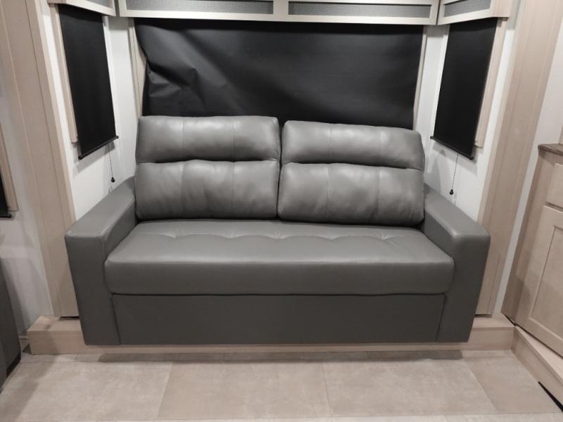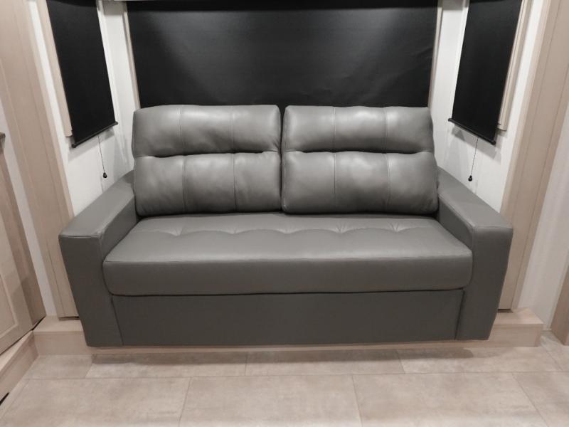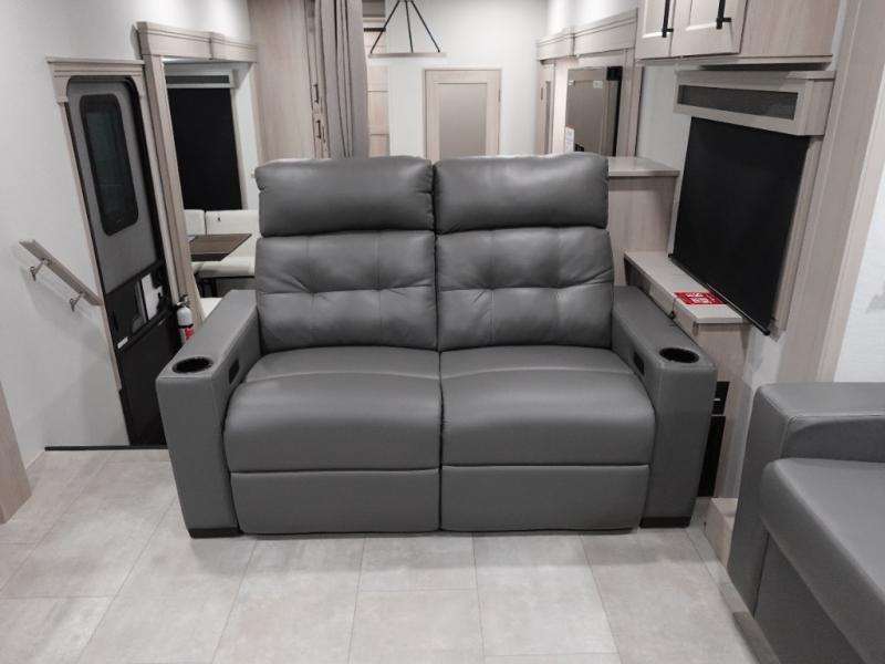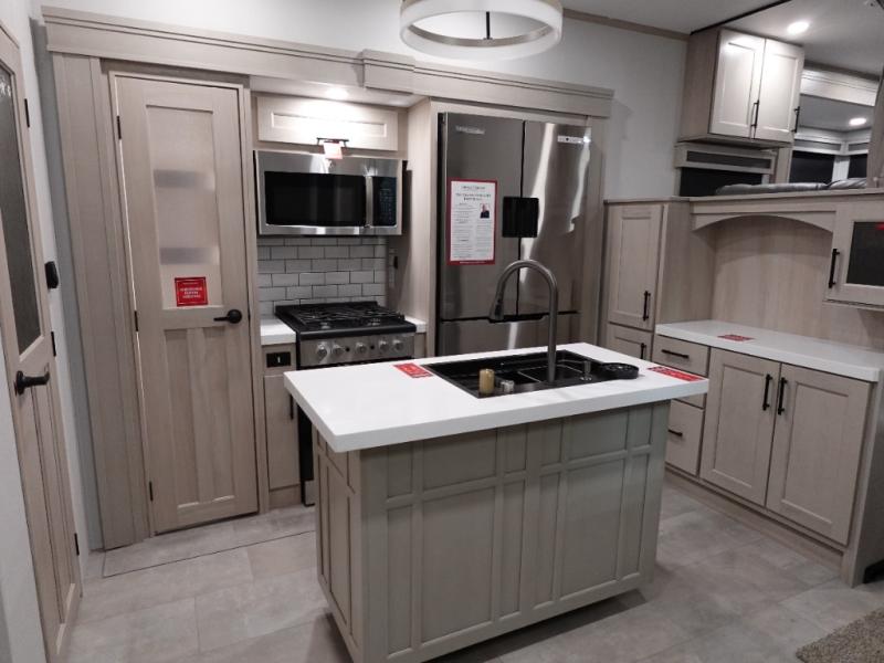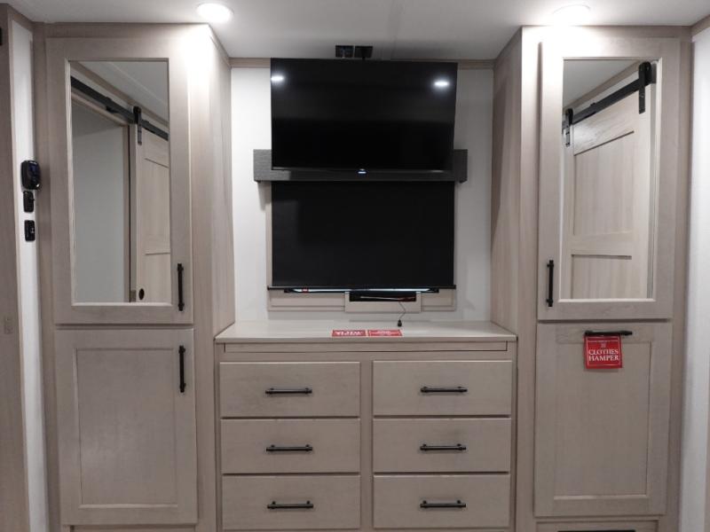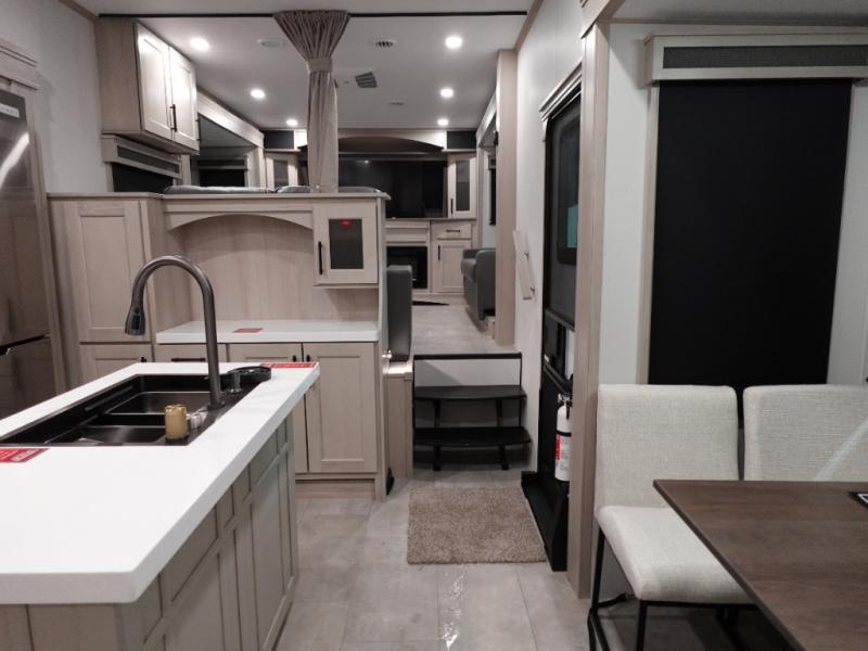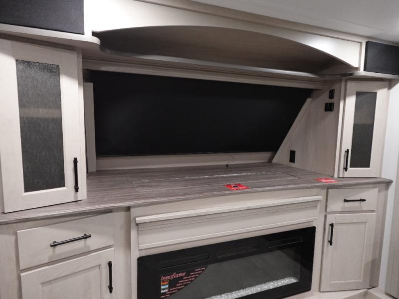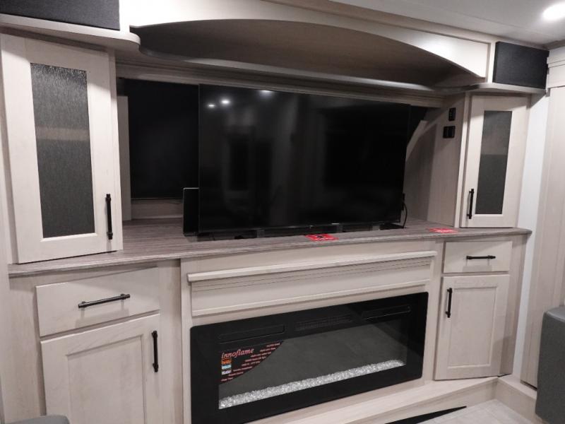 Five slide outs, a full bathroom with dual sinks, a half bath off of the kitchen, and a separate front living room and entertainment area are a few reasons you will enjoy your time spent in this fifth wheel! The separate kitchen is a dream with stainless steel appliances including a built-in oven, a pantry and hutch with counter space, a kitchen island plus a free-standing dinette slide with windows for great views. The entertainment center offers an LED Smart TV with a fireplace below and storage, and the dual opposing tri-fold sofas provide added sleeping space at night. The master bedroom includes a queen bed plus space savings sliding doors that lead you to the rear full bathroom with dual sinks, linen storage, and washer/dryer prep. The exterior has several storage choices as well including a pass-through compartment for fishing poles and such, plus the unique sliding tray in the rear allows you to bring along larger items such as camping tables, portable grills, golf clubs, totes and more.