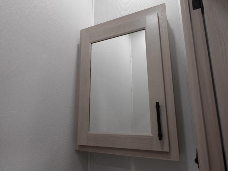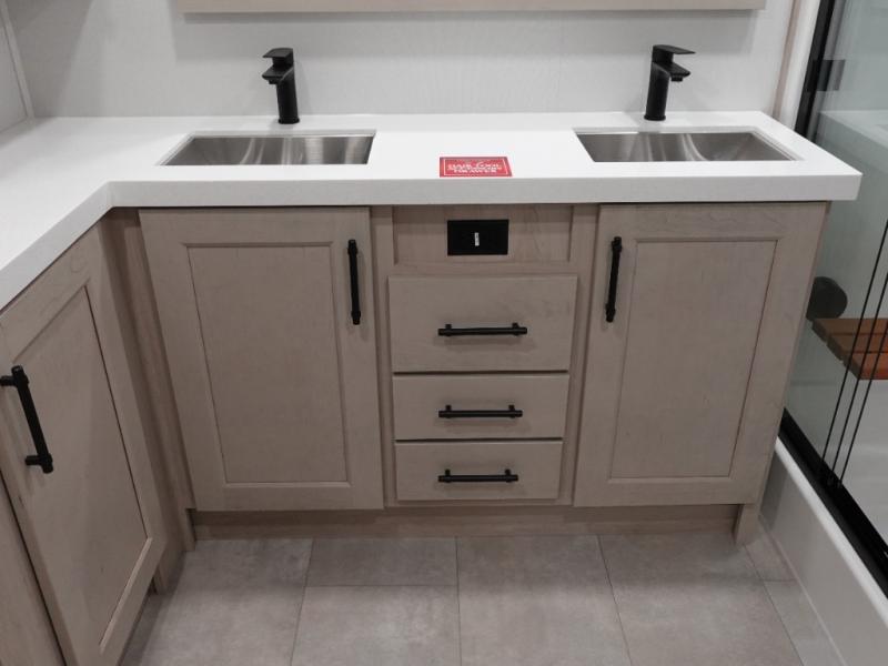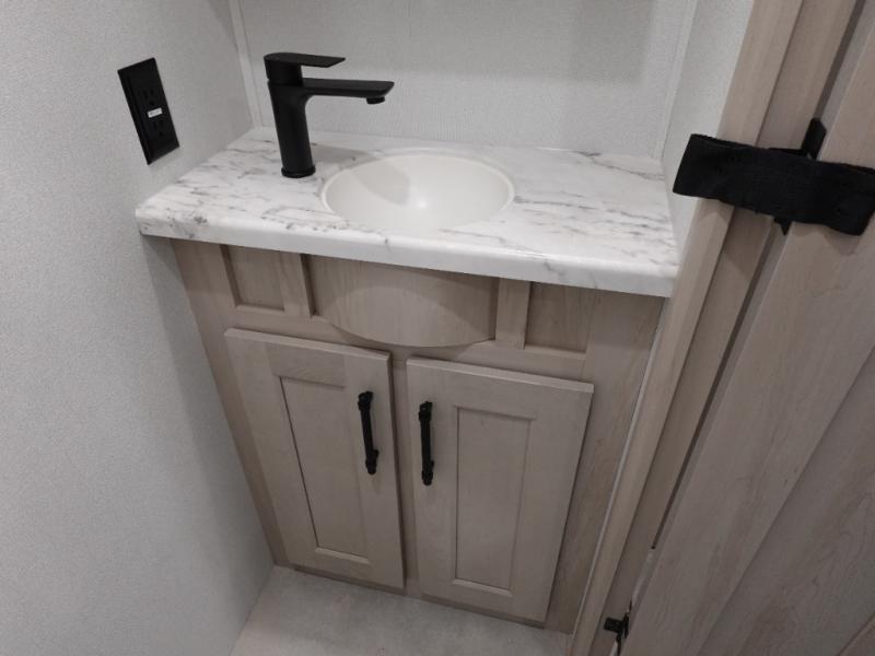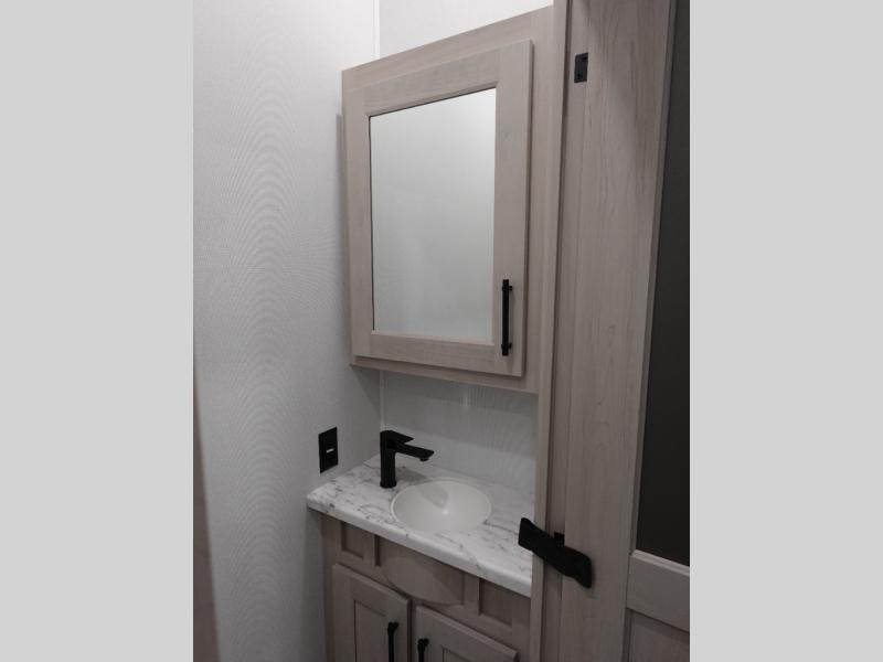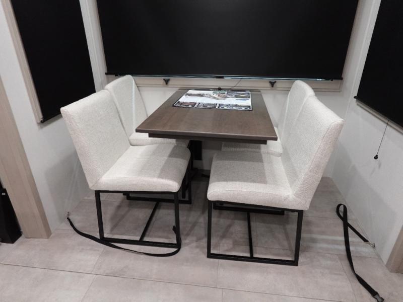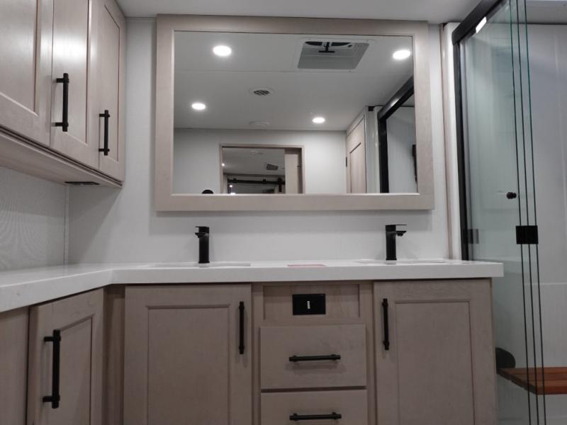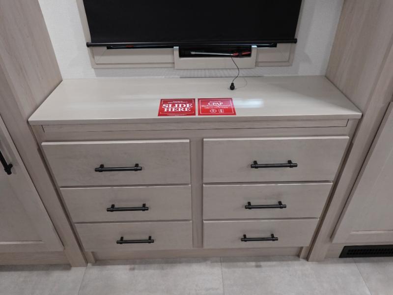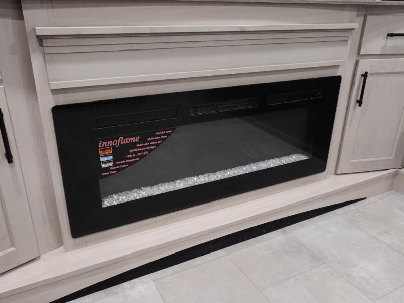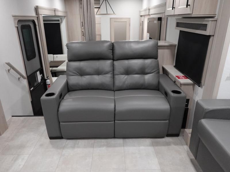 Five slide outs, a full bathroom with dual sinks, a half bath off of the kitchen, and a separate front living room and entertainment area are a few reasons you will enjoy your time spent in this fifth wheel! The separate kitchen is a dream with stainless steel appliances including a built-in oven, a pantry and hutch with counter space, a kitchen island plus a free-standing dinette slide with windows for great views. The entertainment center offers an LED Smart TV with a fireplace below and storage, and the dual opposing tri-fold sofas provide added sleeping space at night. The master bedroom includes a queen bed plus space savings sliding doors that lead you to the rear full bathroom with dual sinks, linen storage, and washer/dryer prep. The exterior has several storage choices as well including a pass-through compartment for fishing poles and such, plus the unique sliding tray in the rear allows you to bring along larger items such as camping tables, portable grills, golf clubs, totes and more.