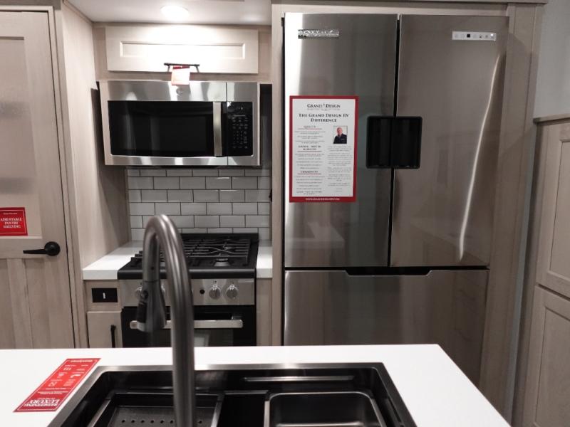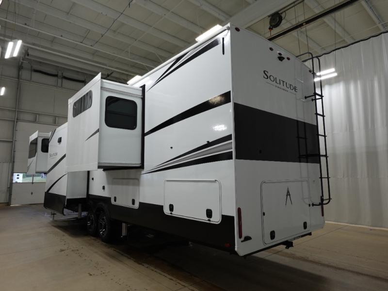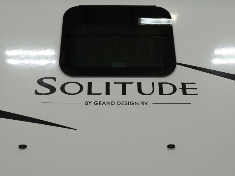 Each Solitude fifth wheel by Grand Design features a 101" wide-body construction, heavy duty 8,000 lb. axles, frameless tinted windows, and high-gloss gel coat sidewalls. You can camp year around thanks to the Weather-Tek Package that includes a 35K BTU high-capacity furnace, an all-in-one enclosed and heated utility center, and a fully enclosed underbelly with heated tanks and storage. Inside, you'll love the premium roller shades, hardwood cabinet doors, solid surface countertops, plus residential finishes throughout to make you truly feel at home. Each model also includes a MORryde CRE3000 suspension system, self adjusting brakes, and a MORryde pin box that will provide smooth towing from home to campground. Affordable luxury is possible with the Solitude fifth wheels; choose yours today!