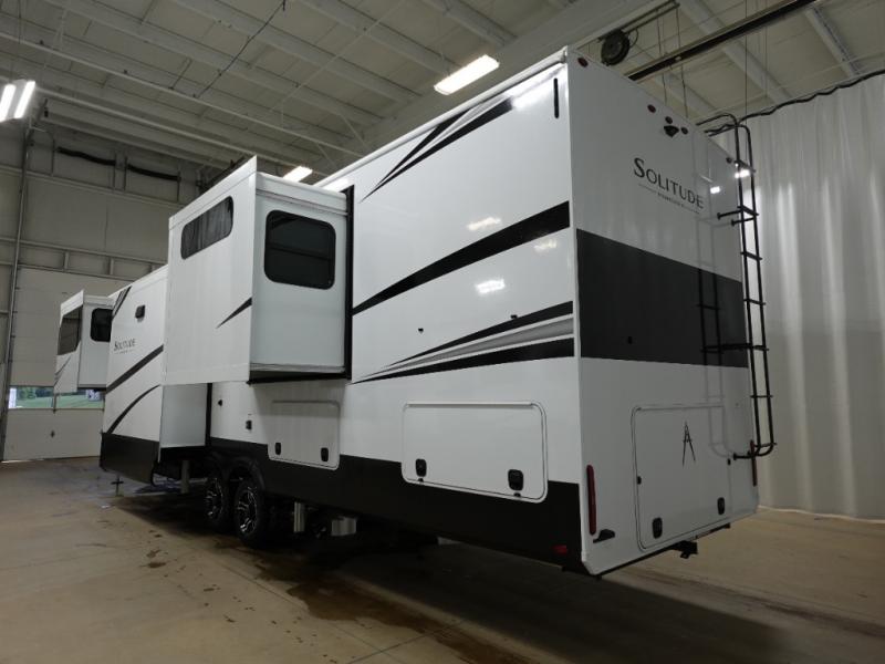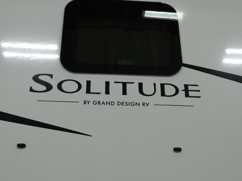 Each Solitude fifth wheel by Grand Design features a 101" wide-body construction, heavy duty 8,000 lb. axles, frameless tinted windows, and high-gloss gel coat sidewalls. You can camp year around thanks to the Weather-Tek Package that includes a 35K BTU high-capacity furnace, an all-in-one enclosed and heated utility center, and a fully enclosed underbelly with heated tanks and storage. Inside, you'll love the premium roller shades, hardwood cabinet doors, solid surface countertops, plus residential finishes throughout to make you truly feel at home. Each model also includes a MORryde CRE3000 suspension system, self adjusting brakes, and a MORryde pin box that will provide smooth towing from home to campground. Affordable luxury is possible with the Solitude fifth wheels; choose yours today!