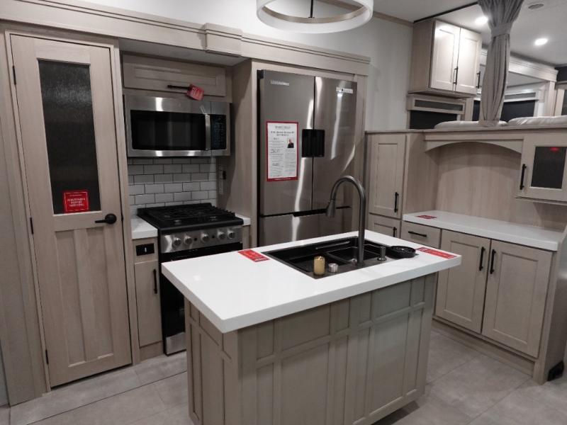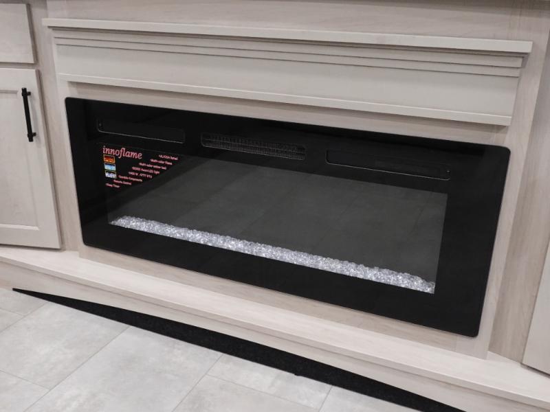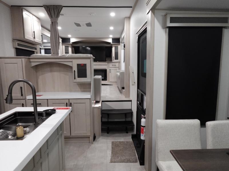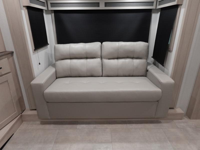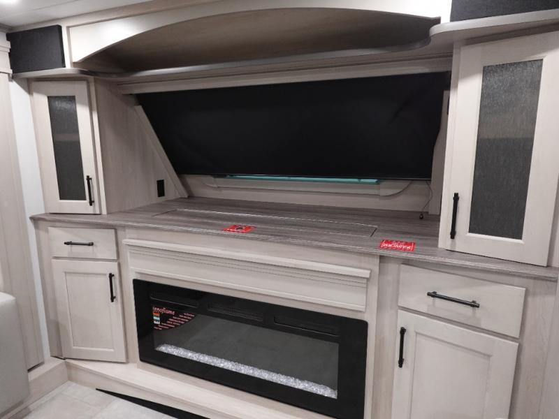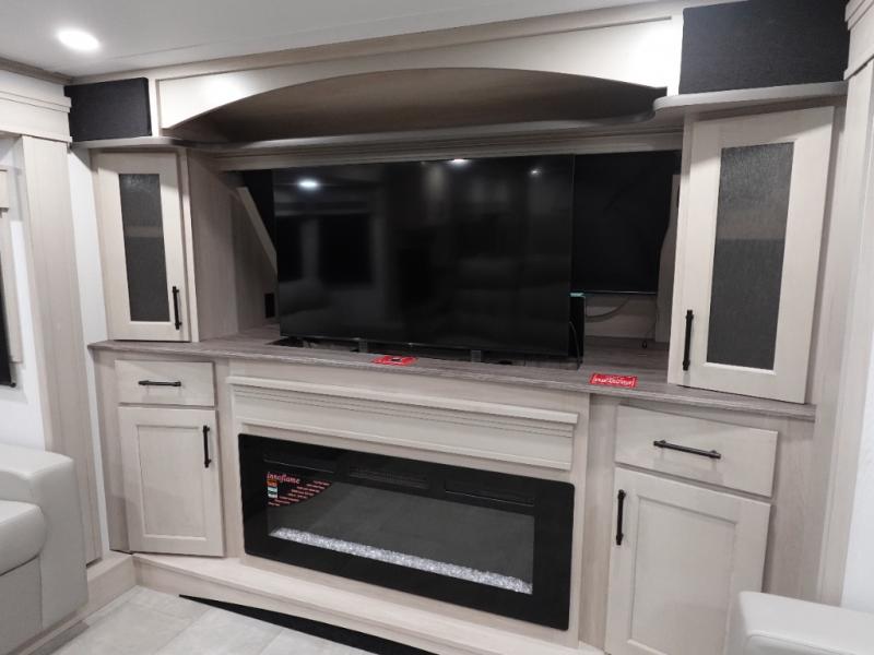 Five slide outs, a full bathroom with dual sinks, a half bath off of the kitchen, and a separate front living room and entertainment area are a few reasons you will enjoy your time spent in this fifth wheel! The separate kitchen is a dream with stainless steel appliances including a built-in oven, a pantry and hutch with counter space, a kitchen island plus a free-standing dinette slide with windows for great views. The entertainment center offers an LED Smart TV with a fireplace below and storage, and the dual opposing tri-fold sofas provide added sleeping space at night. The master bedroom includes a private bed plus space savings sliding doors that lead you to the rear full bathroom with dual sinks, linen storage, and washer/dryer prep. The exterior has several storage choices as well including a pass-through compartment for fishing poles and such, plus the unique sliding tray in the rear allows you to bring along larger items such as camping tables, portable grills, golf clubs, totes and more.