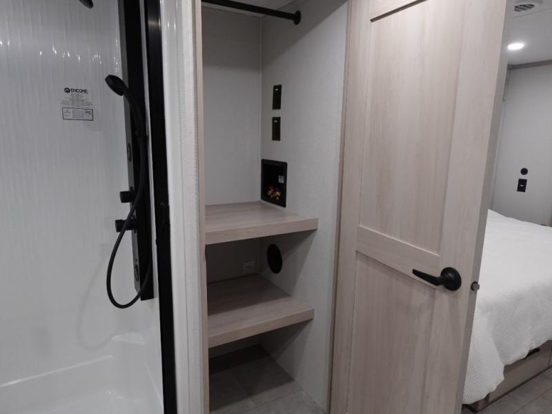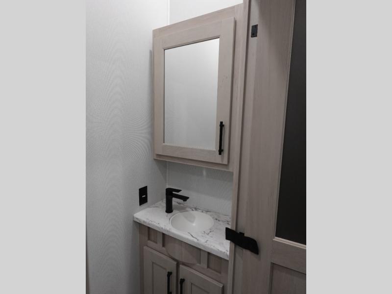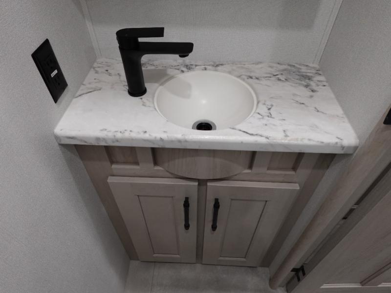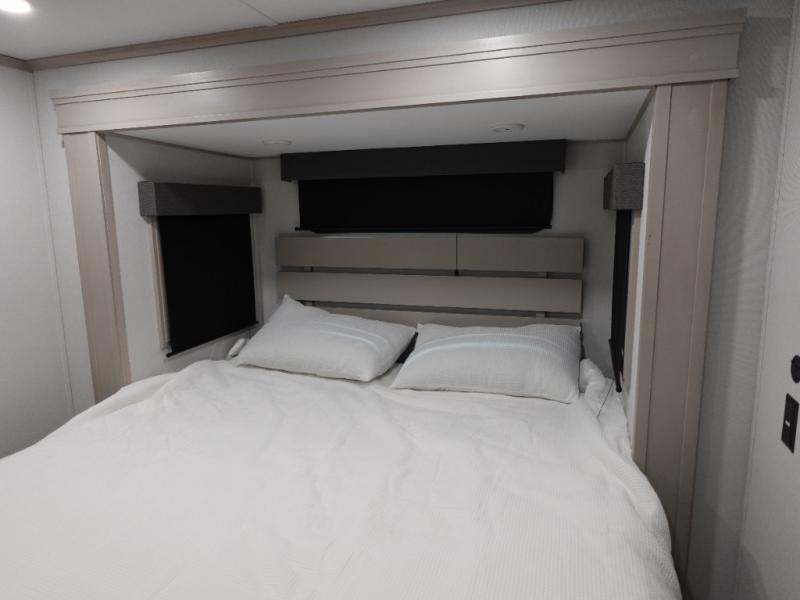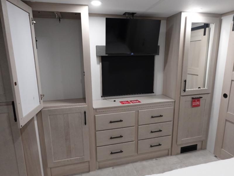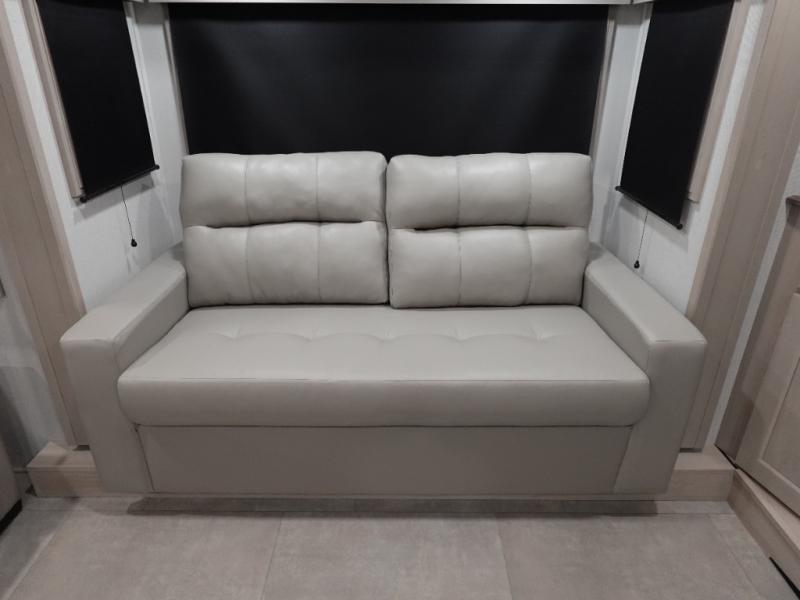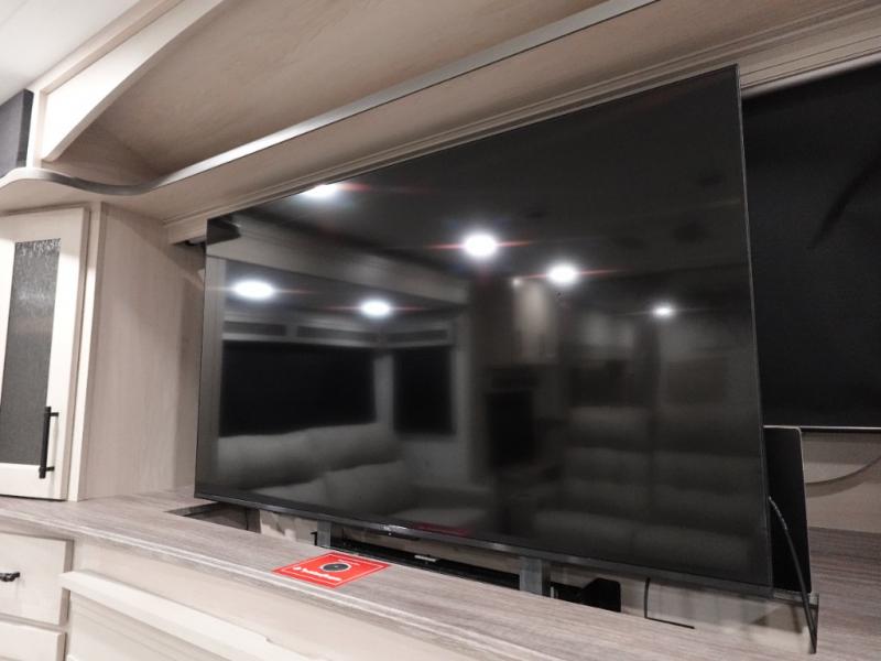 Five slide outs, a full bathroom with dual sinks, a half bath off of the kitchen, and a separate front living room and entertainment area are a few reasons you will enjoy your time spent in this fifth wheel! The separate kitchen is a dream with stainless steel appliances including a built-in oven, a pantry and hutch with counter space, a kitchen island plus a free-standing dinette slide with windows for great views. The entertainment center offers an LED Smart TV with a fireplace below and storage, and the dual opposing tri-fold sofas provide added sleeping space at night. The master bedroom includes a private bed plus space savings sliding doors that lead you to the rear full bathroom with dual sinks, linen storage, and washer/dryer prep. The exterior has several storage choices as well including a pass-through compartment for fishing poles and such, plus the unique sliding tray in the rear allows you to bring along larger items such as camping tables, portable grills, golf clubs, totes and more.