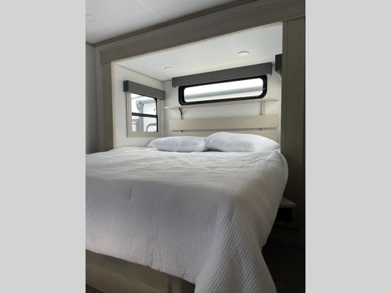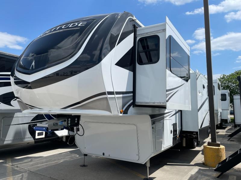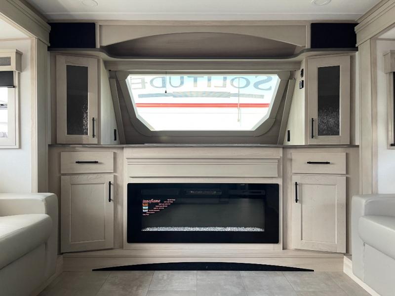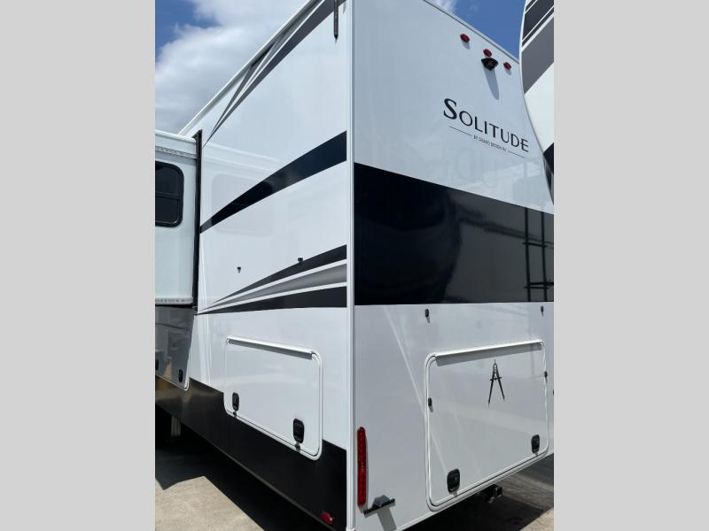 Each Solitude fifth wheel by Grand Design features a 101" wide-body construction, heavy duty 8,000 lb. axles, frameless tinted windows, and high-gloss gel coat sidewalls. You can camp year around thanks to the Weather-Tek Package that includes a 35K BTU high-capacity furnace, an all-in-one enclosed and heated utility center, and a fully enclosed underbelly with heated tanks and storage. Inside, you'll love the premium roller shades, hardwood cabinet doors, solid surface countertops, plus residential finishes throughout to make you truly feel at home. Each model also includes a MORryde CRE3000 suspension system, self adjusting brakes, and a MORryde pin box that will provide smooth towing from home to campground. Affordable luxury is possible with the Solitude fifth wheels; choose yours today!