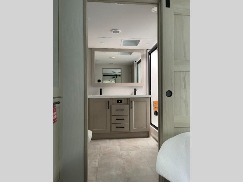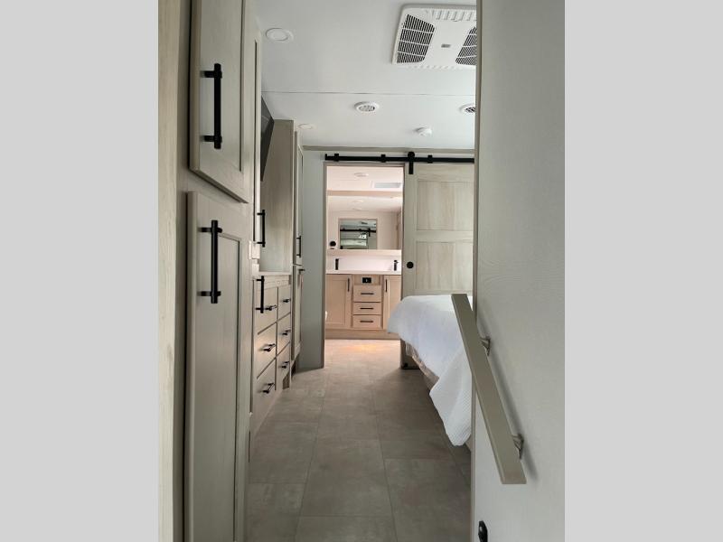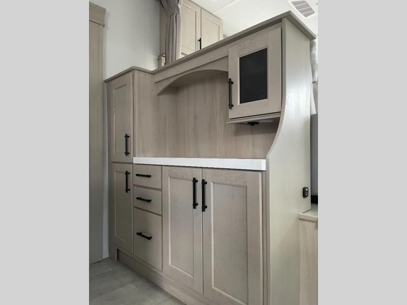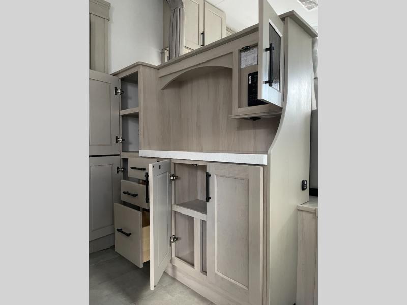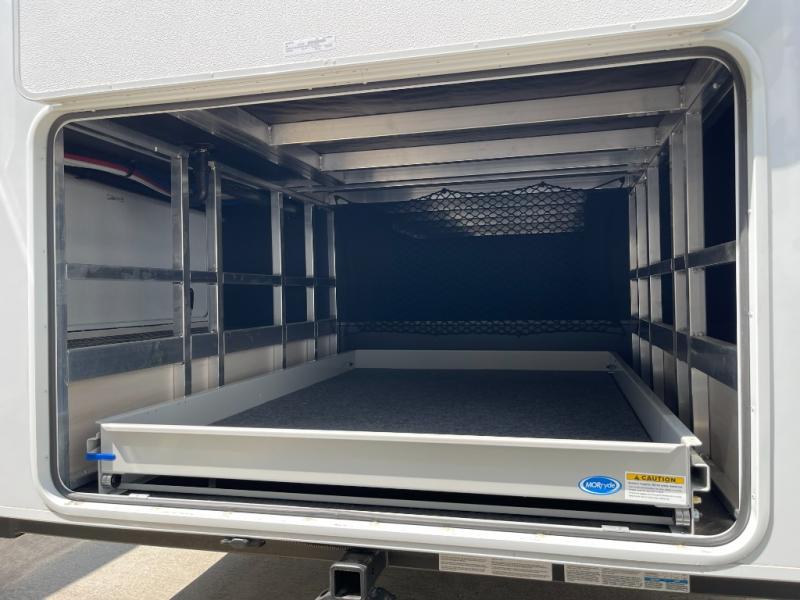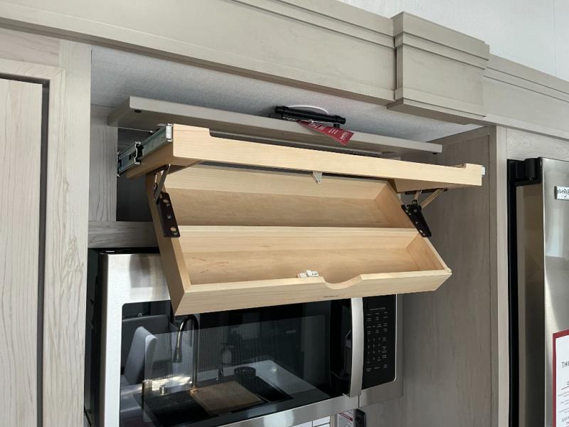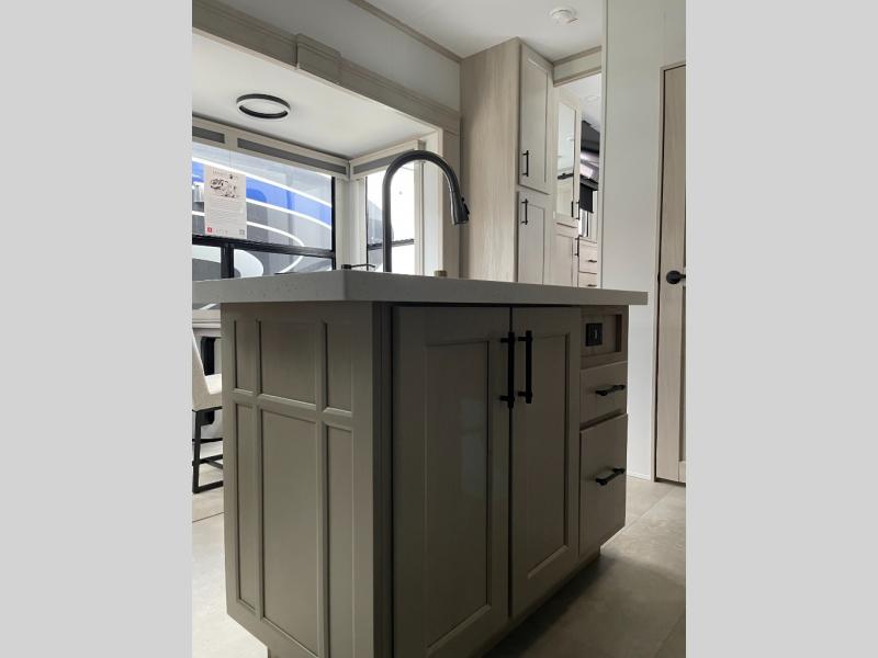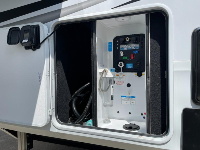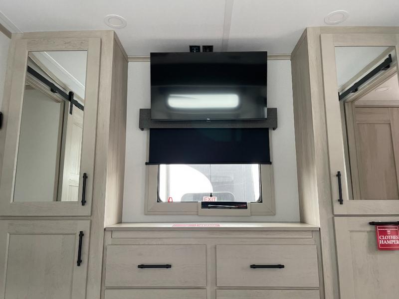 Five slide outs, a full bathroom with dual sinks, a half bath off of the kitchen, and a separate front living room and entertainment area are a few reasons you will enjoy your time spent in this fifth wheel! The separate kitchen is a dream with stainless steel appliances including a built-in oven, a pantry and hutch with counter space, a kitchen island plus a free-standing dinette slide with windows for great views. The entertainment center offers an LED Smart TV with a fireplace below and storage, and the dual opposing tri-fold sofas provide added sleeping space at night. The master bedroom includes a queen bed plus space savings sliding doors that lead you to the rear full bathroom with dual sinks, linen storage, and washer/dryer prep. The exterior has several storage choices as well including a pass-through compartment for fishing poles and such, plus the unique sliding tray in the rear allows you to bring along larger items such as camping tables, portable grills, golf clubs, totes and more.