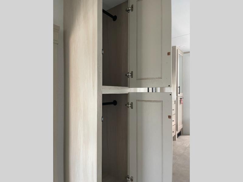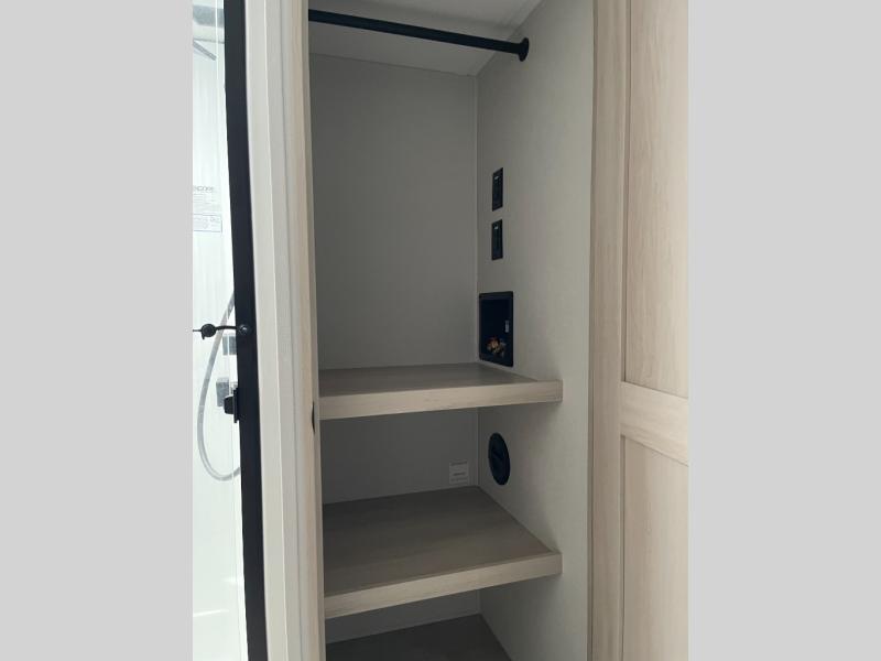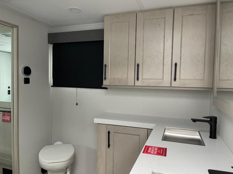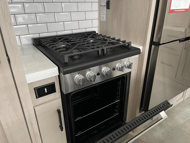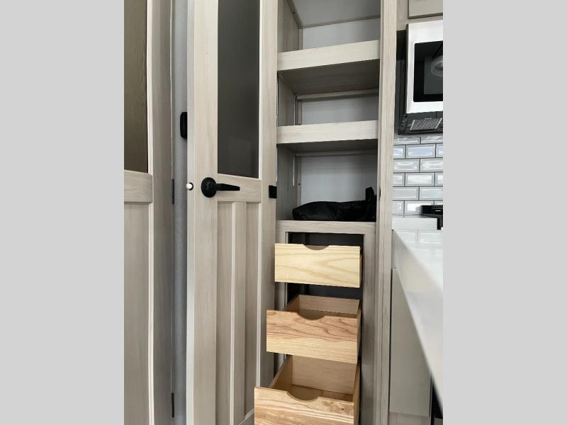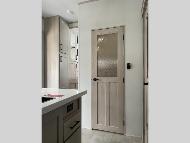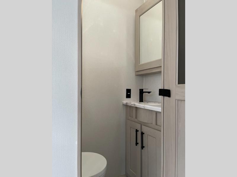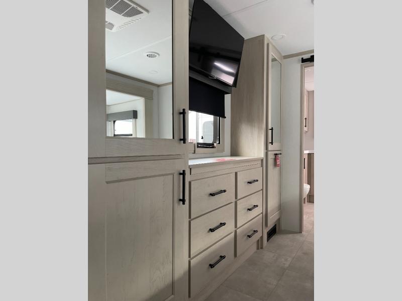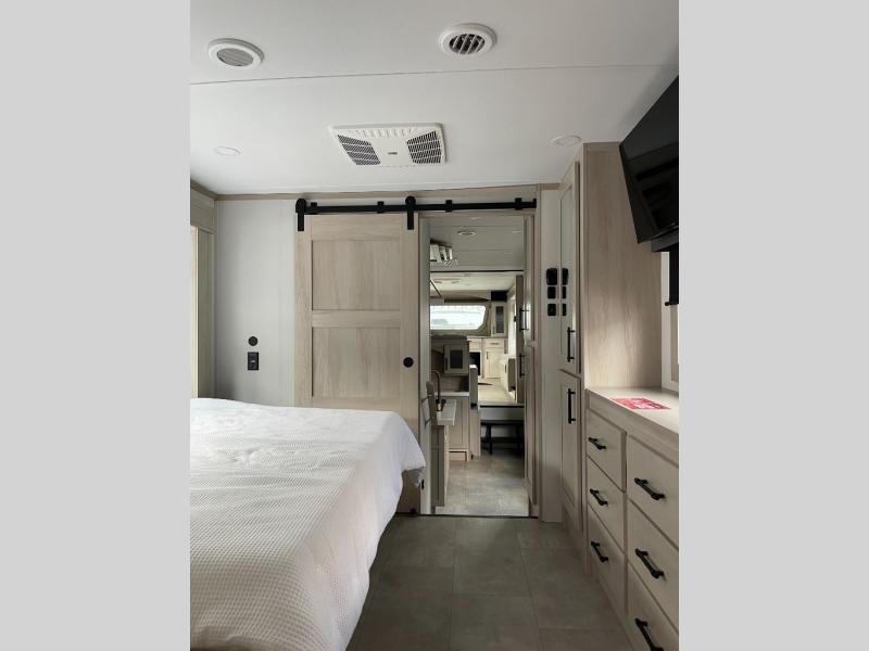Five slide outs, a full bathroom with dual sinks, a half bath off of the kitchen, and a separate front living room and entertainment area are a few reasons you will enjoy your time spent in this fifth wheel! The separate kitchen is a dream with stainless steel appliances including a built-in oven, a pantry and hutch with counter space, a kitchen island plus a free-standing dinette slide with windows for great views. The entertainment center offers an LED Smart TV with a fireplace below and storage, and the dual opposing tri-fold sofas provide added sleeping space at night. The master bedroom includes a queen bed plus space savings sliding doors that lead you to the rear full bathroom with dual sinks, linen storage, and washer/dryer prep. The exterior has several storage choices as well including a pass-through compartment for fishing poles and such, plus the unique sliding tray in the rear allows you to bring along larger items such as camping tables, portable grills, golf clubs, totes and more.