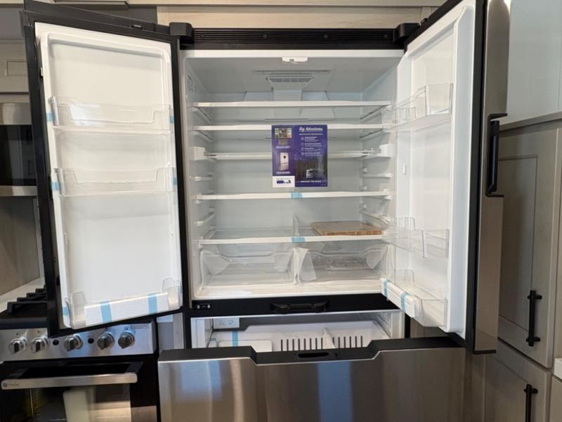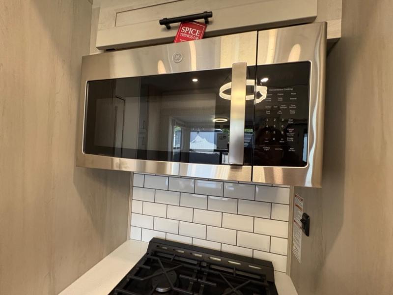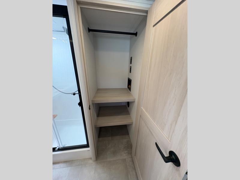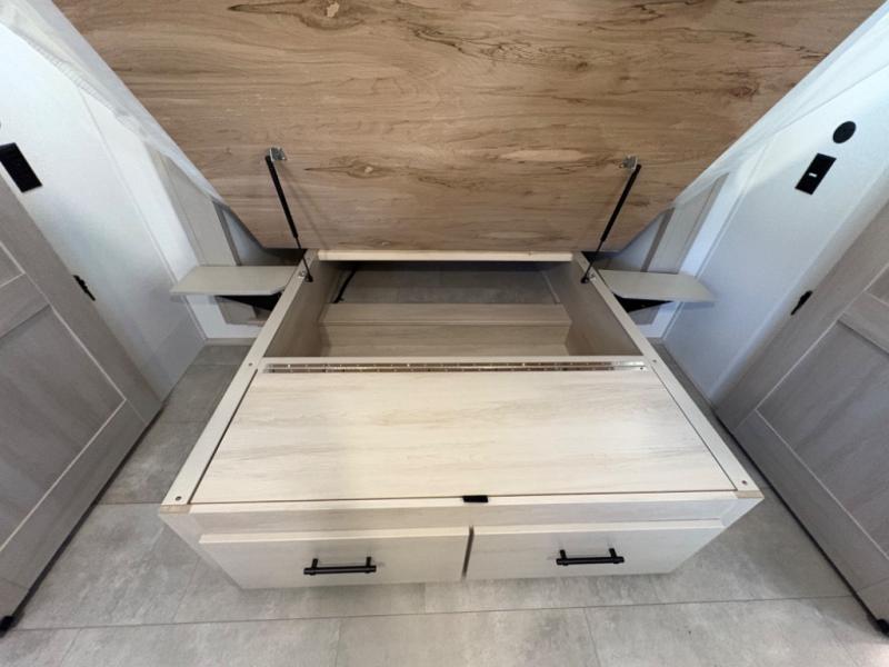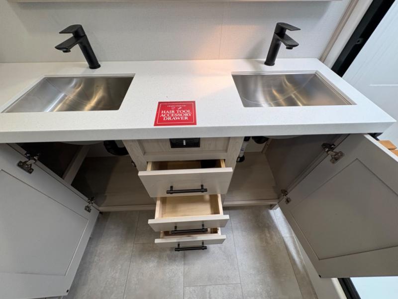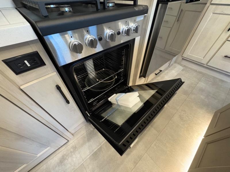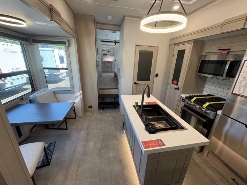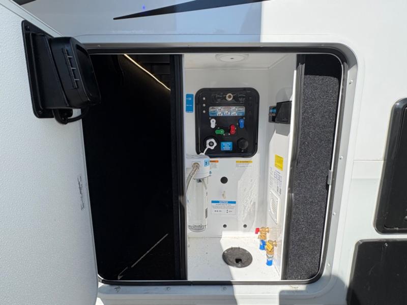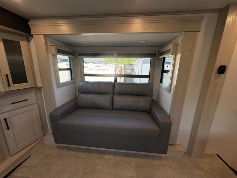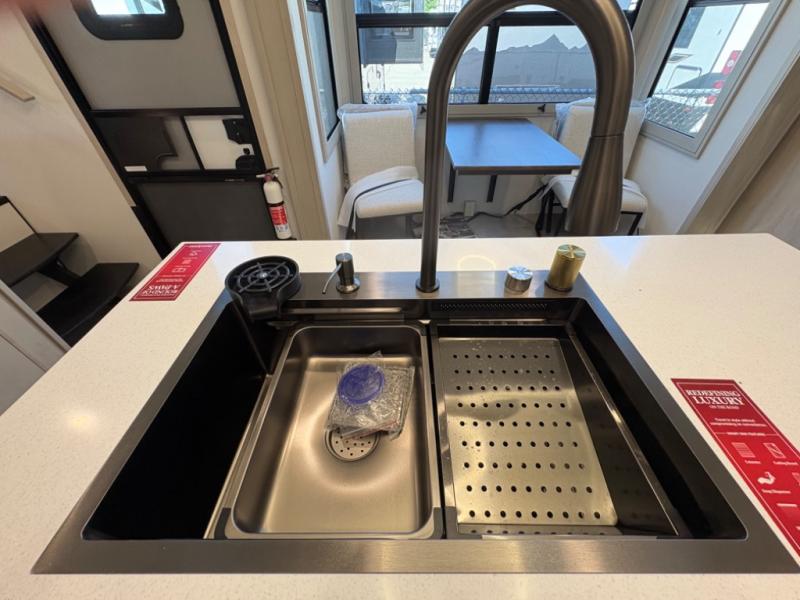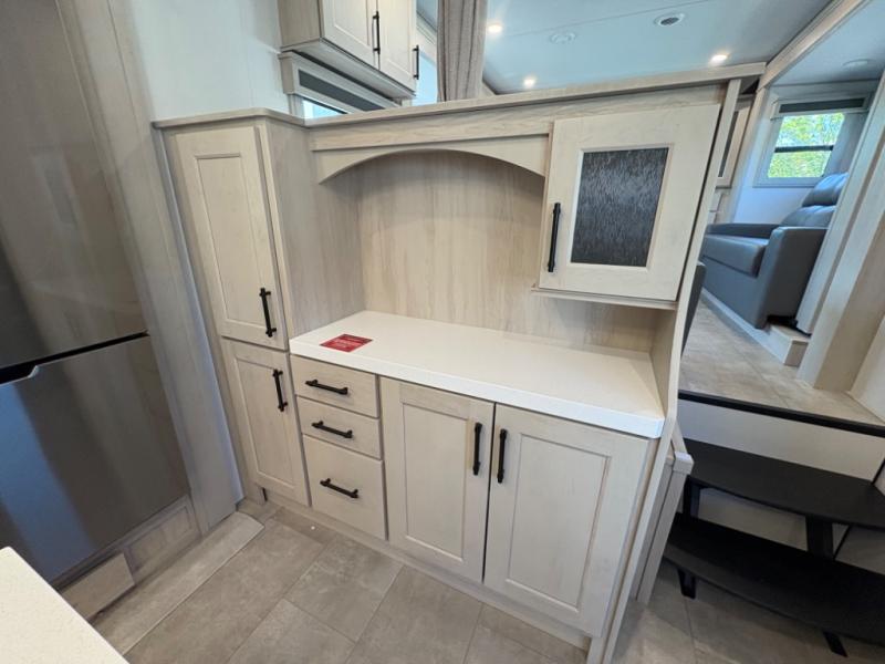Five slide outs, a full bathroom with dual sinks, a half bath off of the kitchen, and a separate front living room and entertainment area are a few reasons you will enjoy your time spent in this fifth wheel! The separate kitchen is a dream with stainless steel appliances including a built-in oven, a pantry and hutch with counter space, a kitchen island plus a free-standing dinette slide with windows for great views. The entertainment center offers an LED Smart TV with a fireplace below and storage, and the dual opposing tri-fold sofas provide added sleeping space at night. The master bedroom includes a queen bed plus space savings sliding doors that lead you to the rear full bathroom with dual sinks, linen storage, and washer/dryer prep. The exterior has several storage choices as well including a pass-through compartment for fishing poles and such, plus the unique sliding tray in the rear allows you to bring along larger items such as camping tables, portable grills, golf clubs, totes and more.