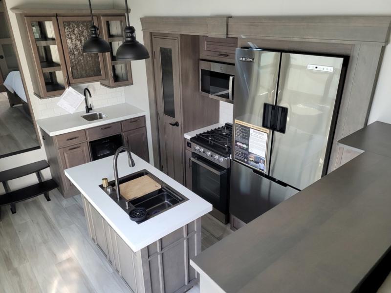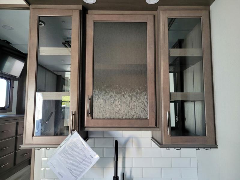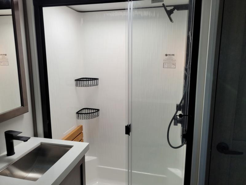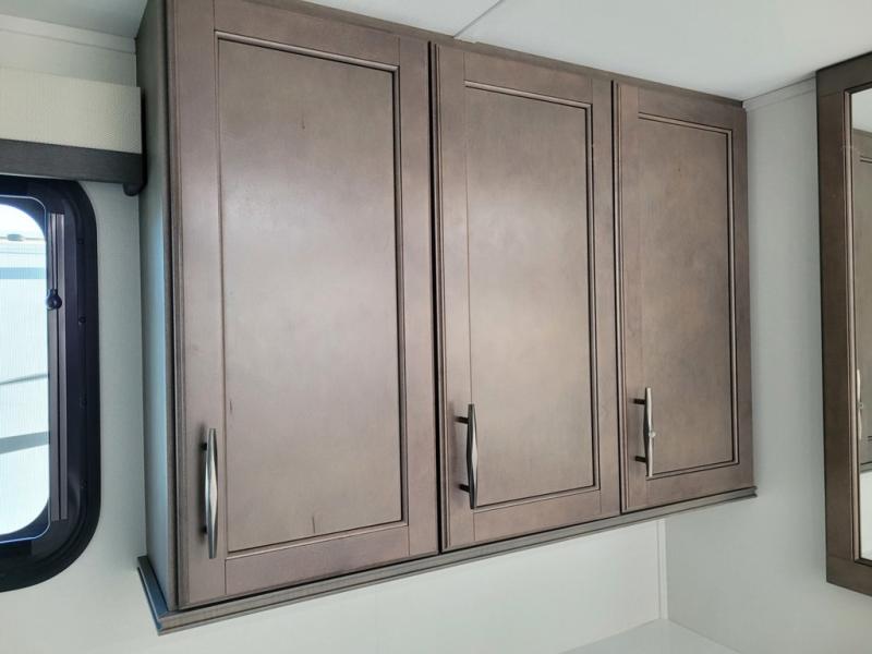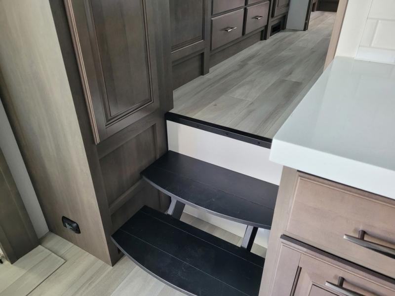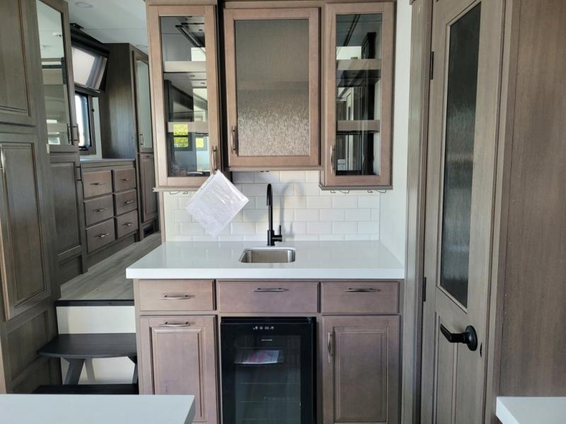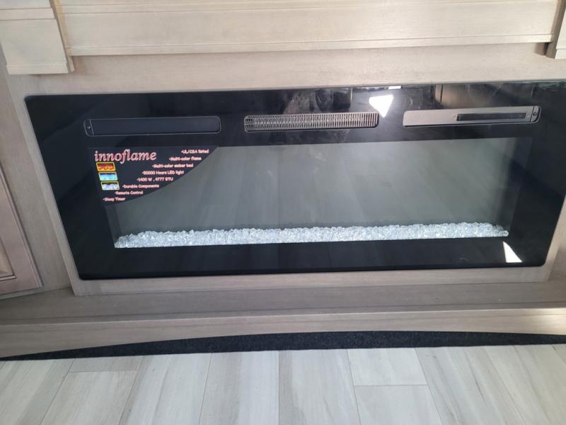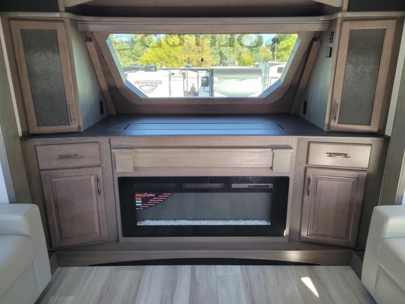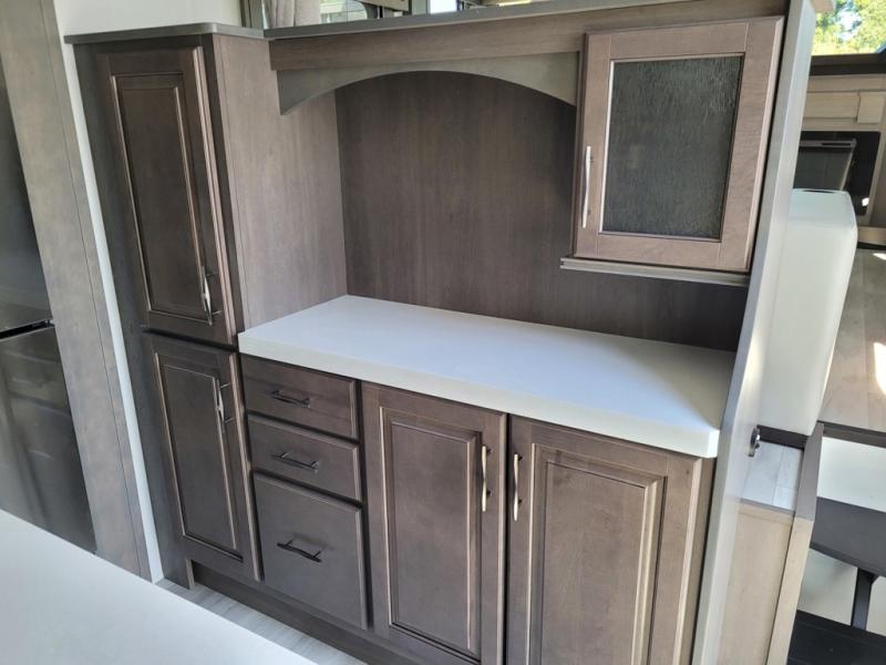 If you enjoy entertaining while camping, you will love this setup with a wet bar including a beverage cooler, a kitchen island to set snacks on, and a hutch for storing dishes. And, the gourmet kitchen appliances with a built-in oven along with a 20 cu. ft. refrigerator allow you to cook any meal for your family and friends. The separate front living room is spacious with dual opposing tri-fold sofa slides and theater seating, and a front wall with an LED telescoping TV and fireplace below plus storage for entertaining. You will have your own master bedroom with a queen bed slide, wardrobes, plus sliding doors that lead into the private master bath. Here you will find dual sinks, a shower with a seat, plus washer/dryer prep which is great for when you plan to stay awhile.