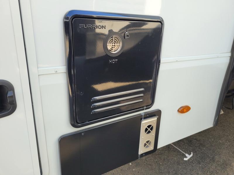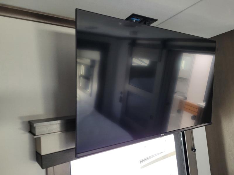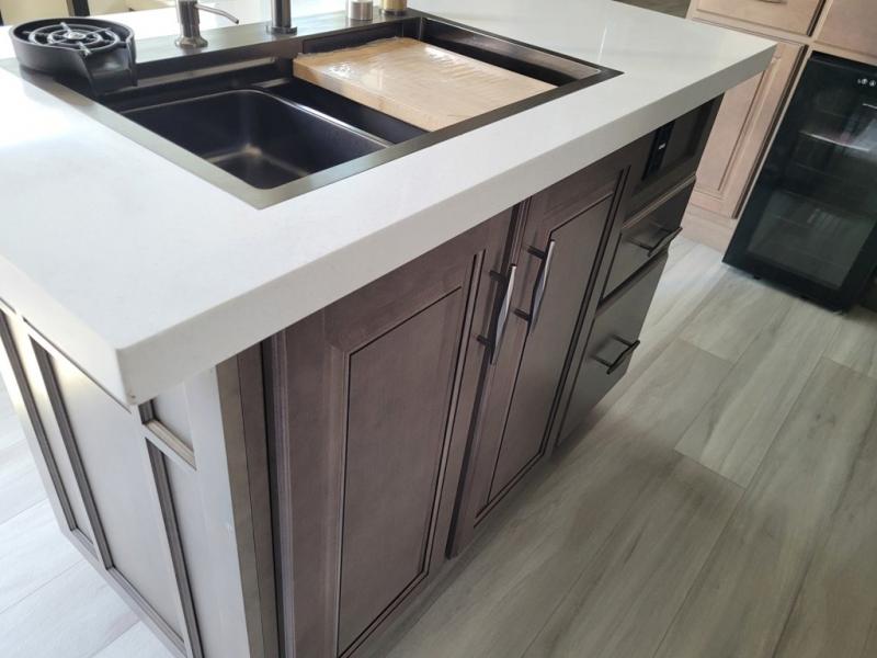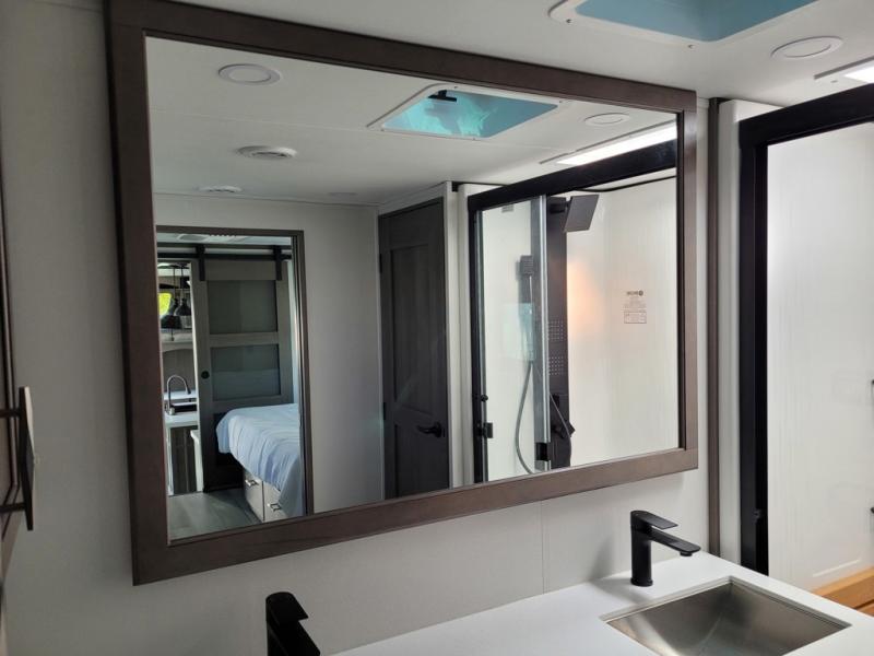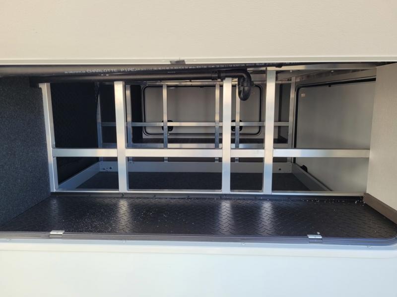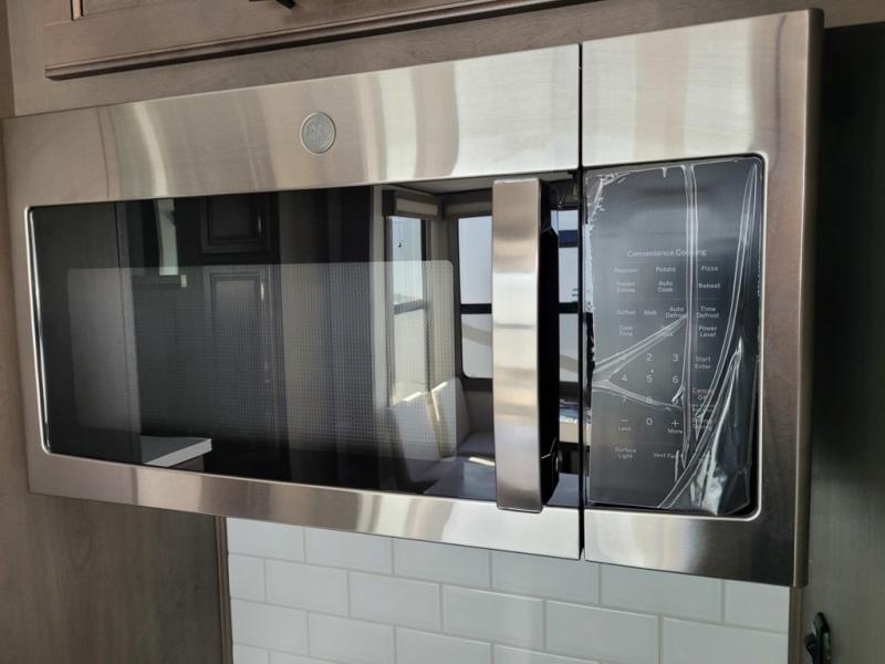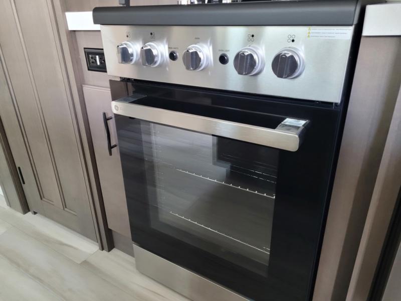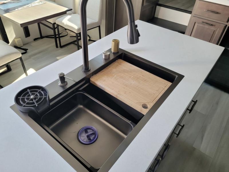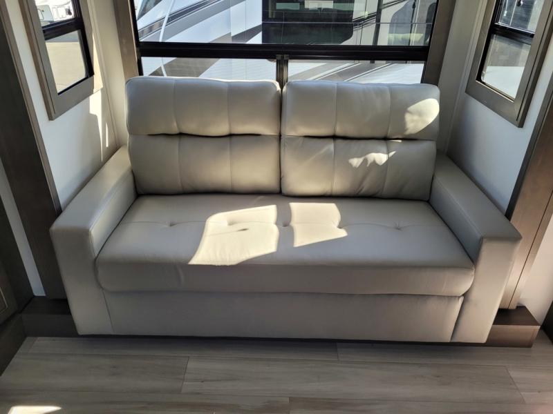 If you enjoy entertaining while camping, you will love this setup with a wet bar including a beverage cooler, a kitchen island to set snacks on, and a hutch for storing dishes. And, the gourmet kitchen appliances with a built-in oven along with a 20 cu. ft. refrigerator allow you to cook any meal for your family and friends. The separate front living room is spacious with dual opposing tri-fold sofa slides and theater seating, and a front wall with an LED telescoping TV and fireplace below plus storage for entertaining. You will have your own master bedroom with a queen bed slide, wardrobes, plus sliding doors that lead into the private master bath. Here you will find dual sinks, a shower with a seat, plus washer/dryer prep which is great for when you plan to stay awhile.