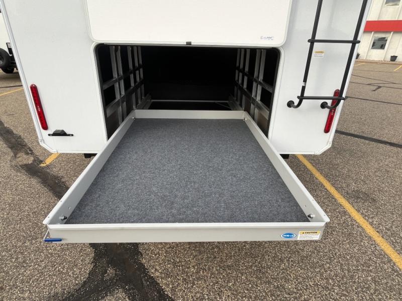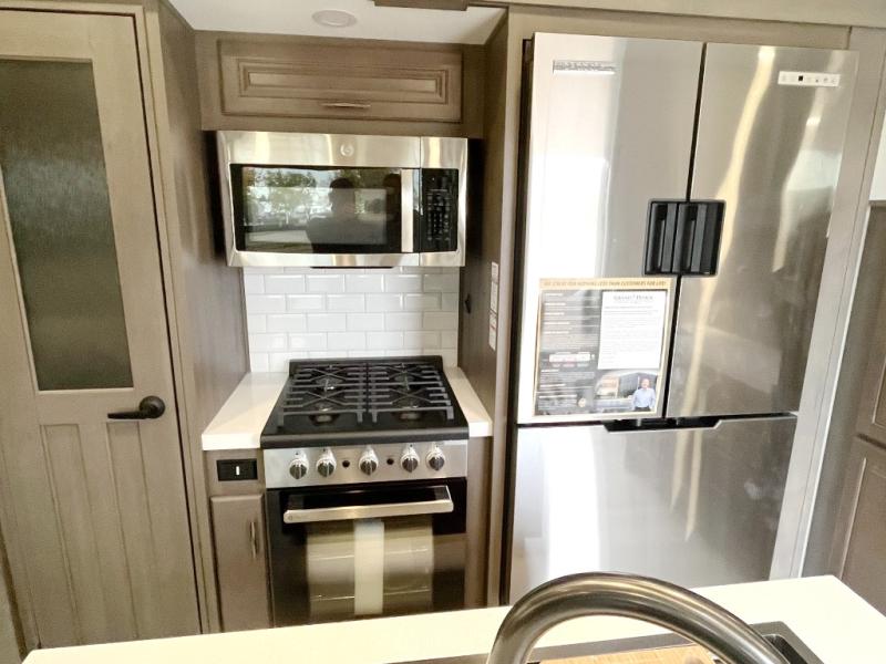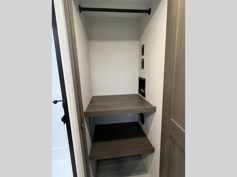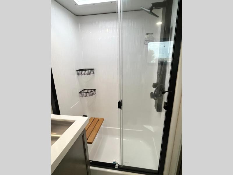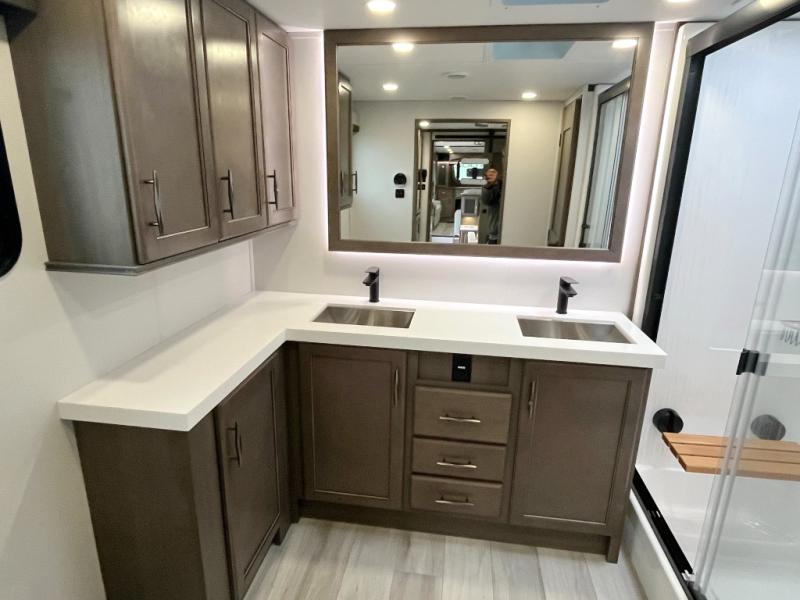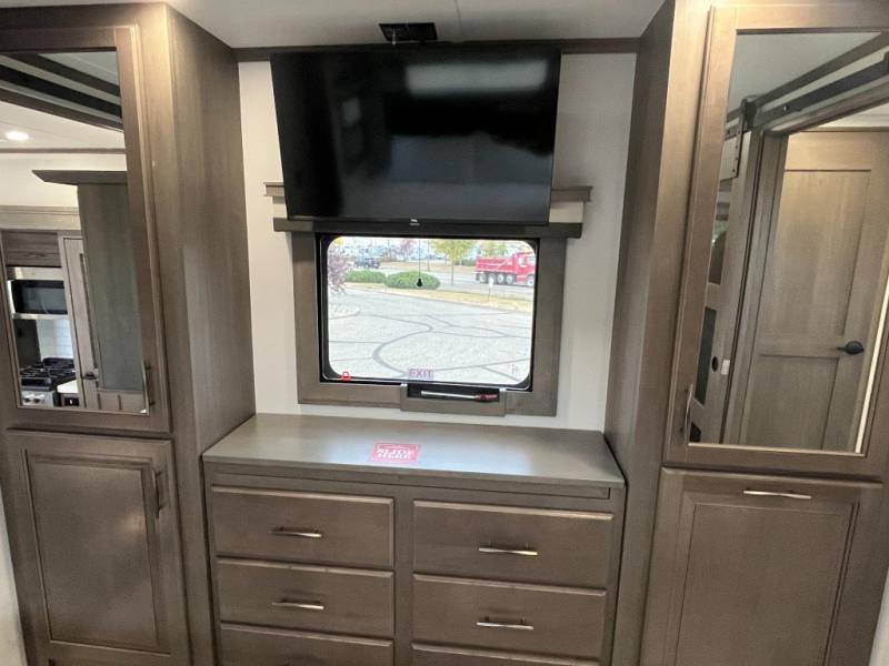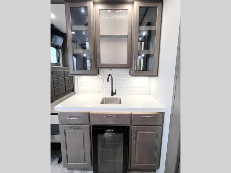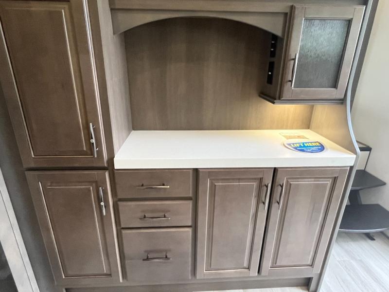 If you enjoy entertaining while camping, you will love this setup with a wet bar including a beverage cooler, a kitchen island to set snacks on, and a hutch for storing dishes. And, the gourmet kitchen appliances with a built-in oven along with a 20 cu. ft. refrigerator allow you to cook any meal for your family and friends. The separate front living room is spacious with dual opposing tri-fold sofa slides and theater seating, and a front wall with an LED telescoping TV and fireplace below plus storage for entertaining. You will have your own master bedroom with a queen bed slide, wardrobes, plus sliding doors that lead into the private master bath. Here you will find dual sinks, a shower with a seat, plus washer/dryer prep which is great for when you plan to stay awhile.