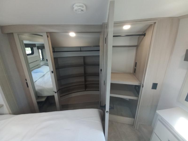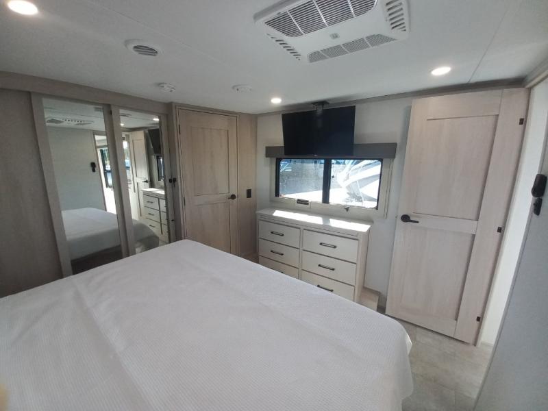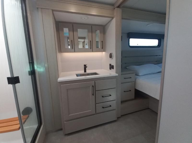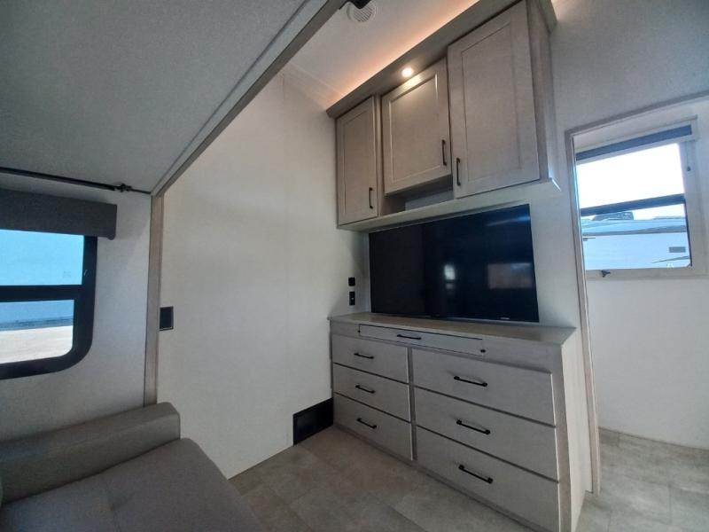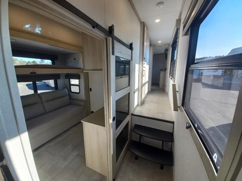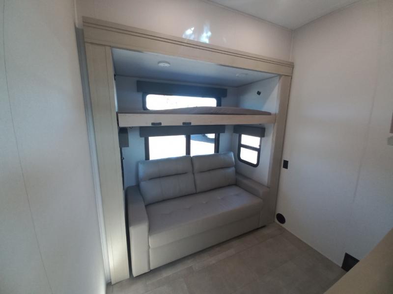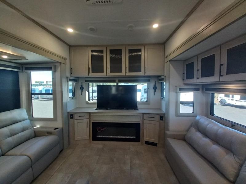 The whole gang will love camping in this spacious fifth wheel for five to six! You'll have your own bedroom up front with a queen bed slide out, a large front closet with a hamper and washer and dryer prep, plus a private entry door into the dual entry bath. Your guest can take the middle bedroom that includes a tri-fold sofa with a bunk above, a dresser/desk, plus a 50" TV for entertainment. A full kitchen includes an L-shaped counter, a 20 cu. ft. refrigerator, pull-out trash cans plus many more convenient features. And don't overlook the rear living area with its L-shaped sofa, theater seating, and free-standing dinette. There is also an entertainment center with a telescoping TV and a fireplace plus an electronics drawer to charge your phone or laptop.