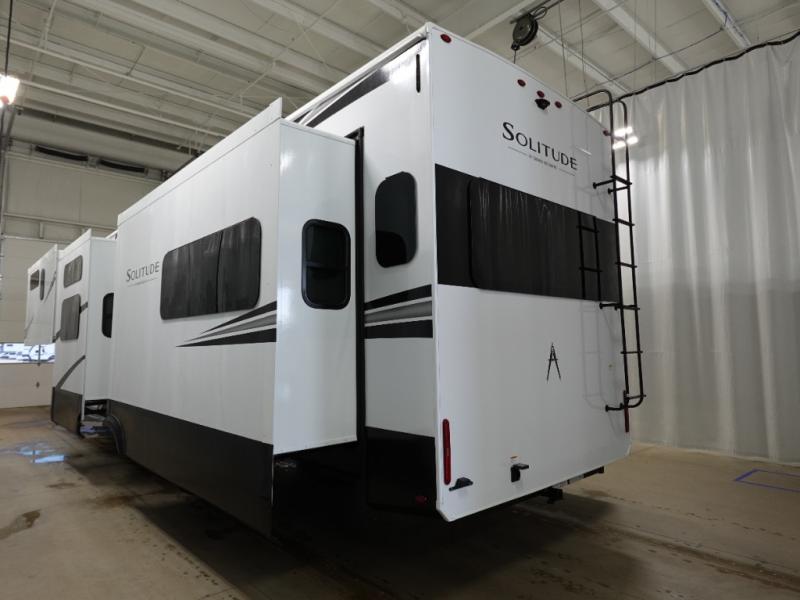 Each Solitude fifth wheel by Grand Design features a 101" wide-body construction, heavy duty 8,000 lb. axles, frameless tinted windows, and high-gloss gel coat sidewalls. You can camp year around thanks to the Weather-Tek Package that includes a 35K BTU high-capacity furnace, an all-in-one enclosed and heated utility center, and a fully enclosed underbelly with heated tanks and storage. Inside, you'll love the premium roller shades, hardwood cabinet doors, solid surface countertops, plus residential finishes throughout to make you truly feel at home. Each model also includes a MORryde CRE3000 suspension system, self adjusting brakes, and a MORryde pin box that will provide smooth towing from home to campground. Affordable luxury is possible with the Solitude fifth wheels; choose yours today!